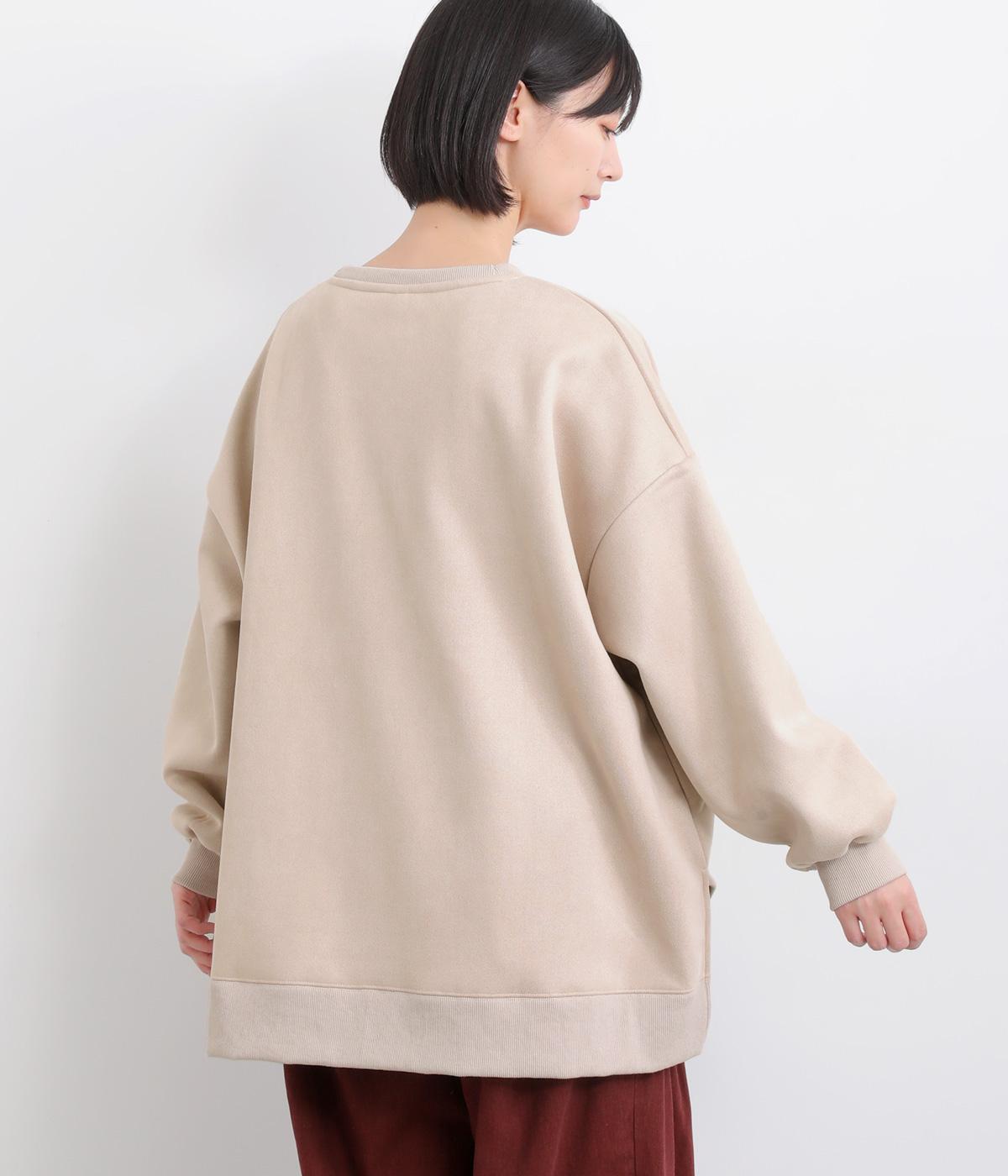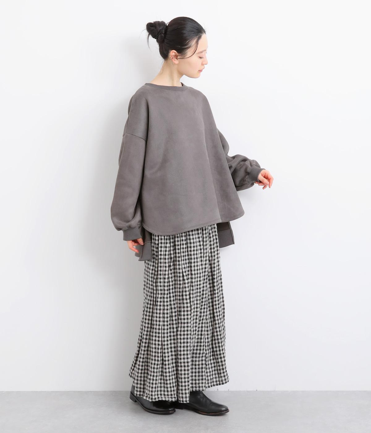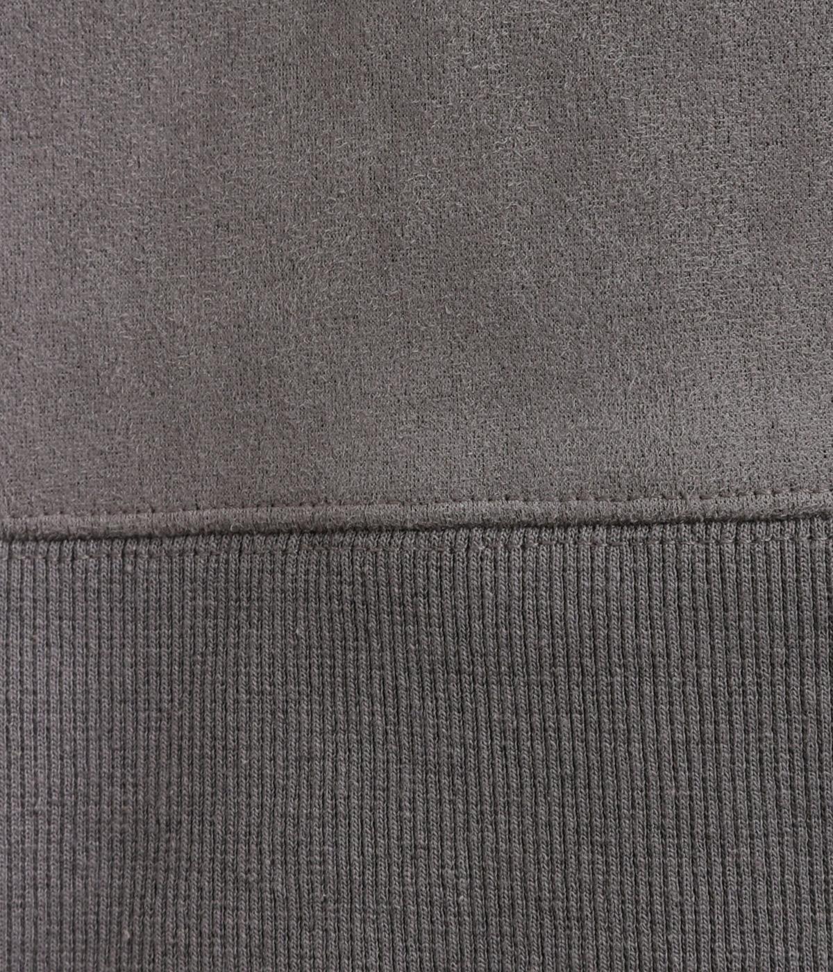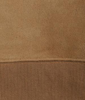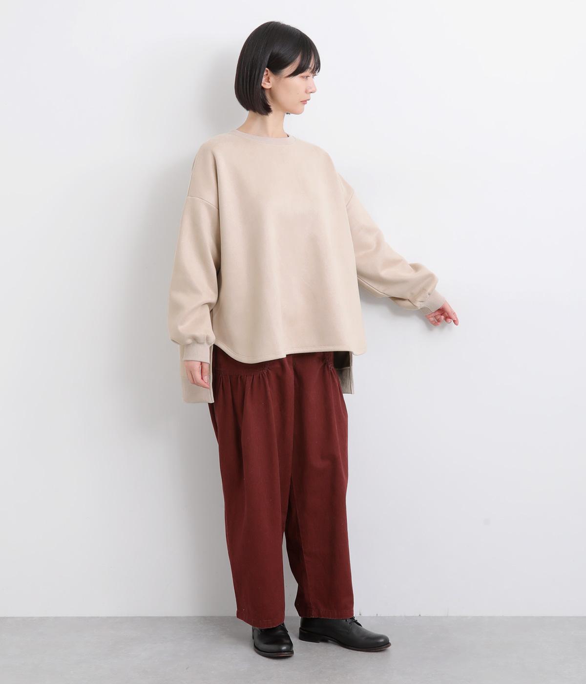 表側はフェイクスエードならではの微起毛がなめらかで、しっとりとした手ざわりが魅力。光の当たり方でやわらかな陰影が生まれ、上品な表情を見せます。裏地には、ふんわりとあたたかなフリースを重ねました。軽さもありつつほどよいハリで、シルエットがきれいにきまる素材です。