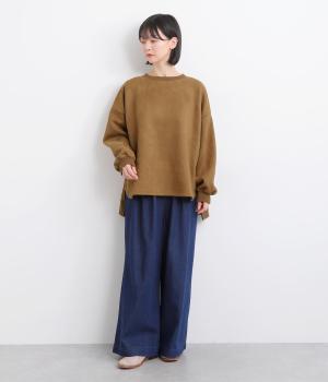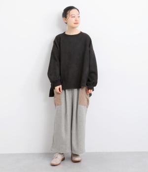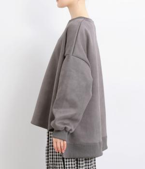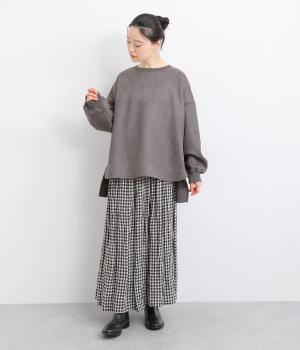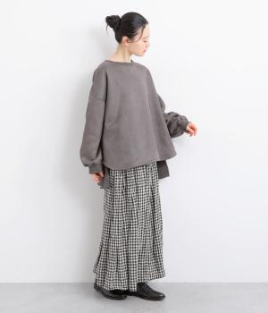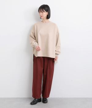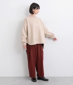 やわらかく落ちる素材感を活かした、フレアラインの広がりが美しいデザインです。袖口に向かってふくらみを持たせたボリューム袖が、シンプルな装いにやさしいニュアンスを添えます。裾の前側はラウンド、後ろはリブで引き締め、丈も前後差をつけてメリハリを持たせました。ゆったり着られるのに存在感がある一着です。