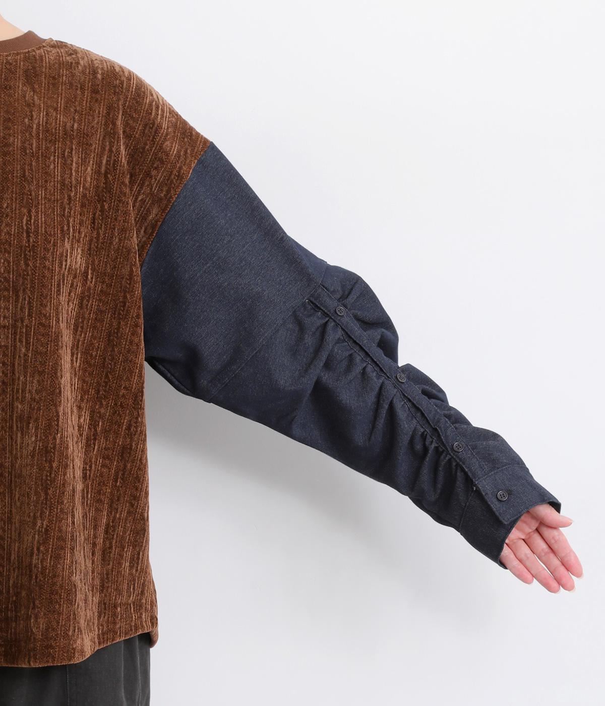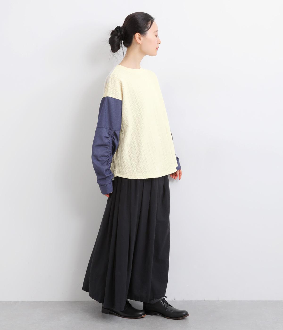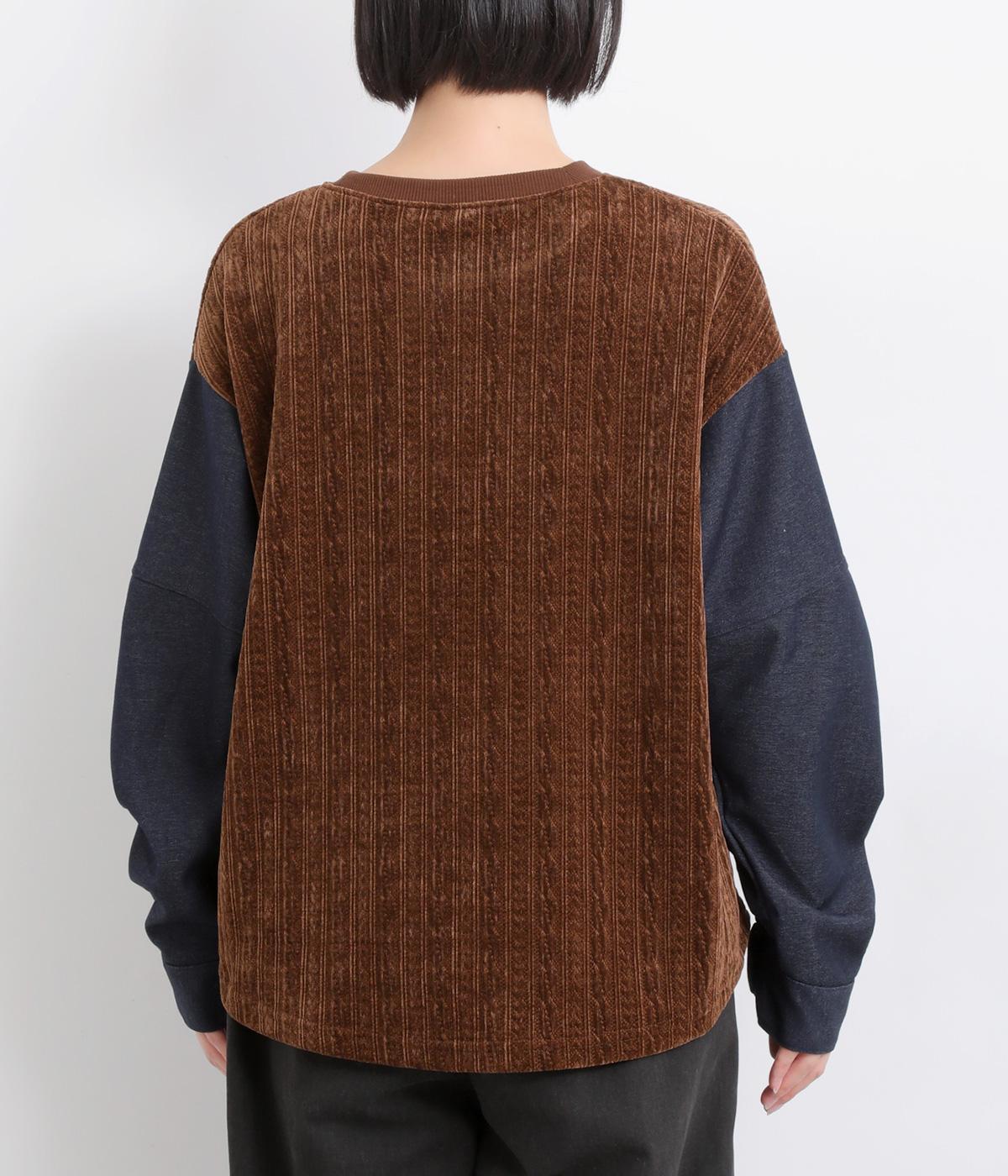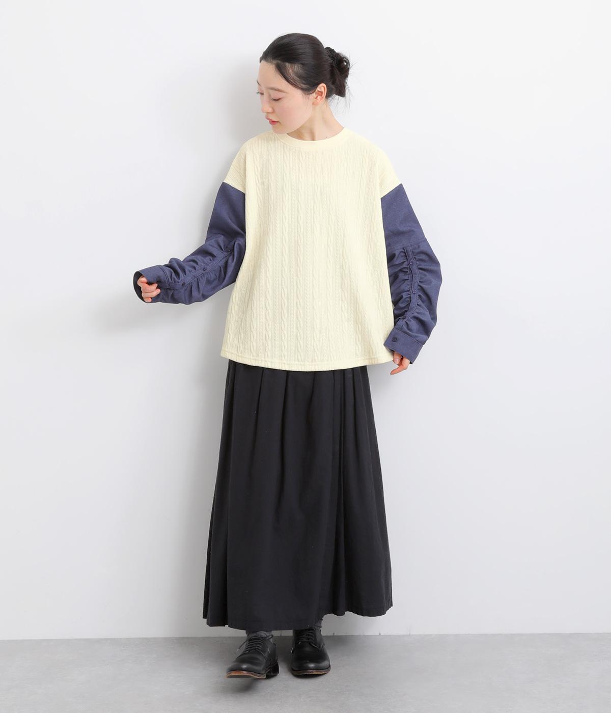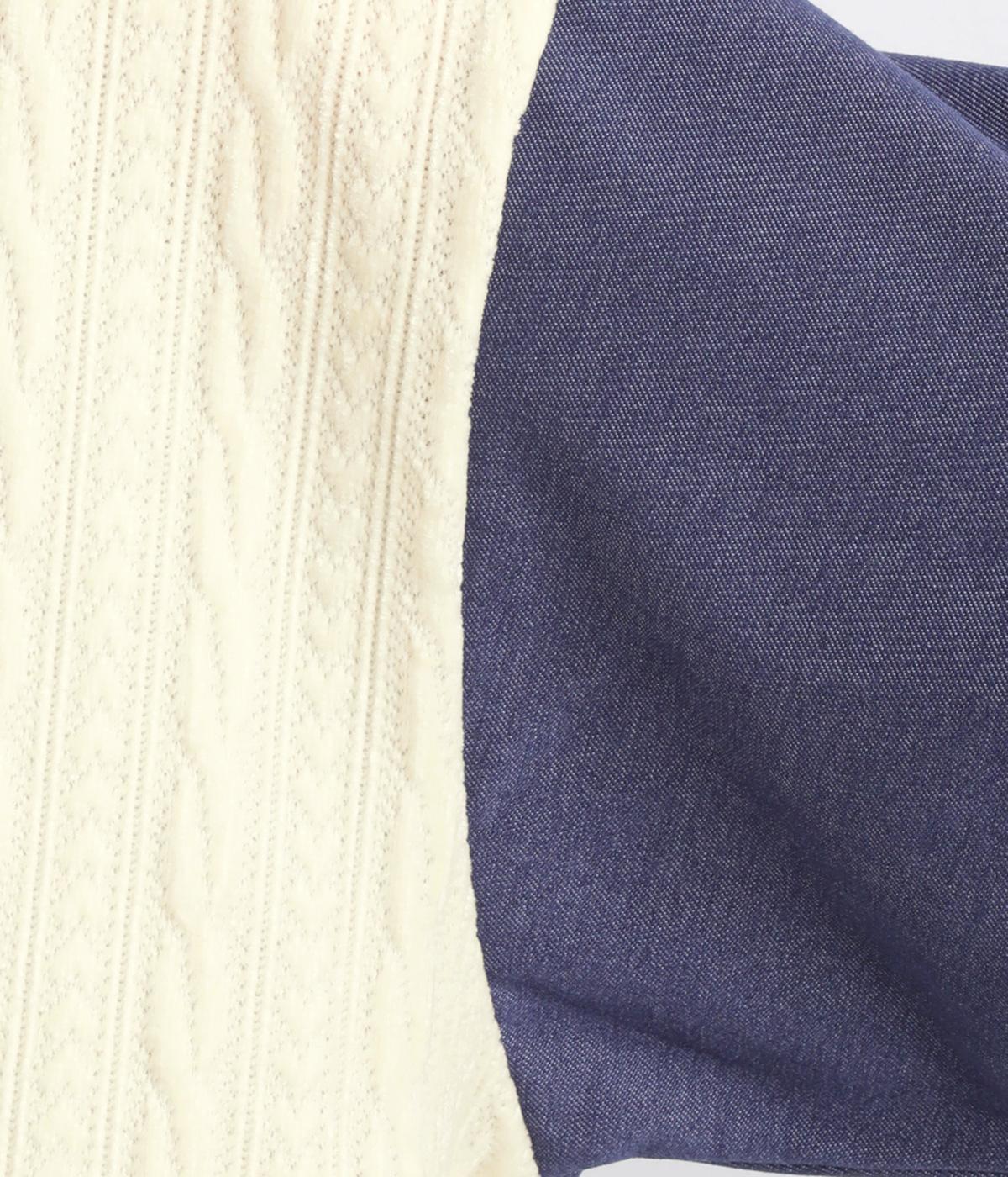 繊細な凹凸が魅力のケーブル編みカットソーは、空気をふくんだようなやさしいタッチ。袖は薄手のインディゴデニム生地を使用し、さらっとした風合いと上品な光沢感が特徴です。