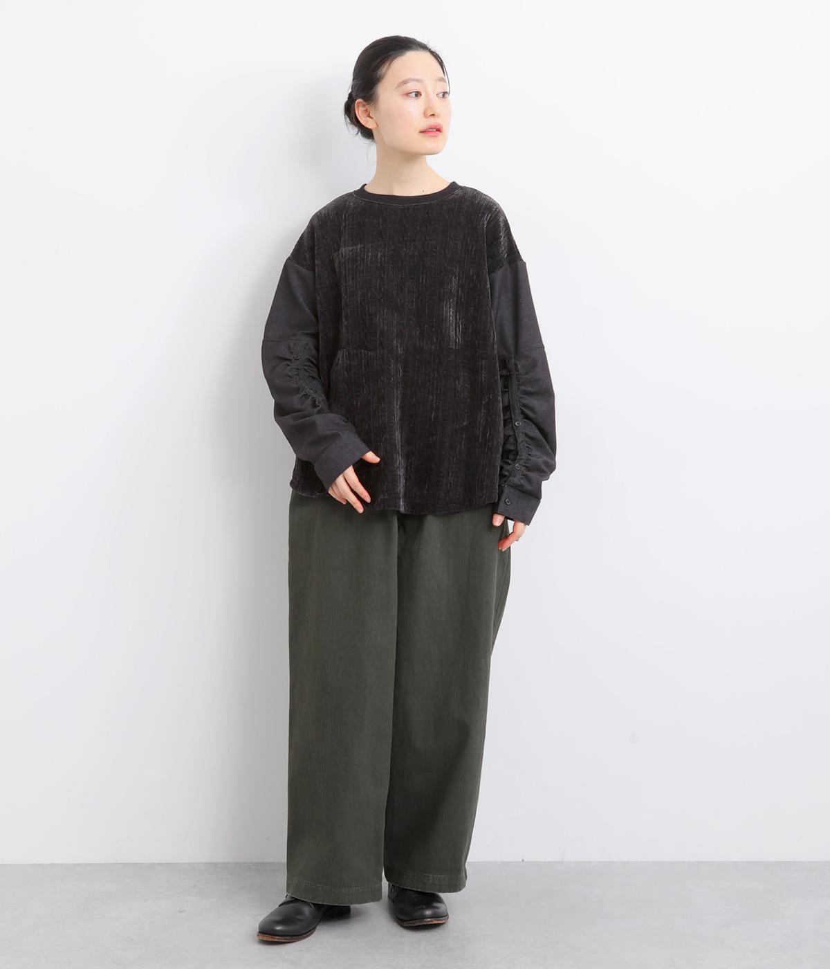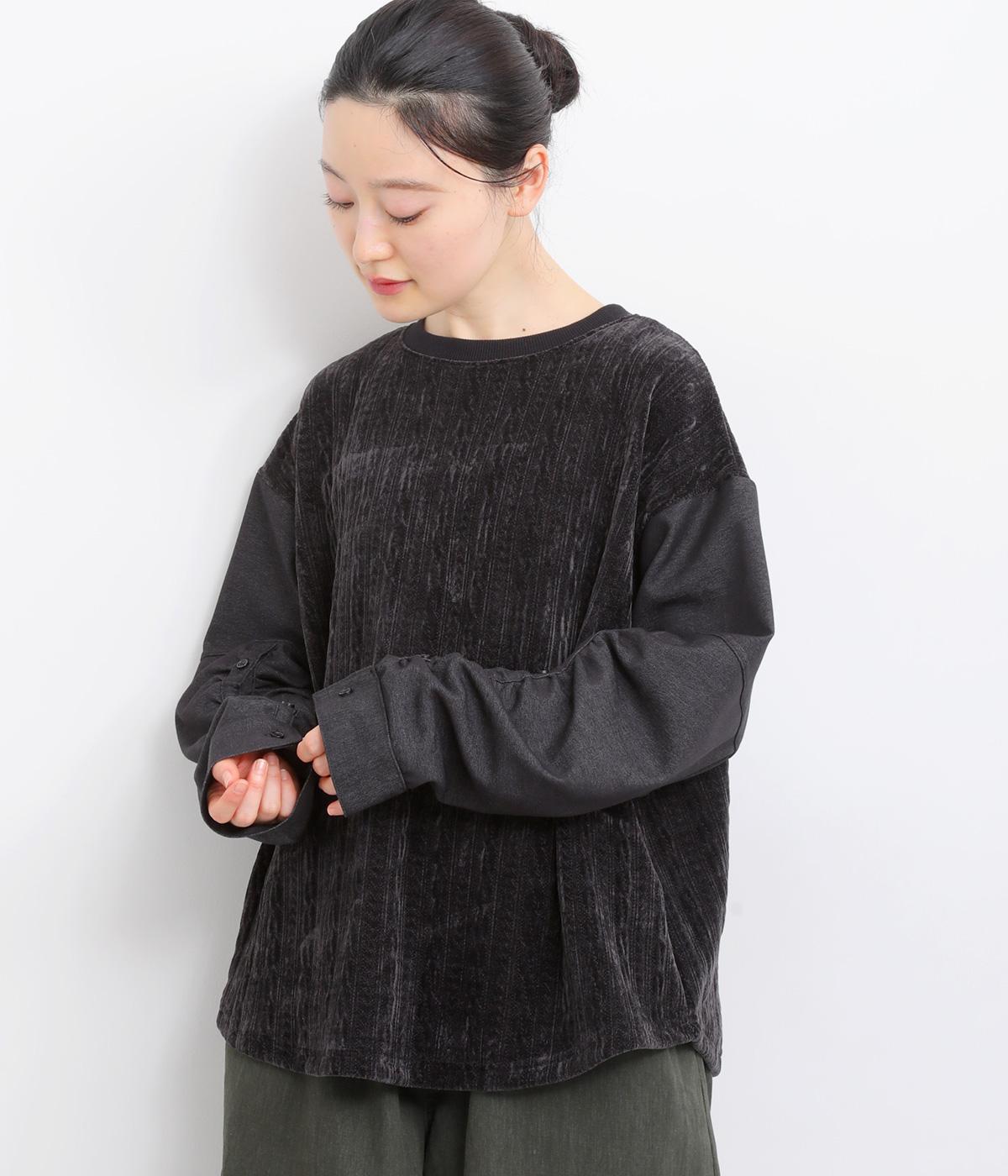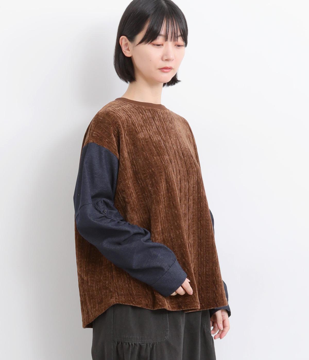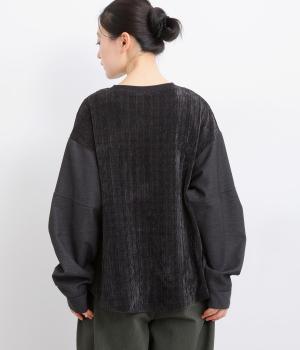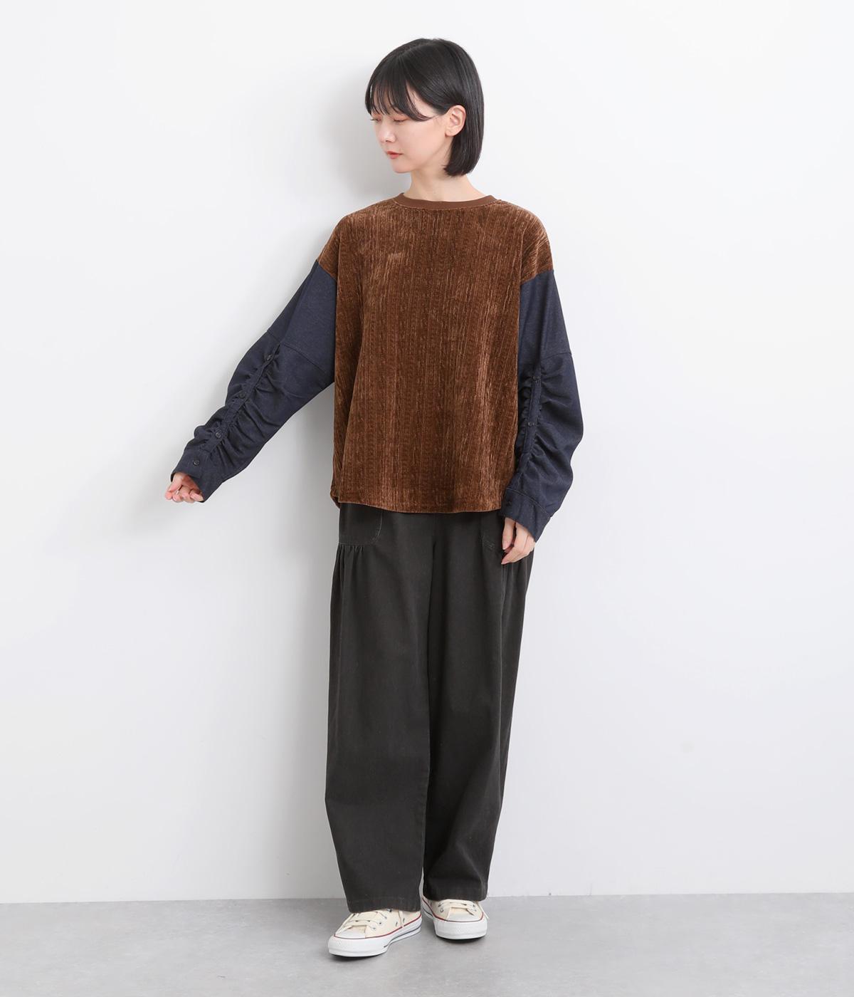 繊細な凹凸が魅力のケーブル編みカットソーは、空気をふくんだようなやさしいタッチ。袖は薄手のインディゴデニム生地を使用し、さらっとした風合いと上品な光沢感が特徴です。