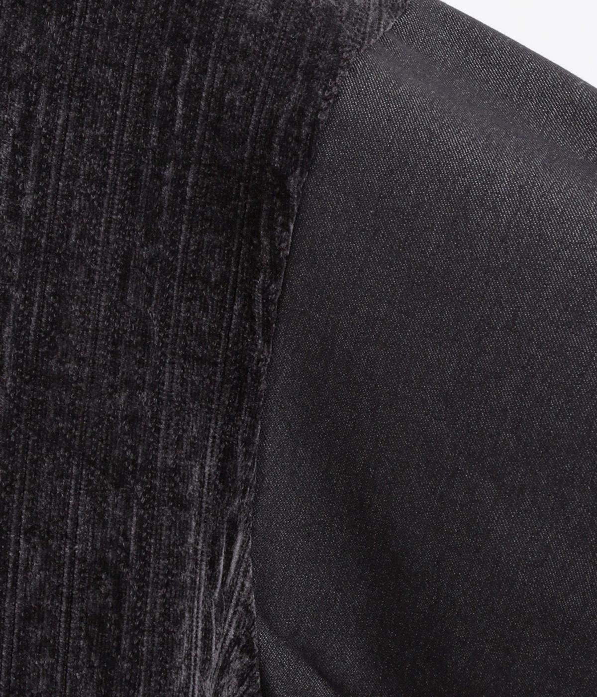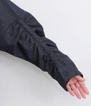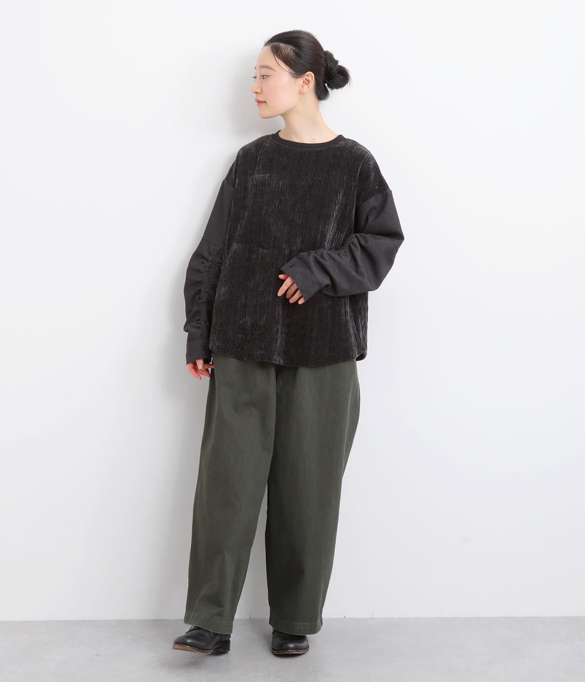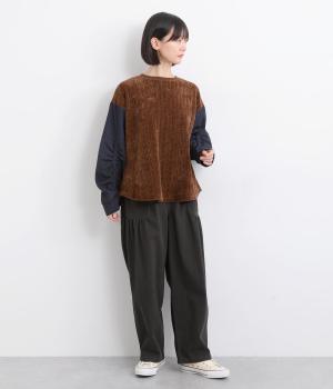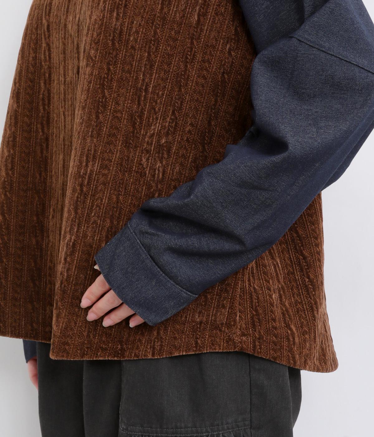 身頃はナチュラルなケーブル編み、袖はデニムの異素材で切り替え、一枚でレイヤードしたような奥行きを演出しました。ボタンを添えた袖のギャザーが自然なドレープを生み出し、女性らしいやわらかなシルエットに。ゆったりとしたサイズ感で着心地も◎。着るだけでコーディネートの主役になる一枚です。