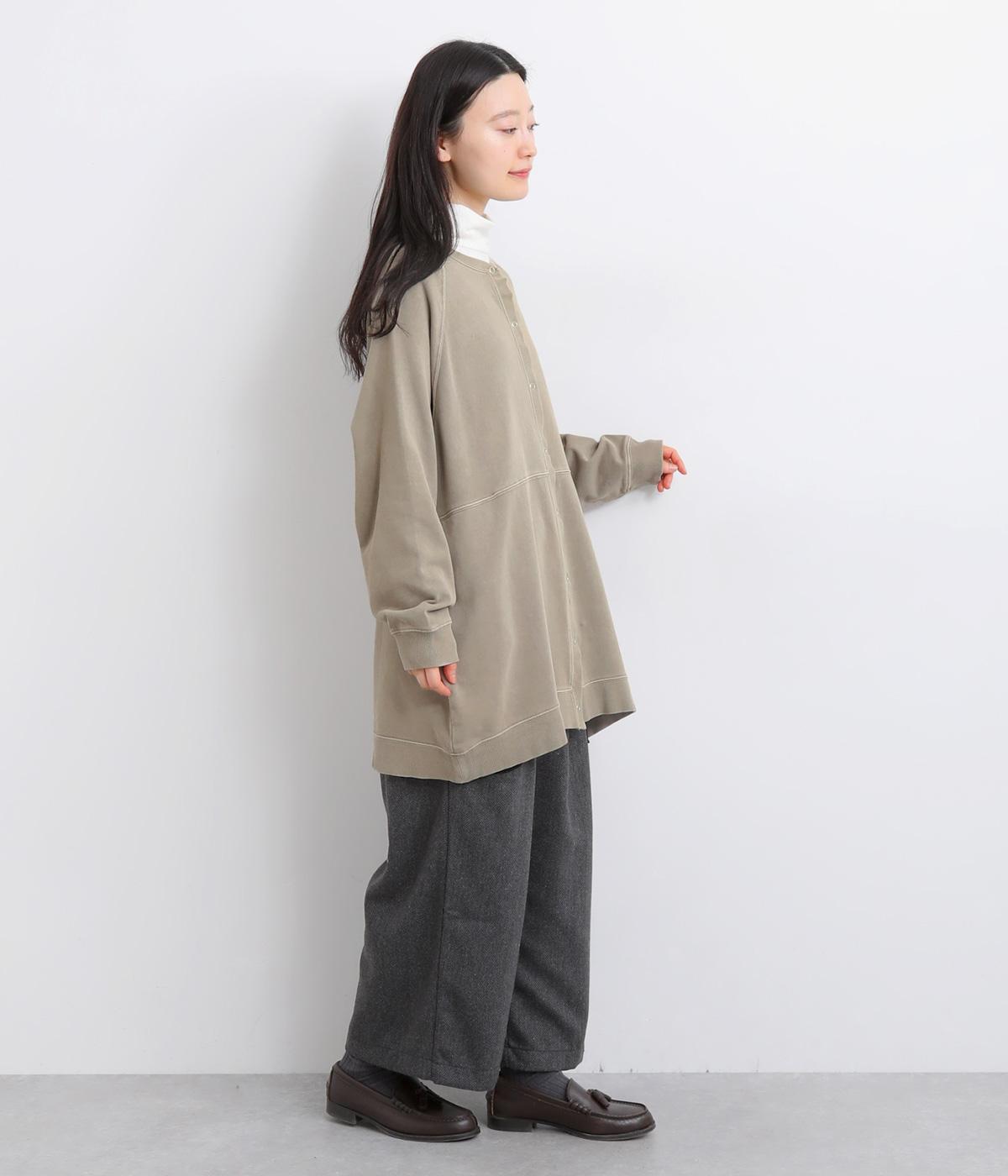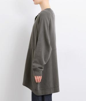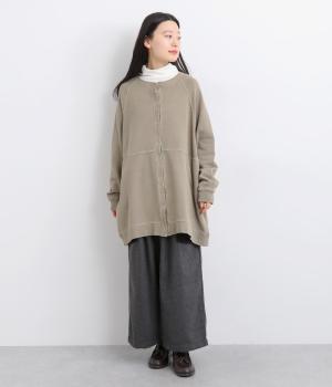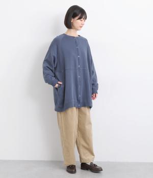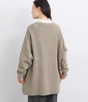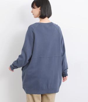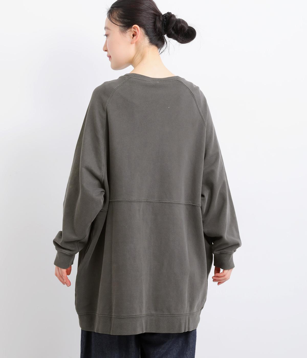 ラグランスリーブで肩の落ち感を美しく見せつつ、自然な丸みが際立つゆったりとしたシルエット。身頃には切り替えが入り、シンプルさのなかに奥行きのある表情を生み出します。裾リブは締めつけ感が少ないので、スカートやワンピースと重ねたときも収まりがよく、着まわしやすい一枚です。