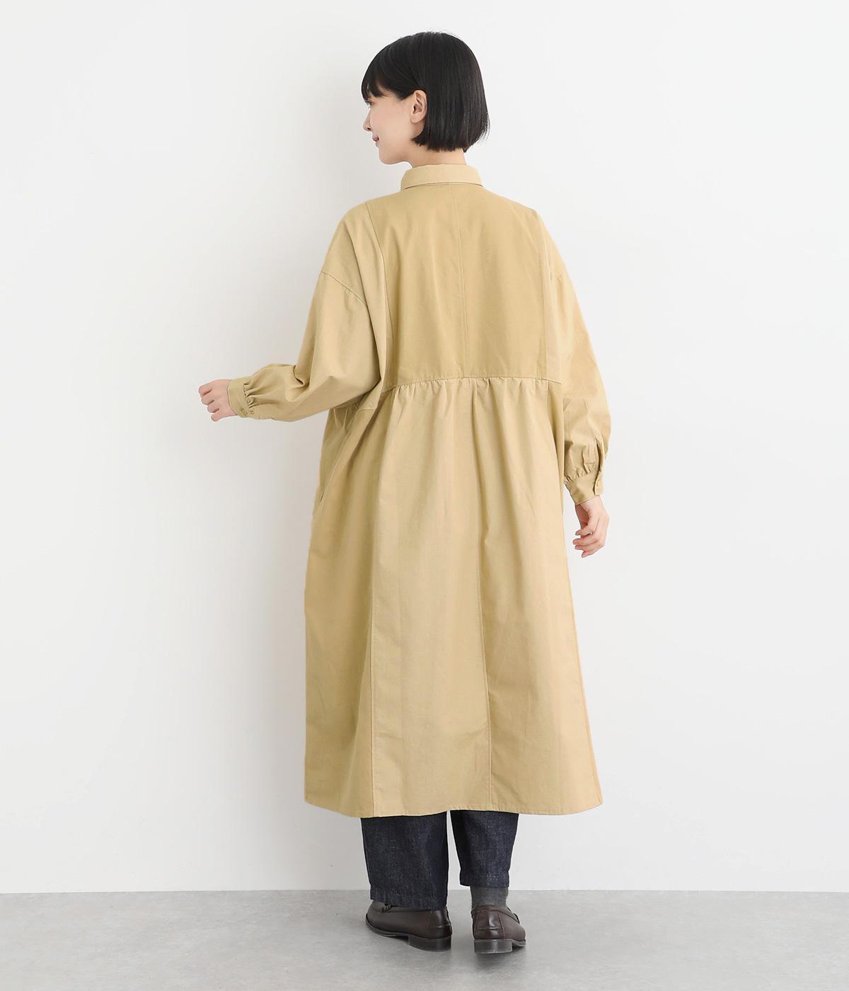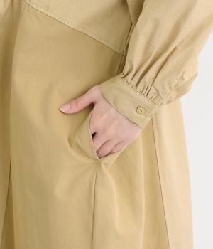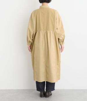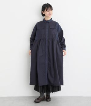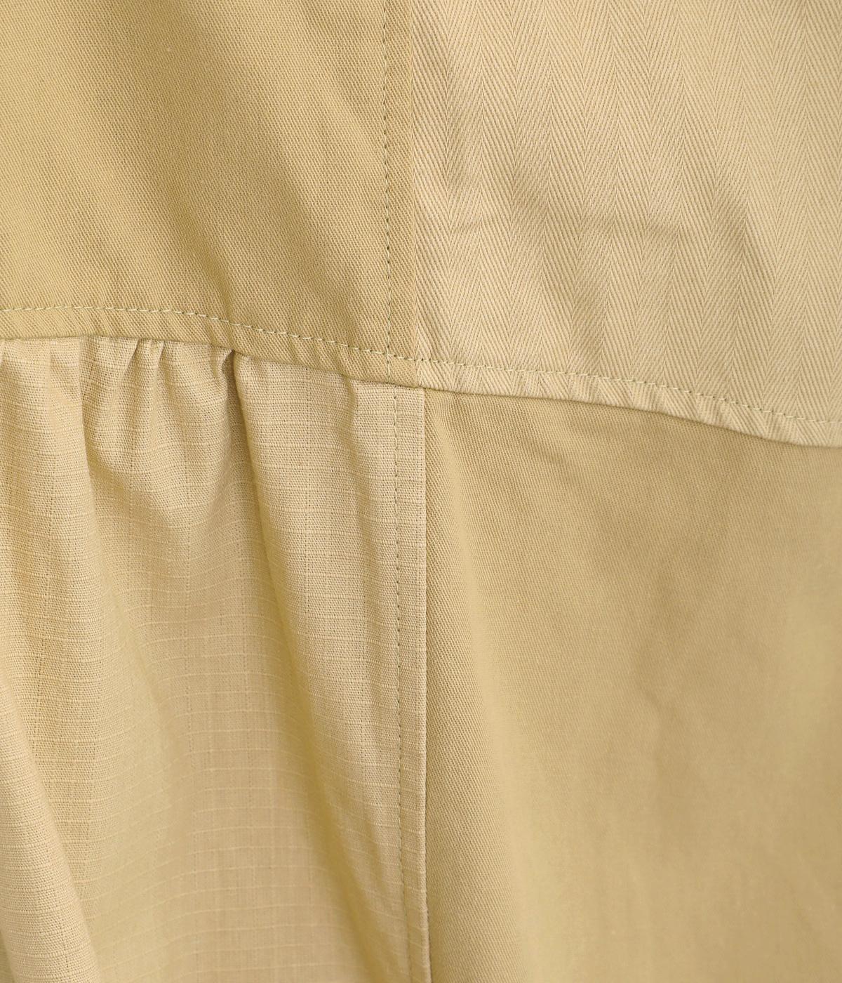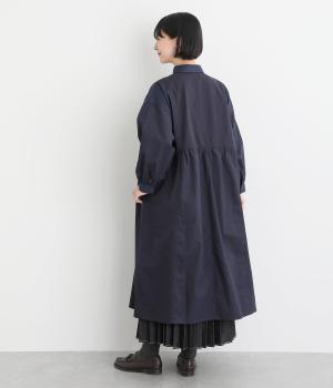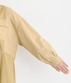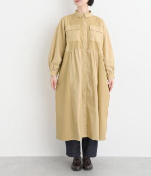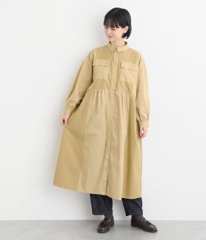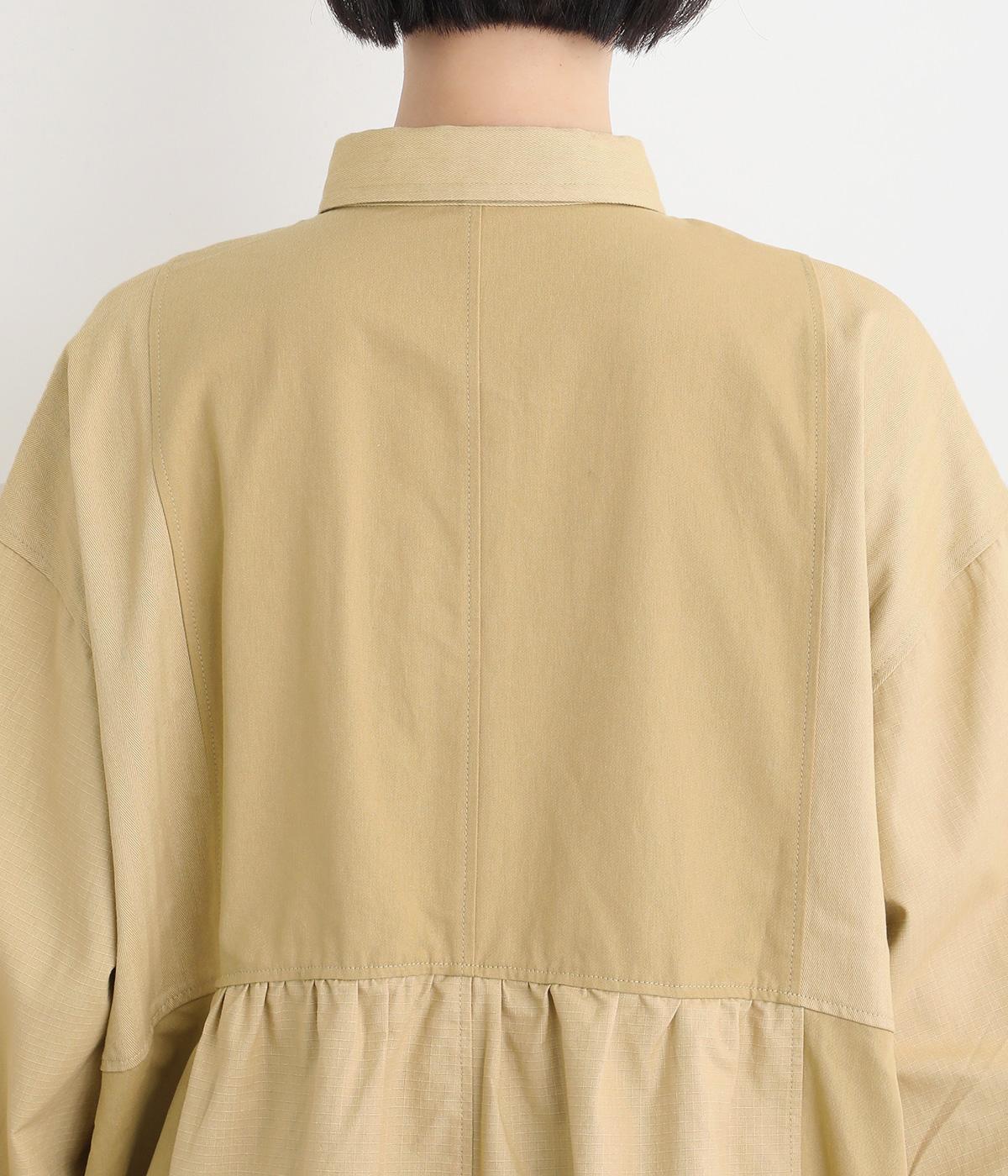 ワークテイストな生地を用いながらも、切り替えギャザーのフレアシルエットで可愛らしい要素も加えました。ワンピース使いはもちろん、ライトアウターとしても着まわせる便利な一枚。大きめのフラップポケットもポイントです。