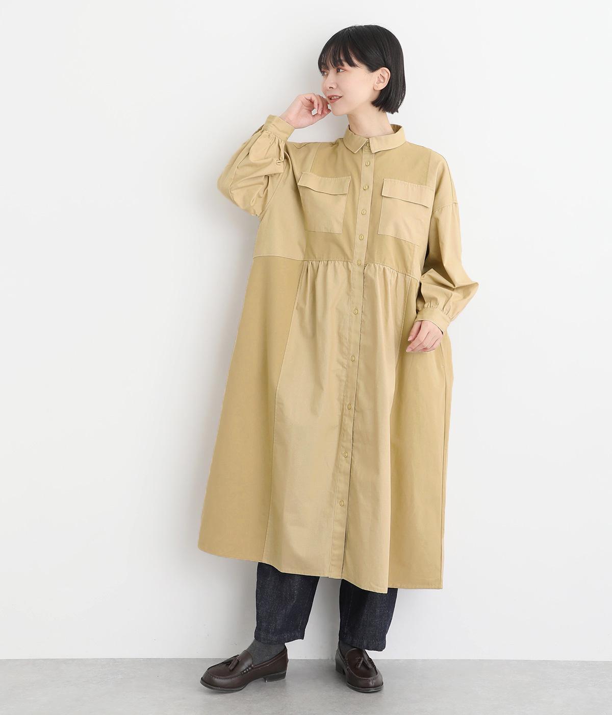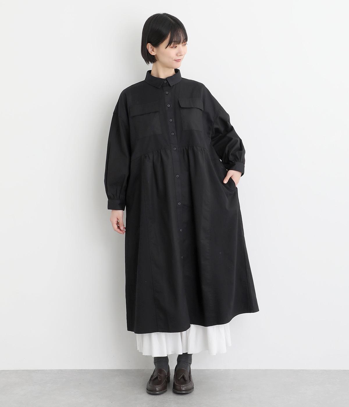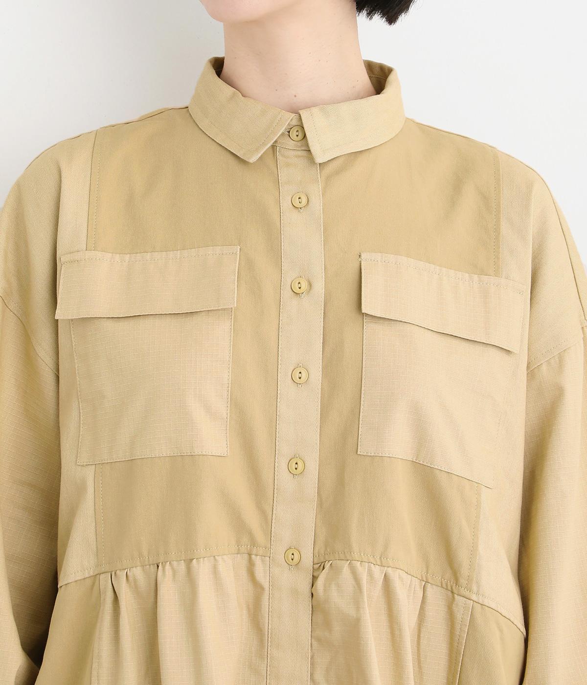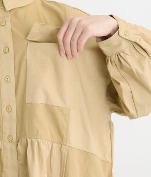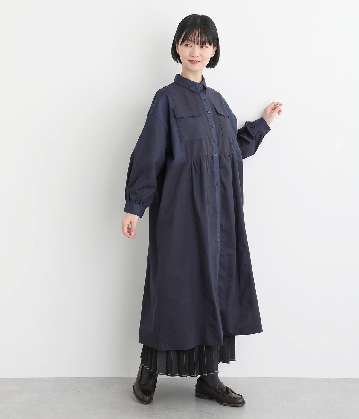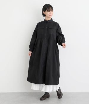 ワークテイストな生地を用いながらも、切り替えギャザーのフレアシルエットで可愛らしい要素も加えました。ワンピース使いはもちろん、ライトアウターとしても着まわせる便利な一枚。大きめのフラップポケットもポイントです。