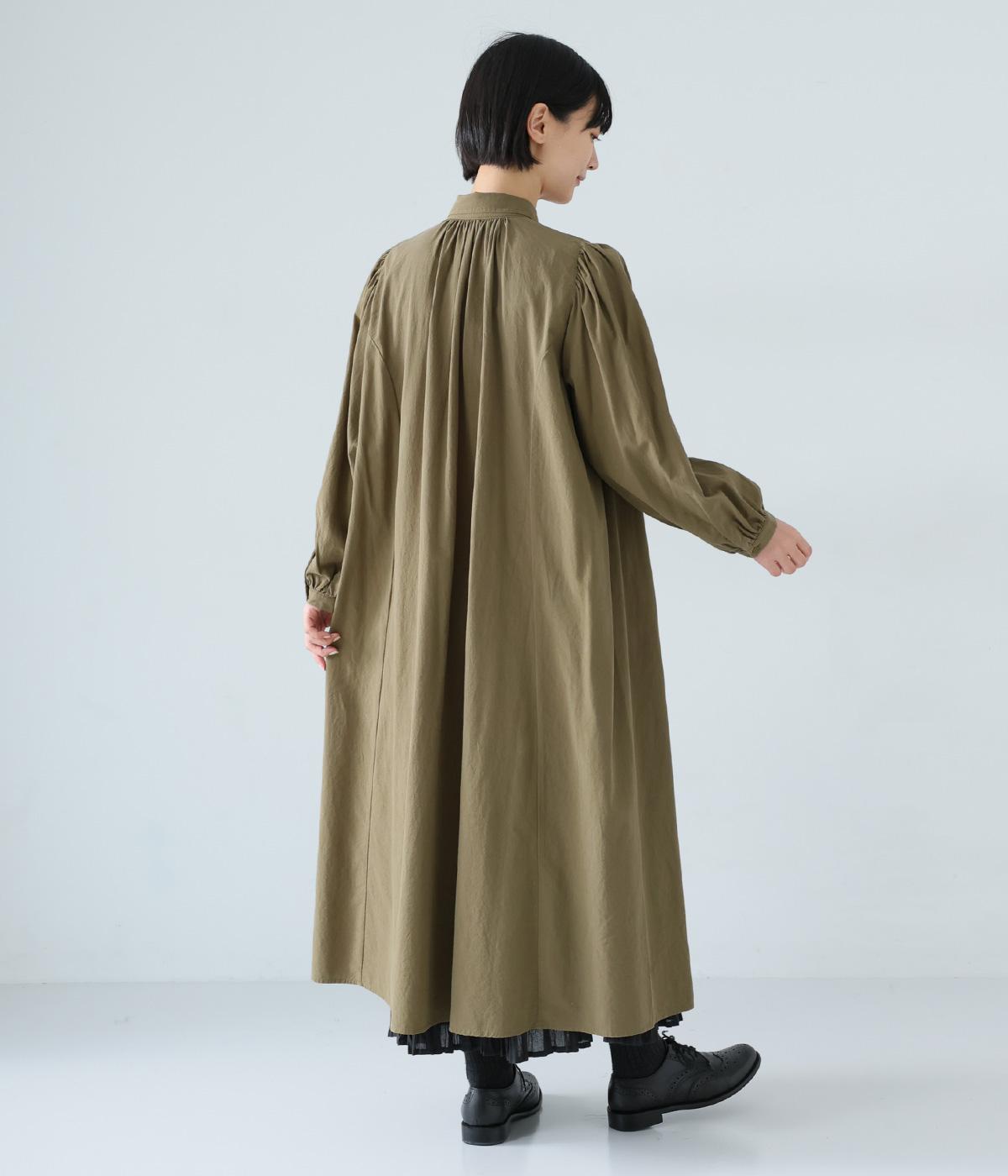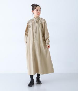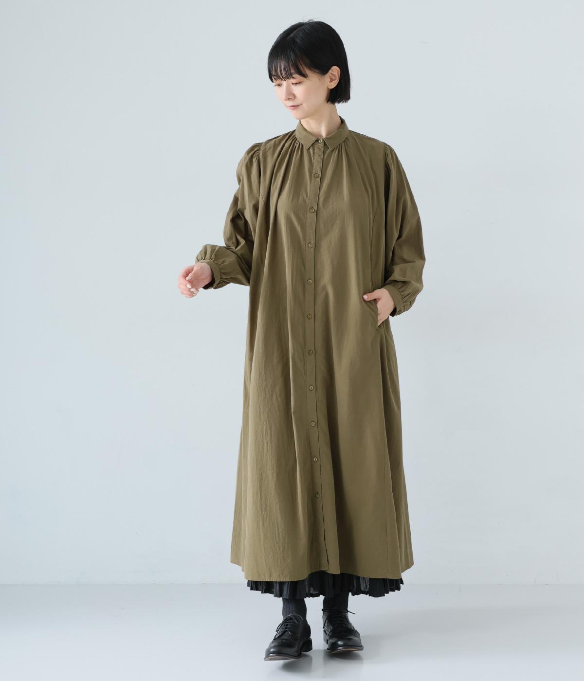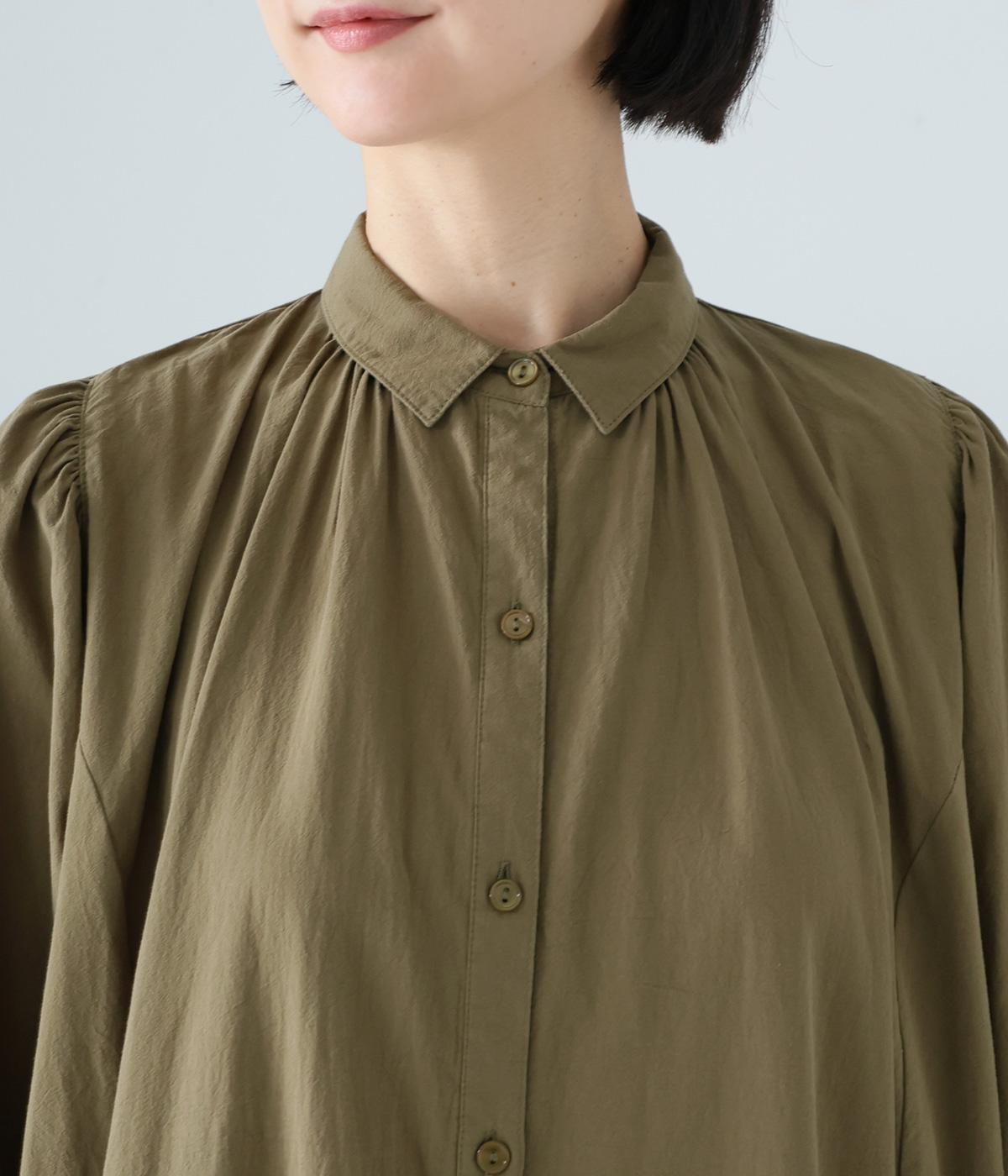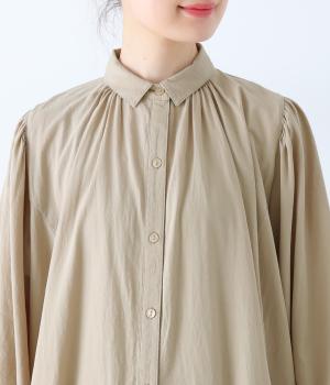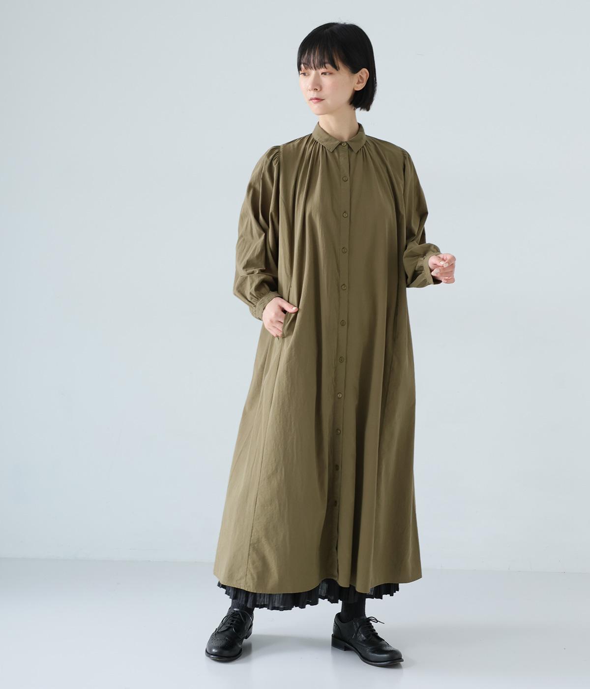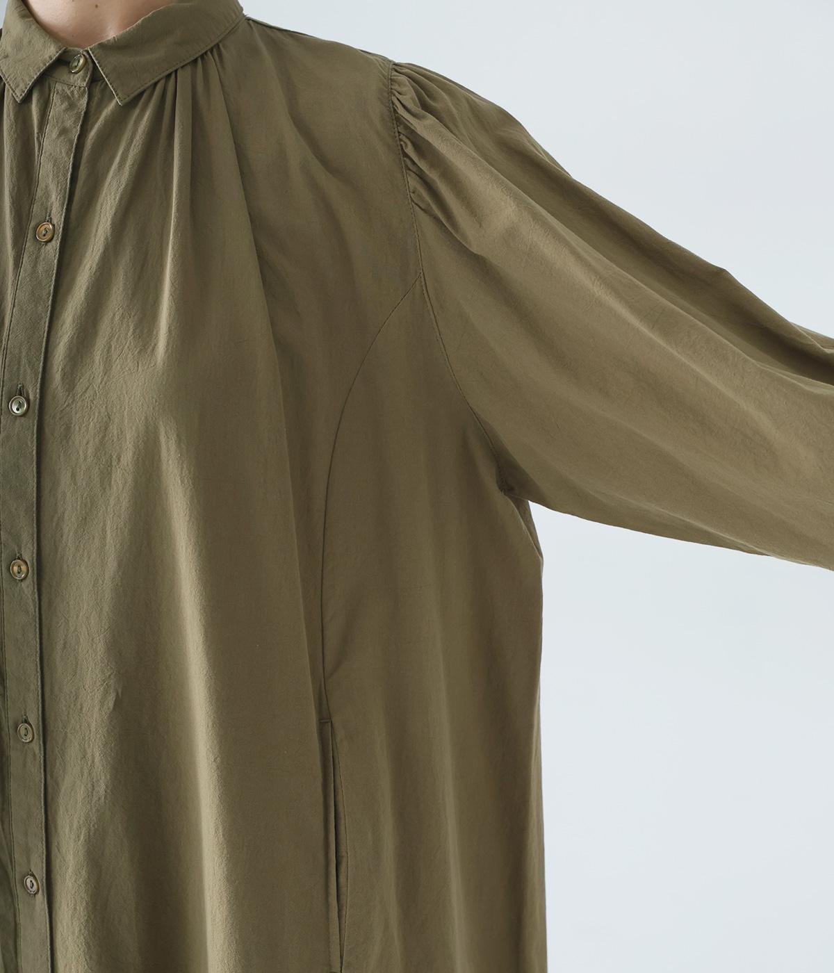ネックまわりと肩、袖口に繊細なギャザーをあしらったシャツワンピース。流れるようなドレープが縦ラインを強調し、ゆとりのあるシルエットをすっきりと見せてくれます。首元に沿う小さな襟も愛らしいポイントです。