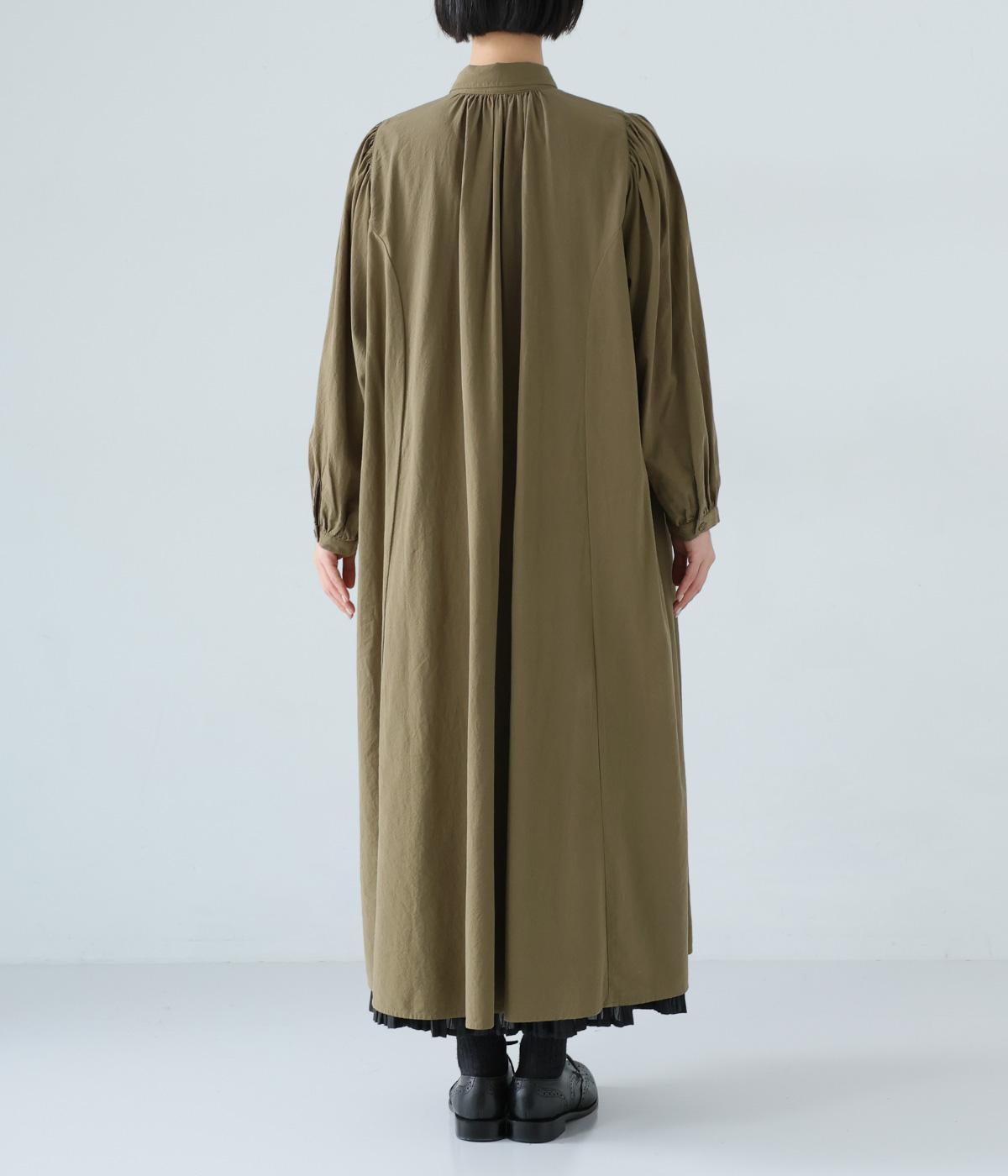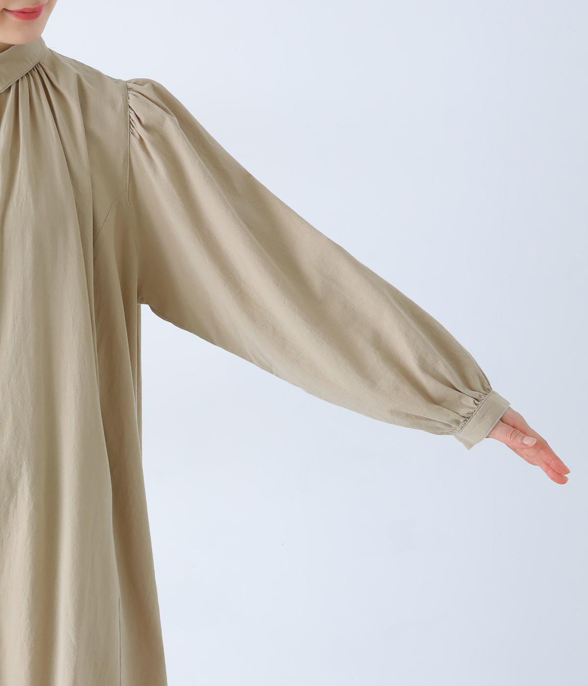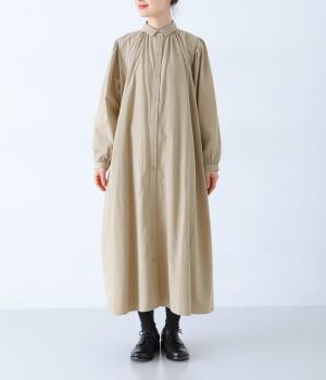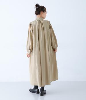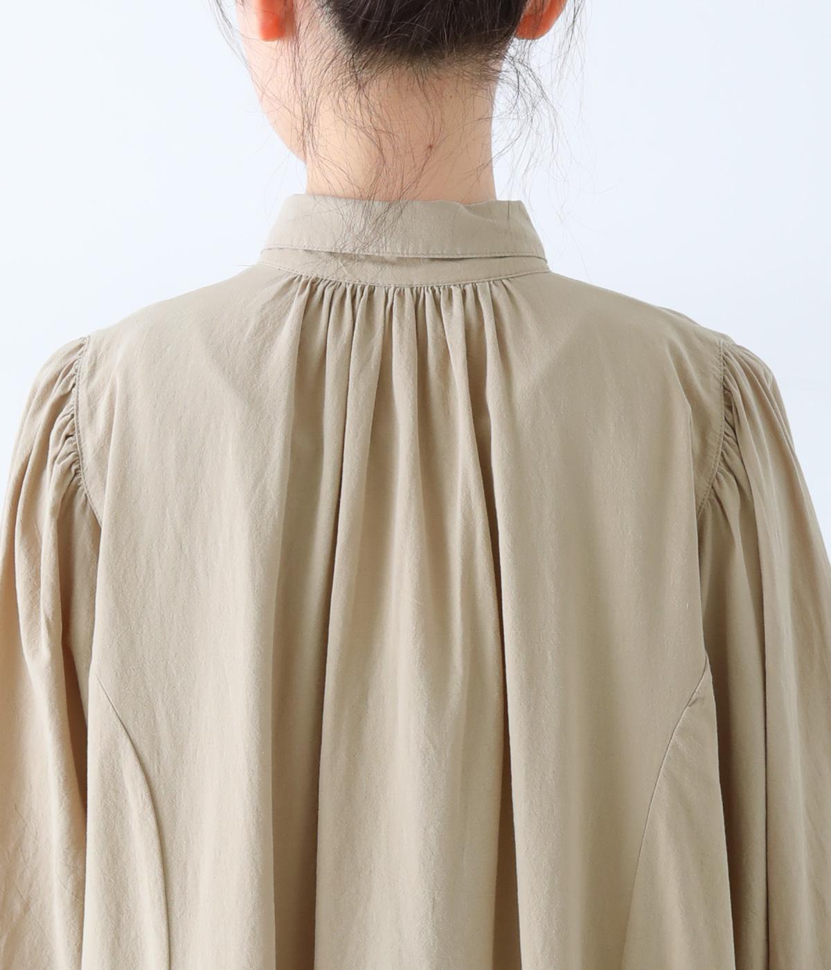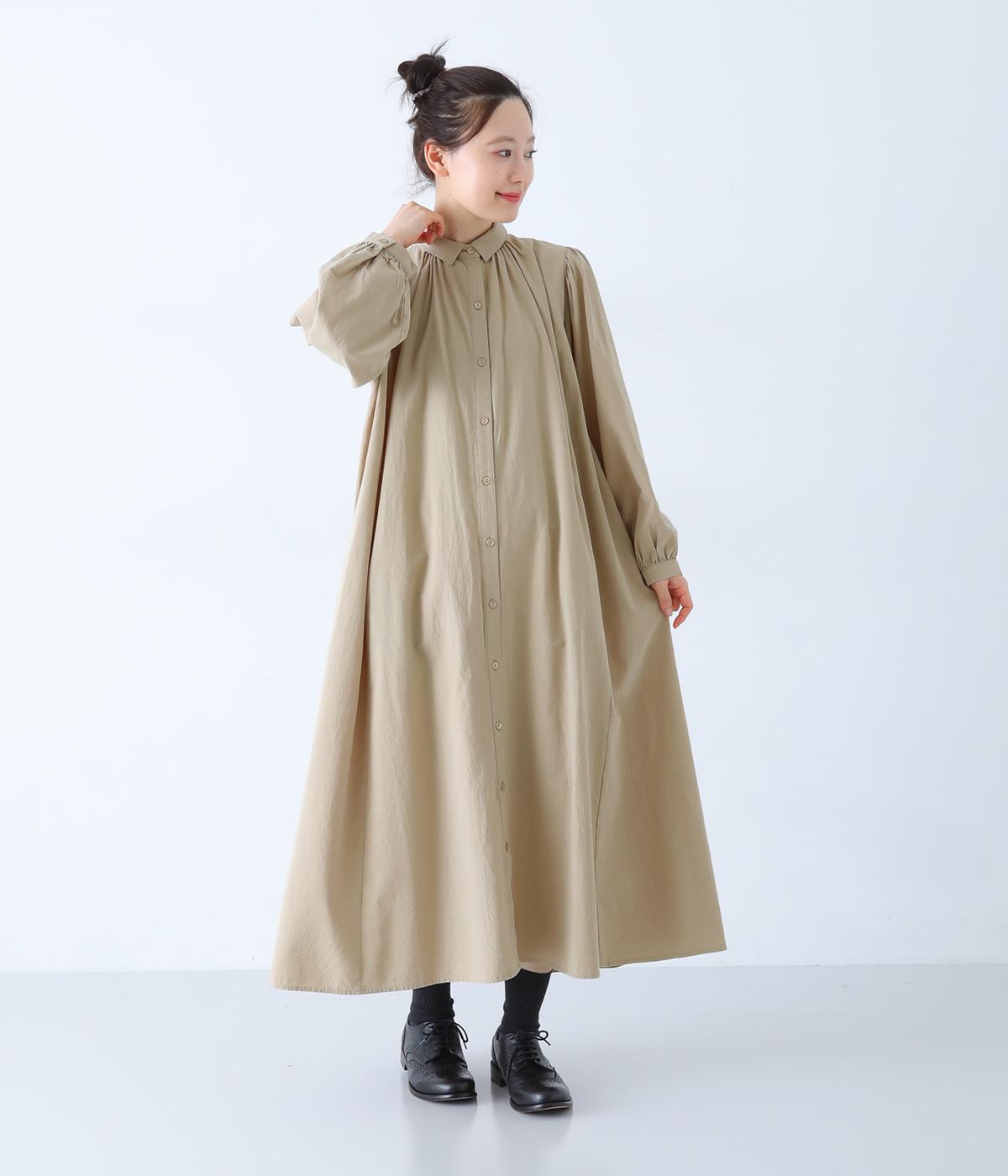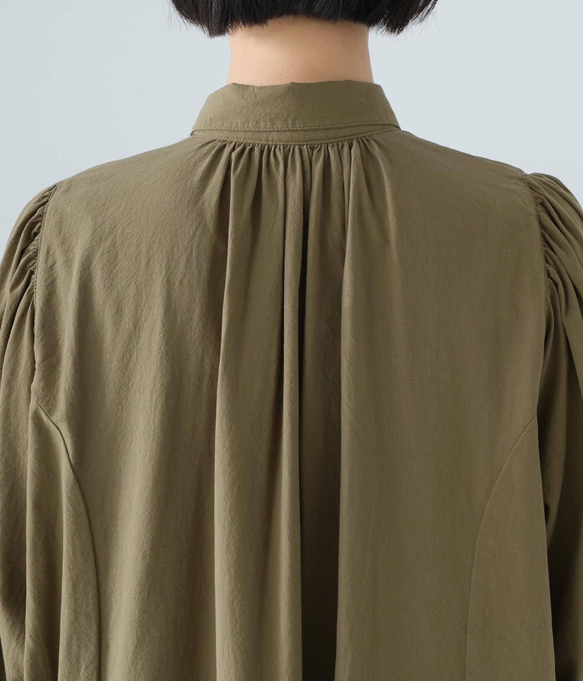 ネックまわりと肩、袖口に繊細なギャザーをあしらったシャツワンピース。流れるようなドレープが縦ラインを強調し、ゆとりのあるシルエットをすっきりと見せてくれます。首元に沿う小さな襟も愛らしいポイントです。