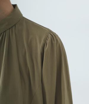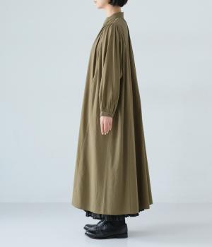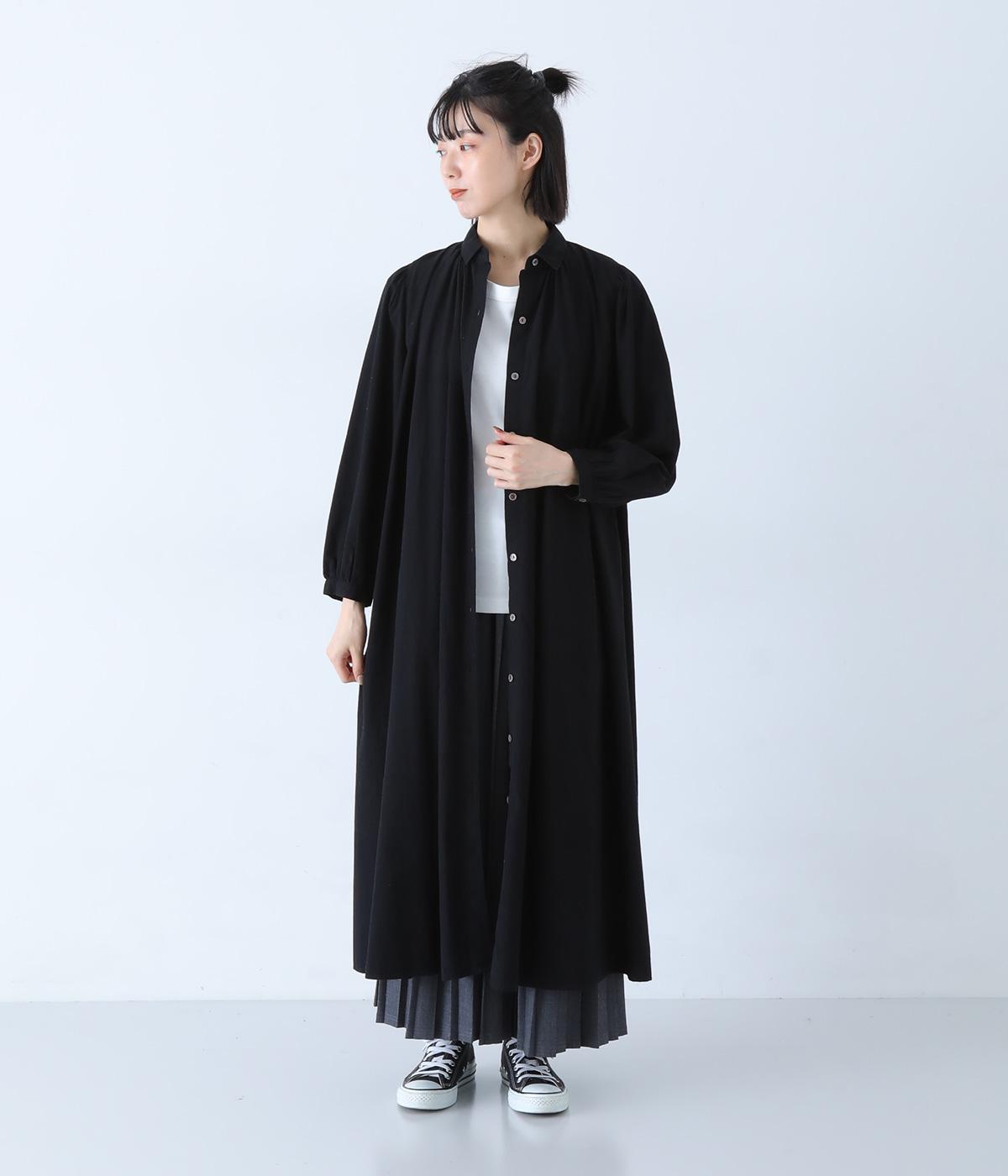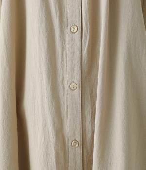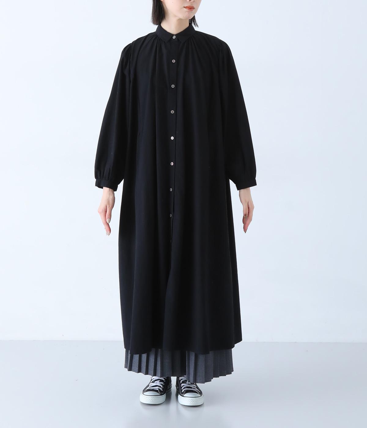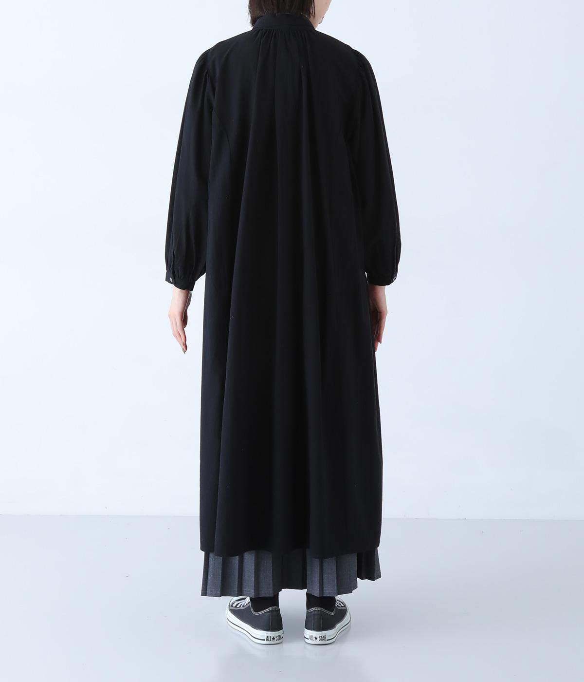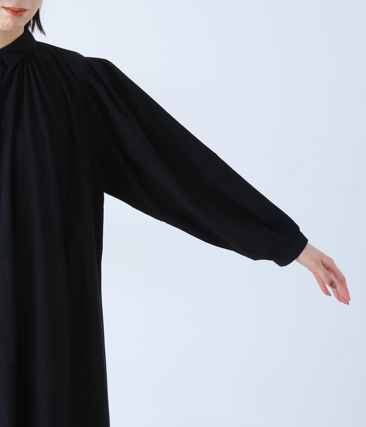 ネックまわりと肩、袖口に繊細なギャザーをあしらったシャツワンピース。流れるようなドレープが縦ラインを強調し、ゆとりのあるシルエットをすっきりと見せてくれます。首元に沿う小さな襟も愛らしいポイントです。
