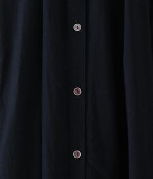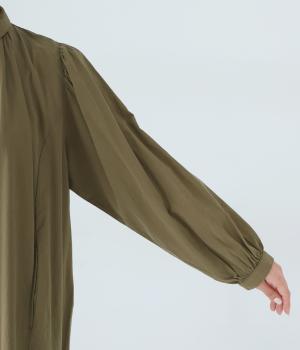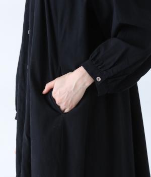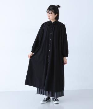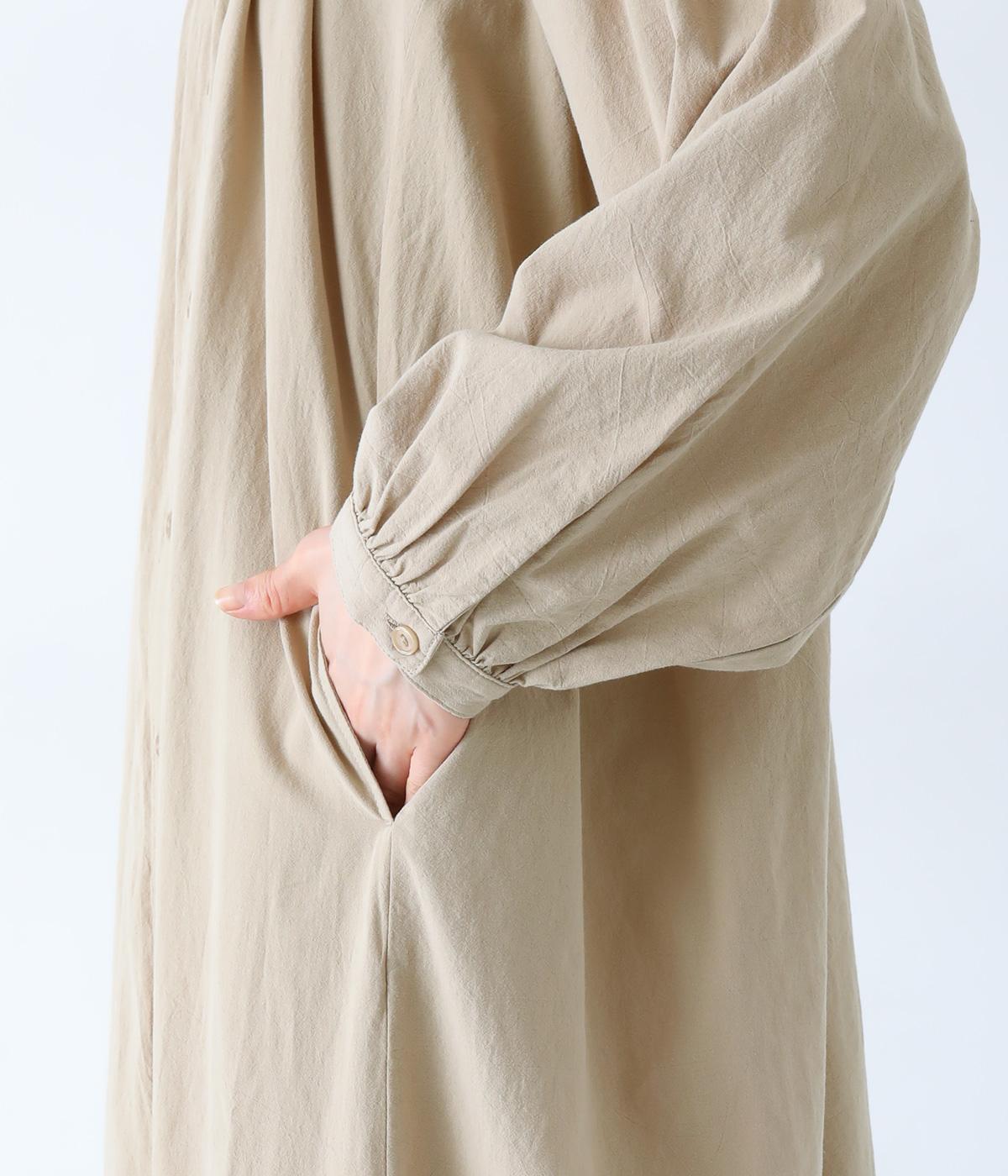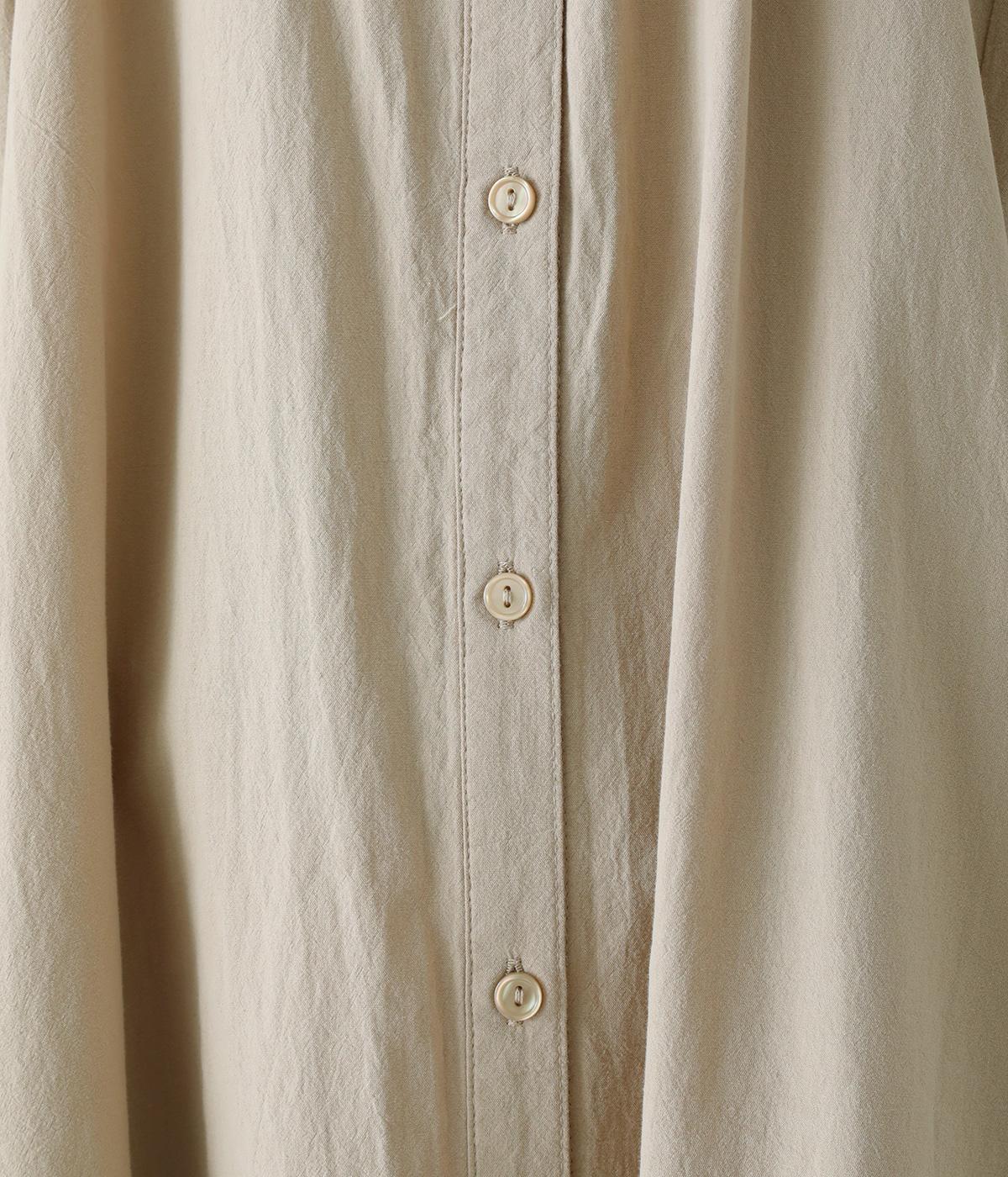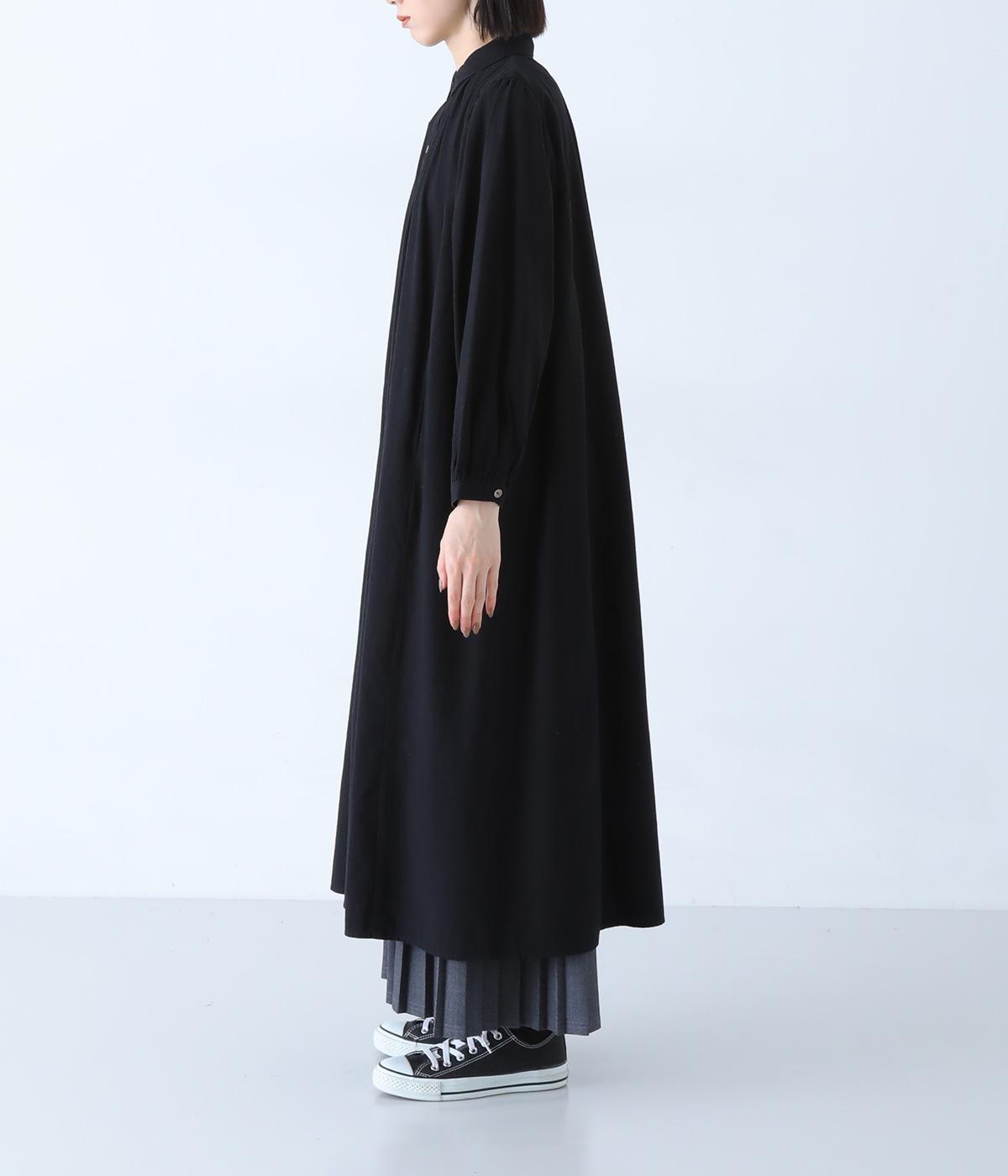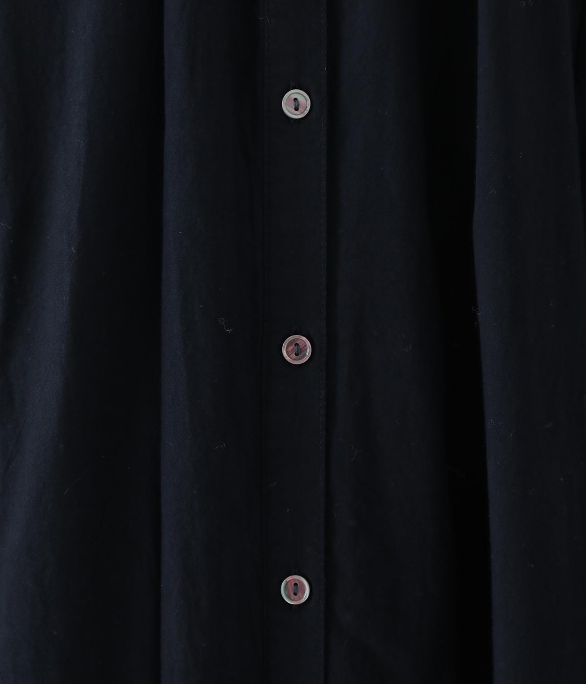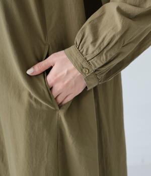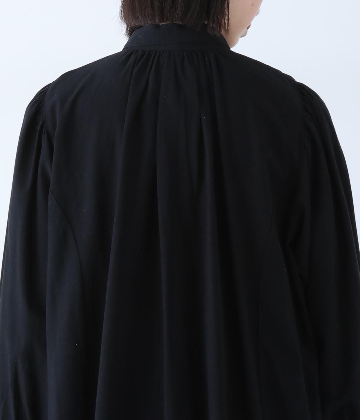 ネックまわりと肩、袖口に繊細なギャザーをあしらったシャツワンピース。流れるようなドレープが縦ラインを強調し、ゆとりのあるシルエットをすっきりと見せてくれます。首元に沿う小さな襟も愛らしいポイントです。