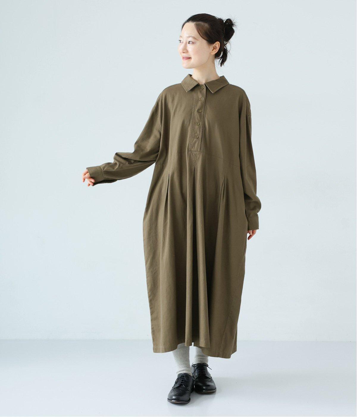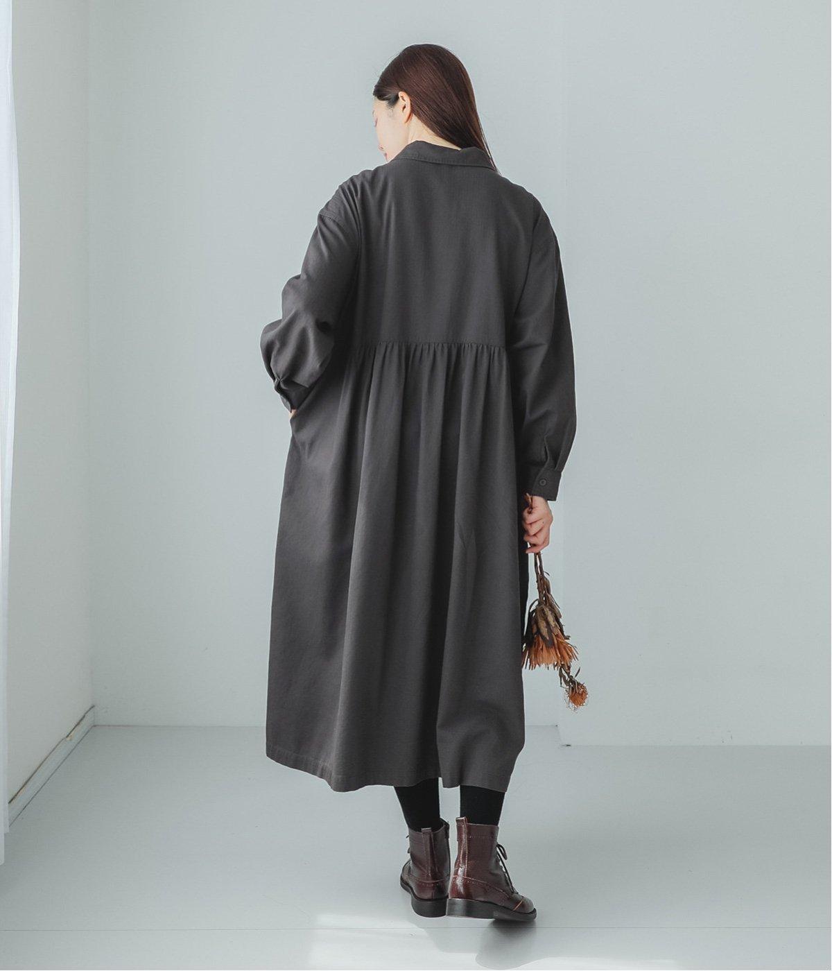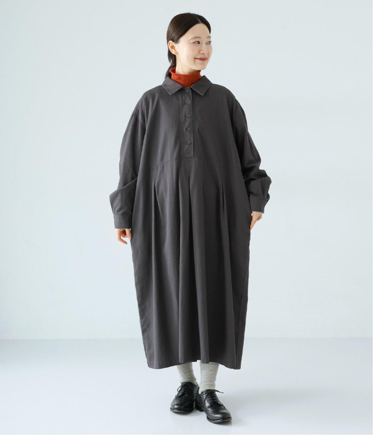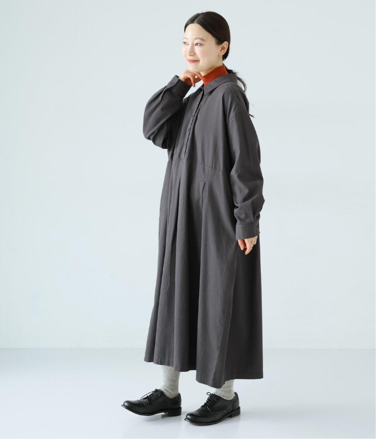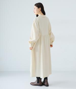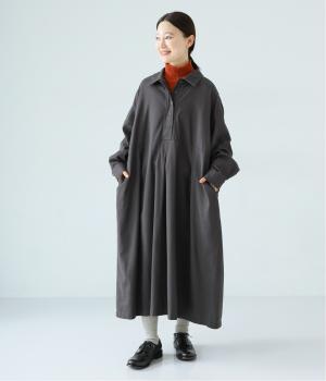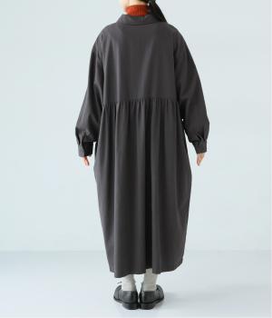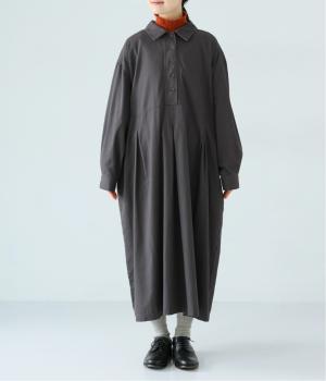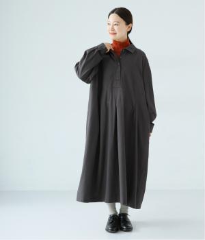 前ウエストにタックを、後ろにはギャザーを施した前後で違った表情をたのしめるワンピース。端正な襟でラフになりすぎないきちんと感を添えました。前身頃はボタン開き仕様で、タートルネックトップスなどのレイヤードもサマ見えします。