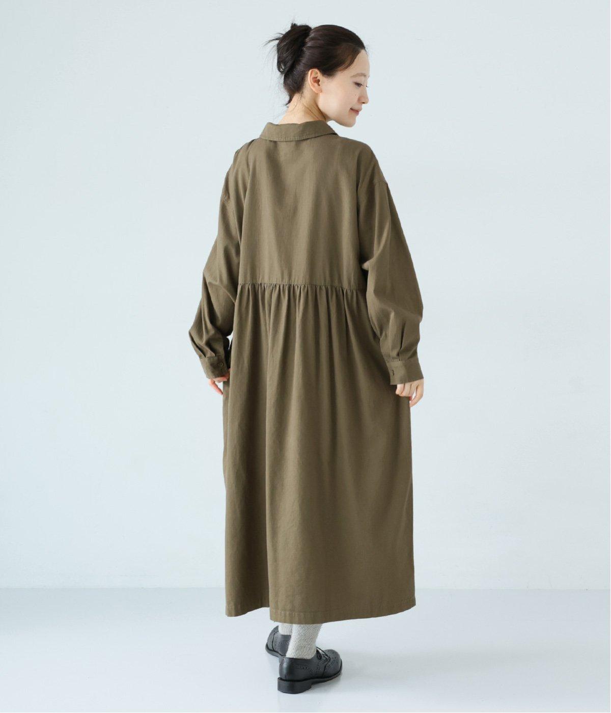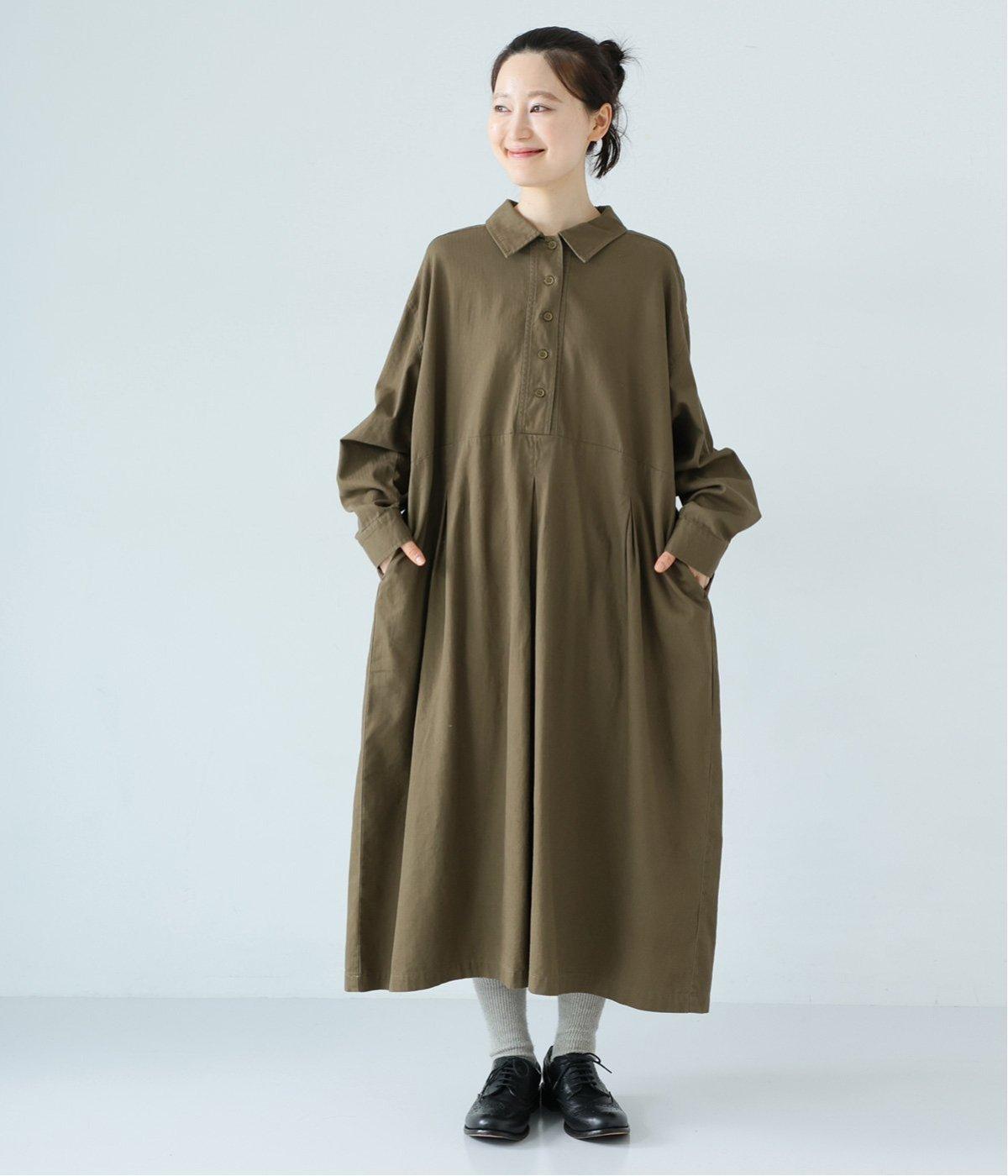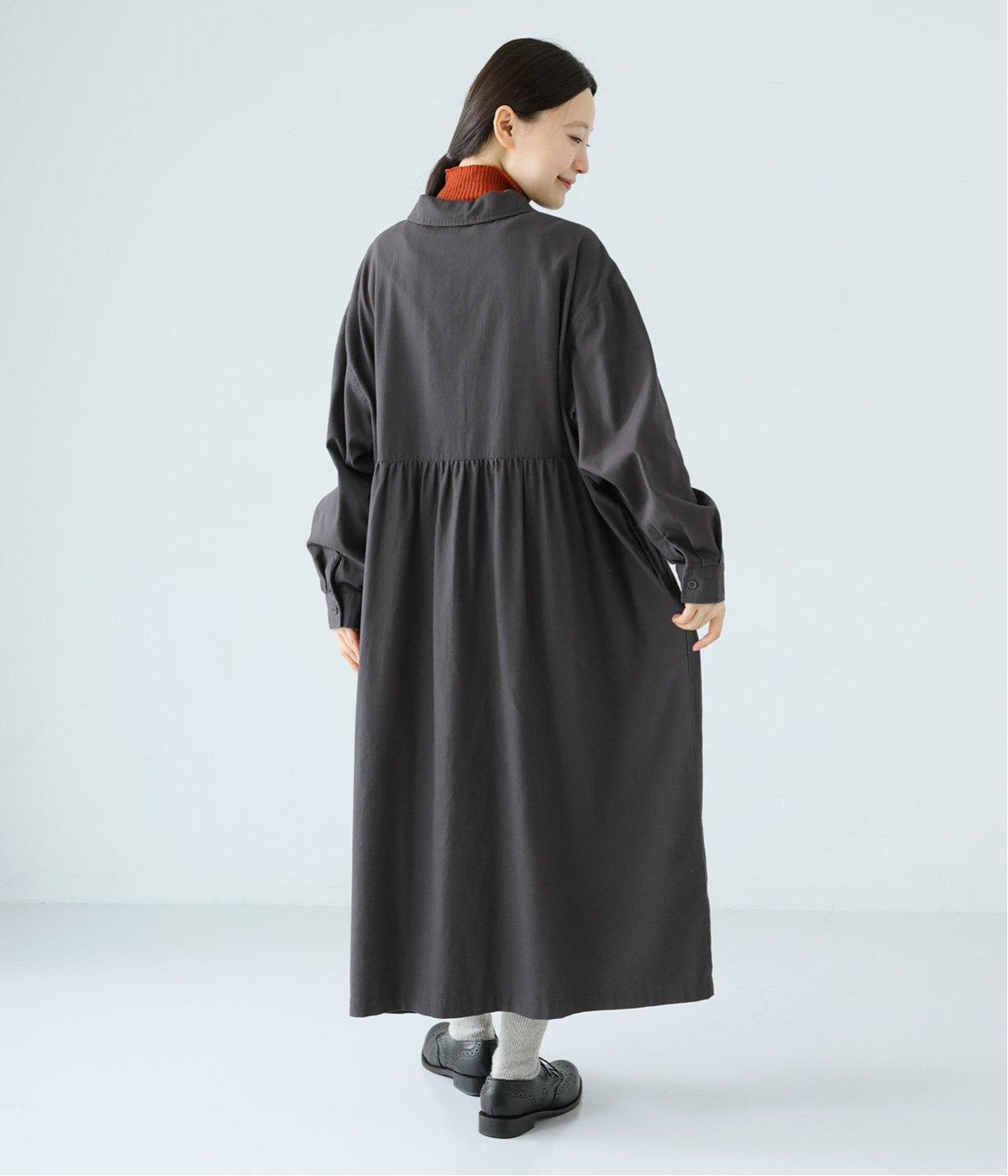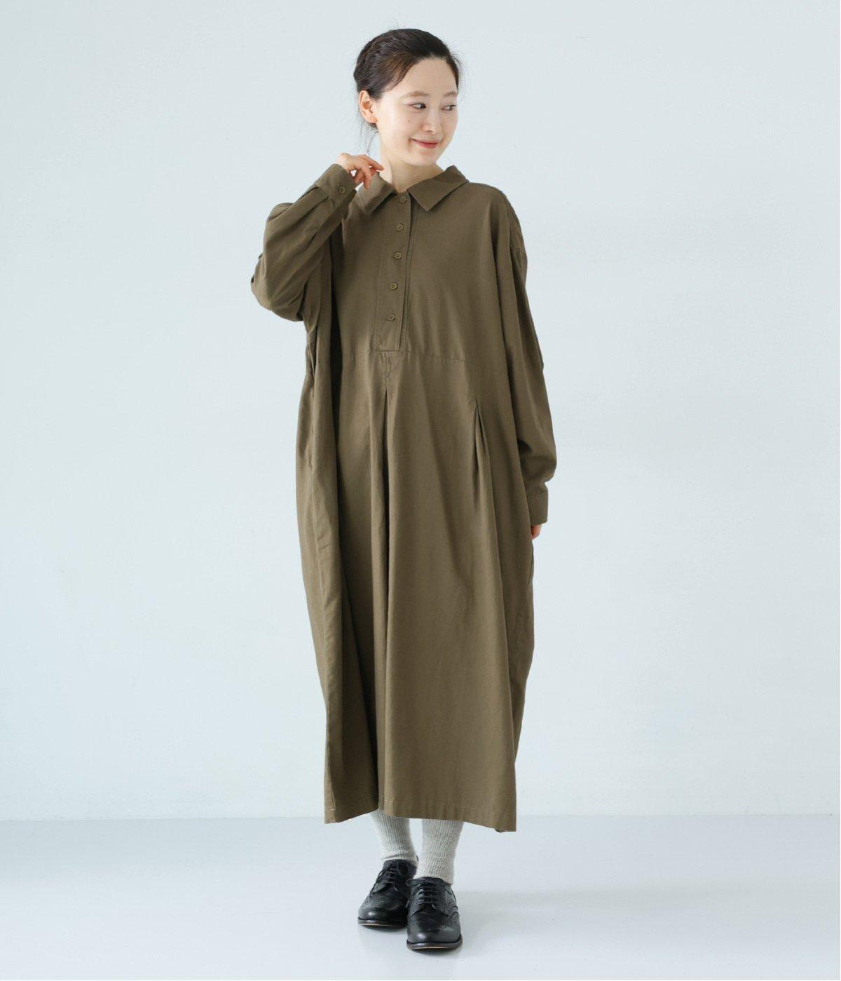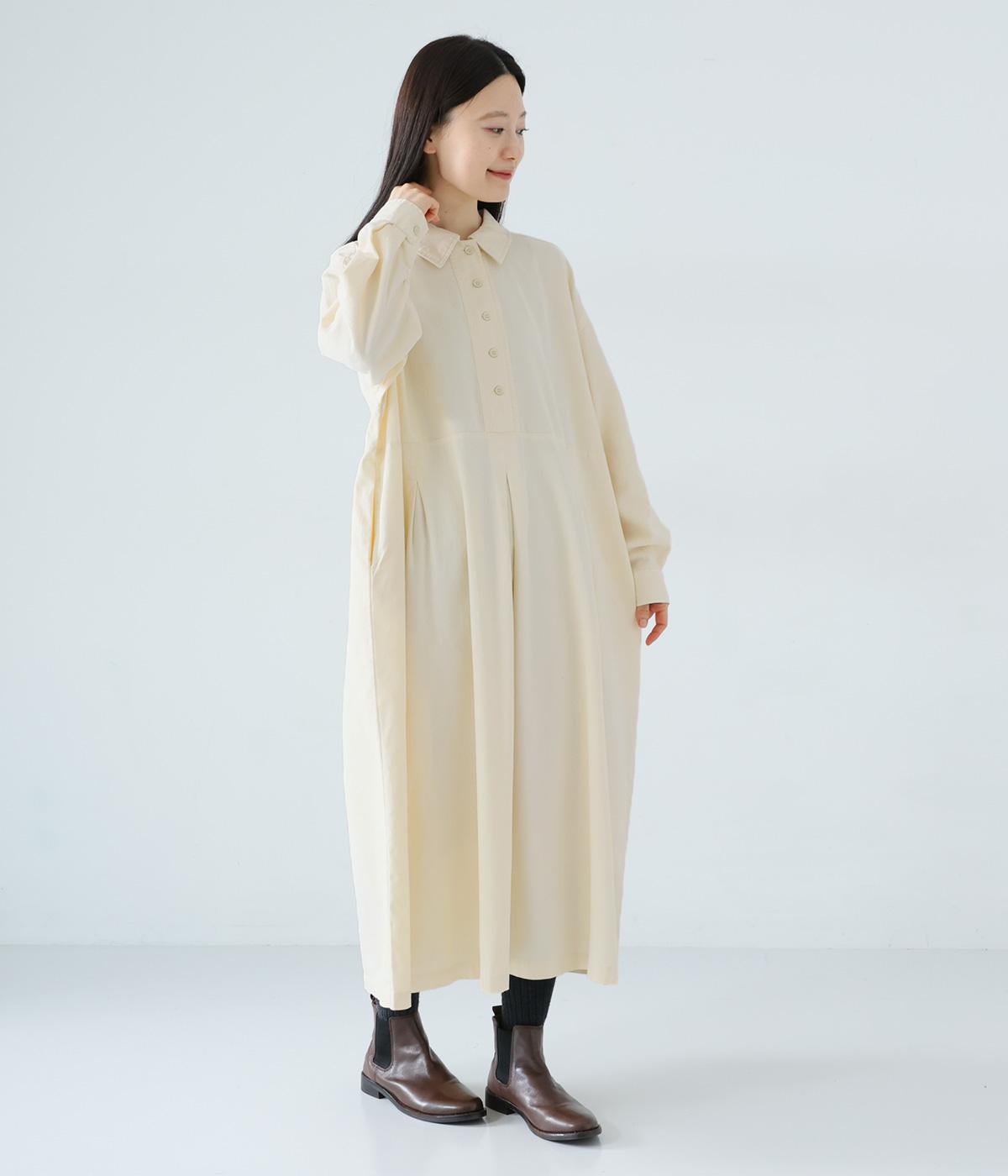 前ウエストにタックを、後ろにはギャザーを施した前後で違った表情をたのしめるワンピース。端正な襟でラフになりすぎないきちんと感を添えました。前身頃はボタン開き仕様で、タートルネックトップスなどのレイヤードもサマ見えします。