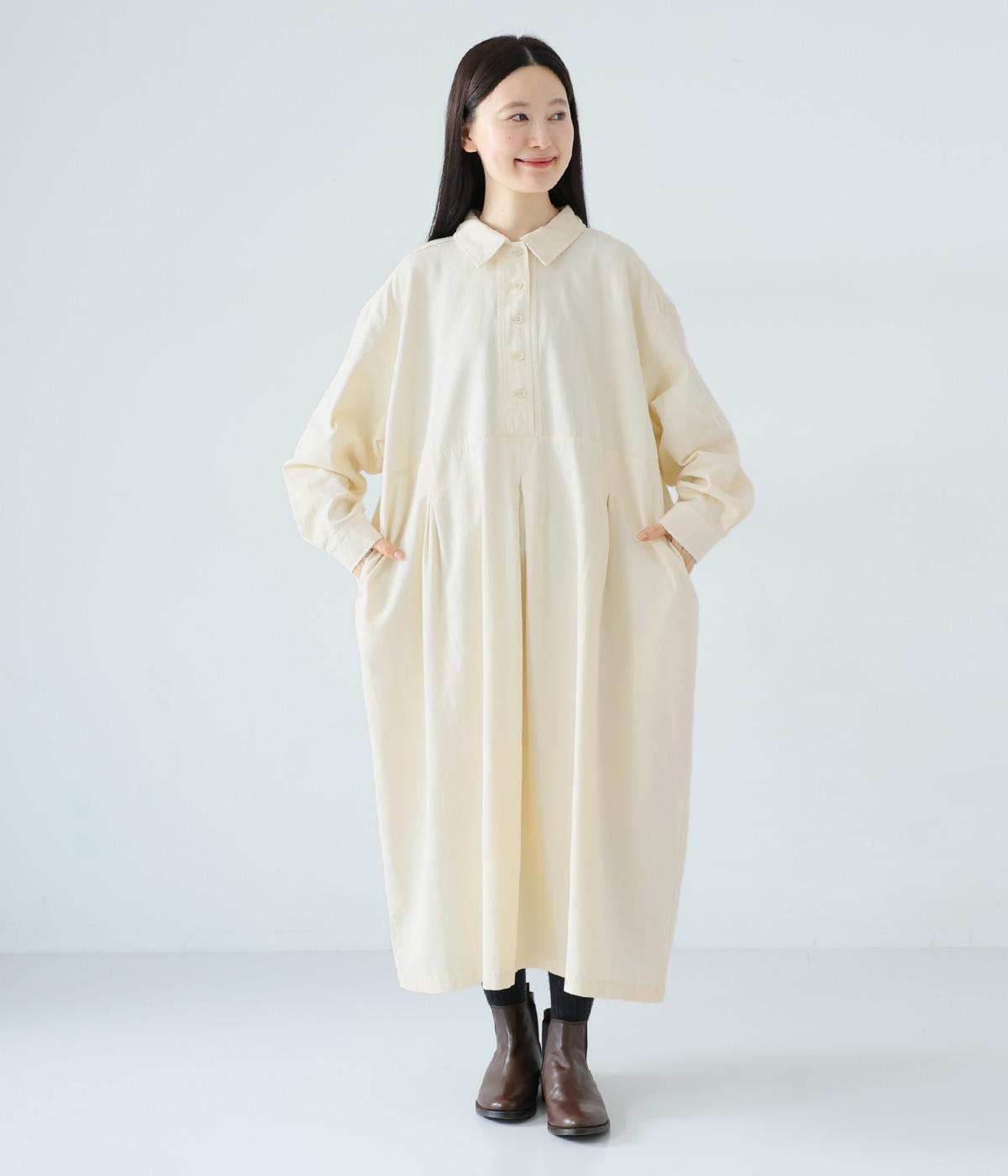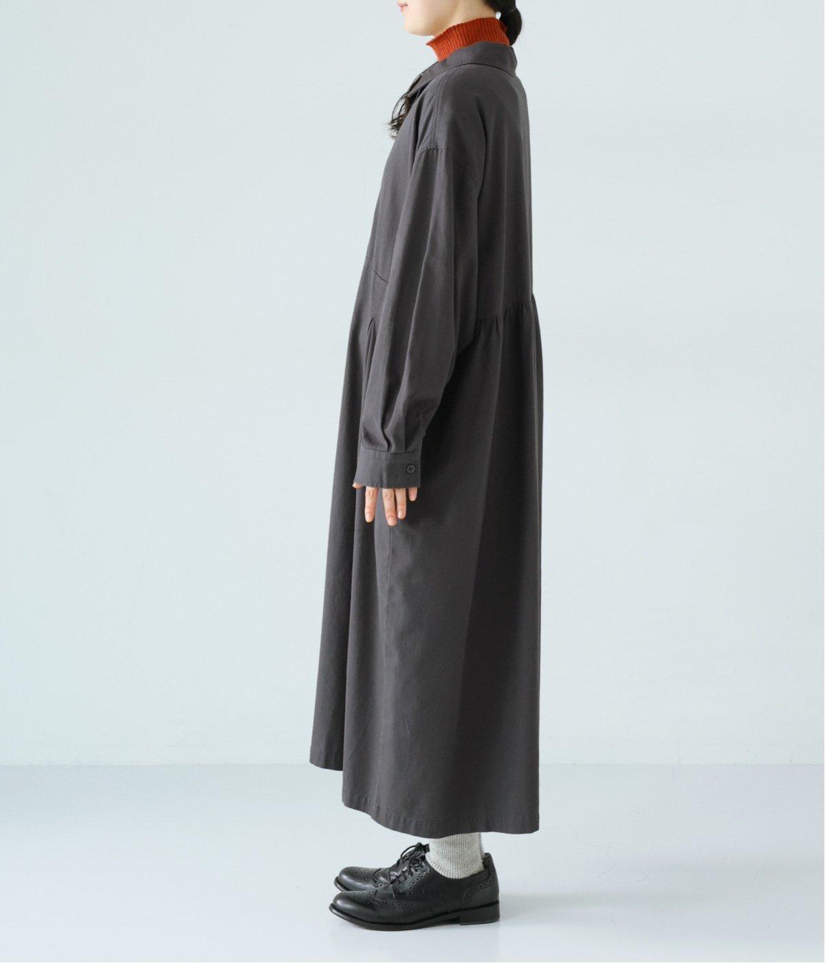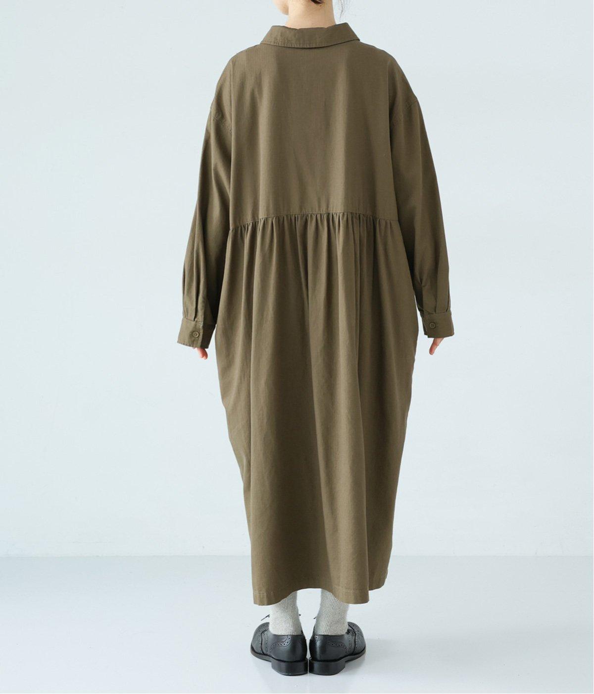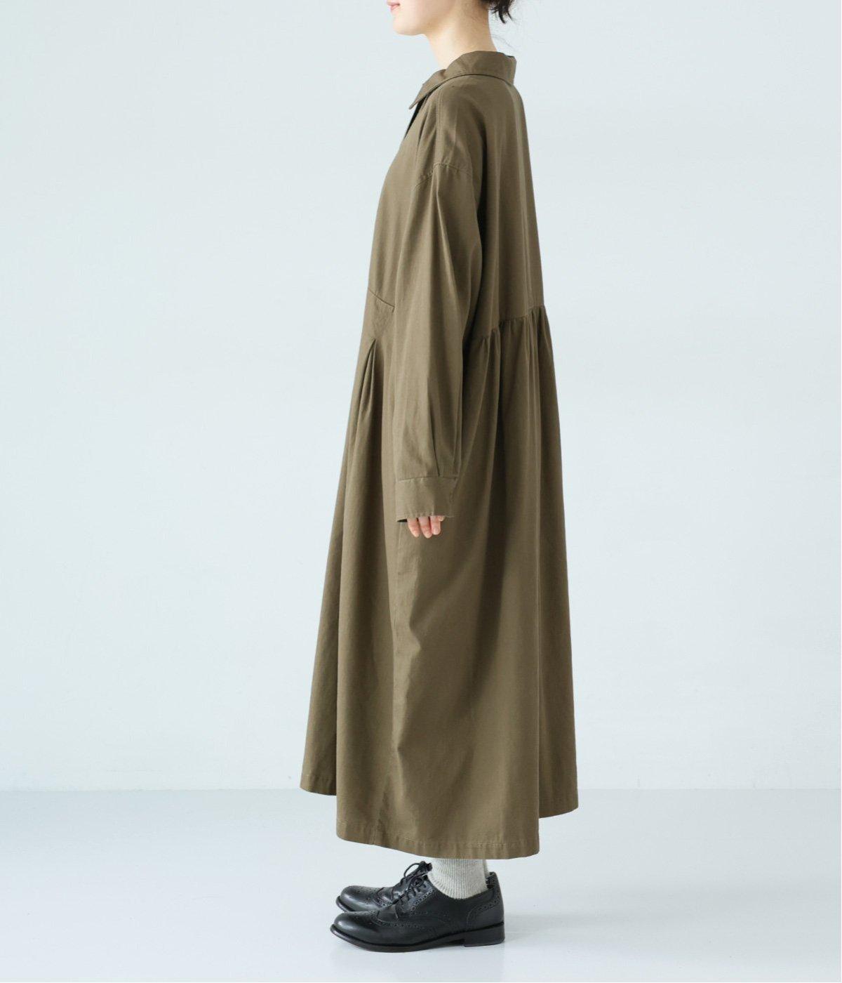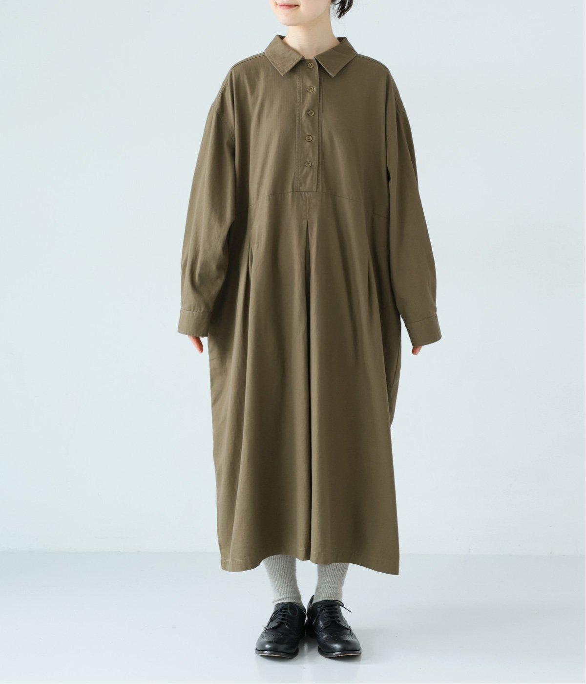 前ウエストにタックを、後ろにはギャザーを施した前後で違った表情をたのしめるワンピース。端正な襟でラフになりすぎないきちんと感を添えました。前身頃はボタン開き仕様で、タートルネックトップスなどのレイヤードもサマ見えします。
