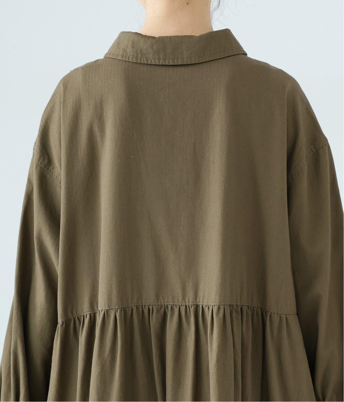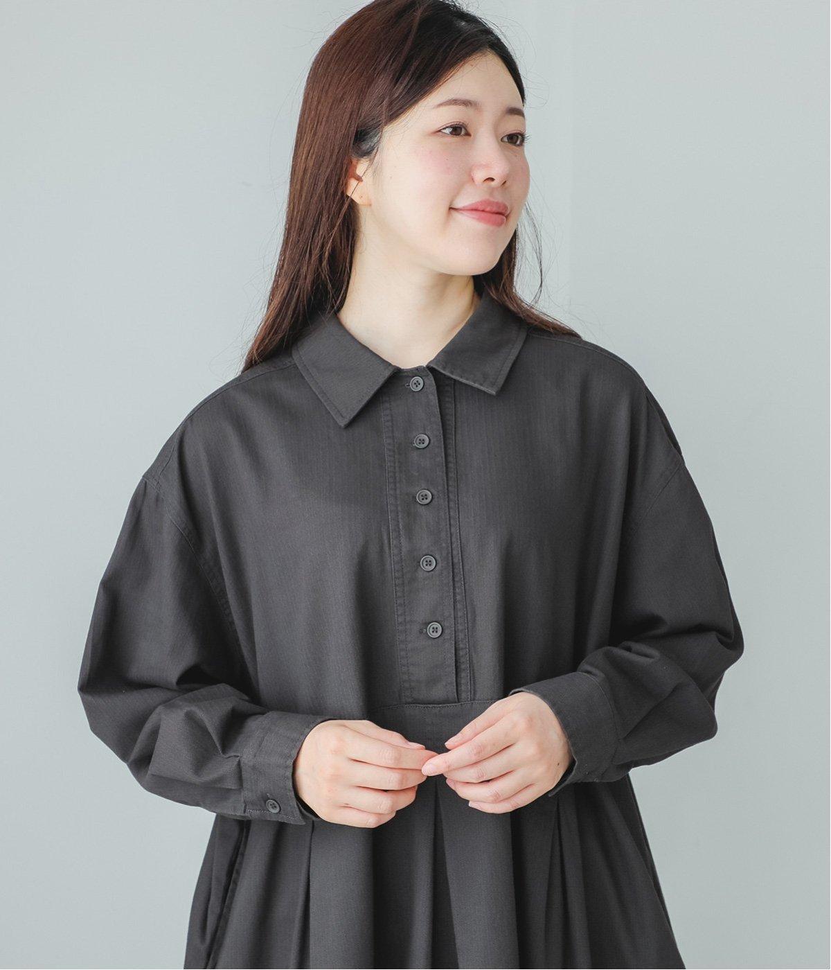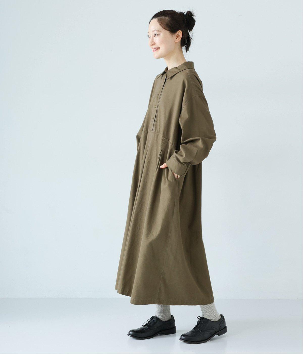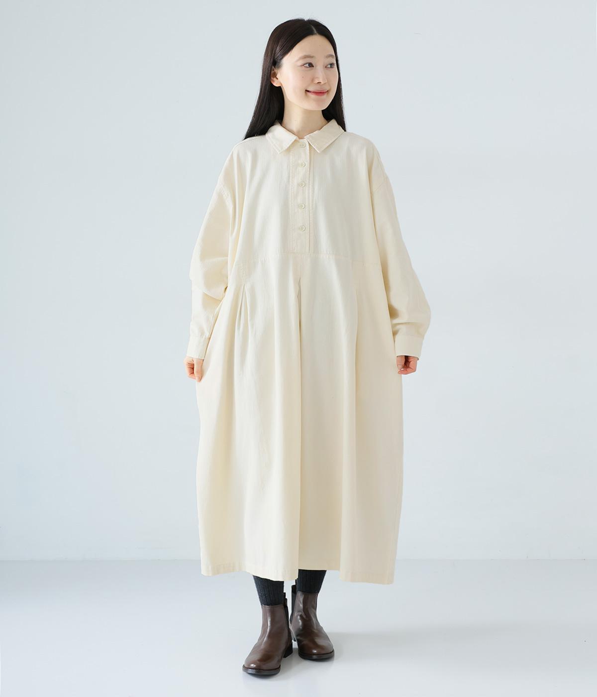 前ウエストにタックを、後ろにはギャザーを施した前後で違った表情をたのしめるワンピース。端正な襟でラフになりすぎないきちんと感を添えました。前身頃はボタン開き仕様で、タートルネックトップスなどのレイヤードもサマ見えします。