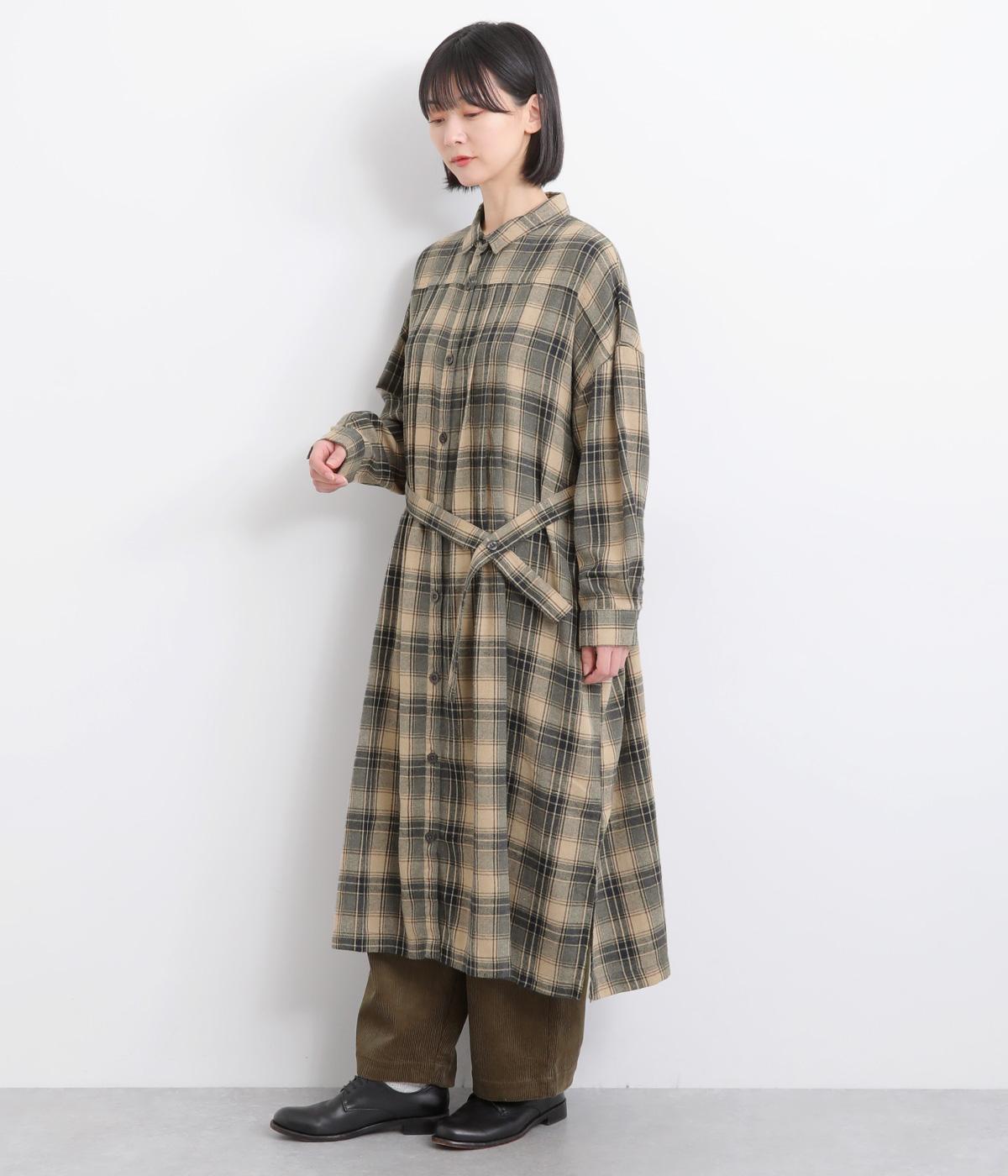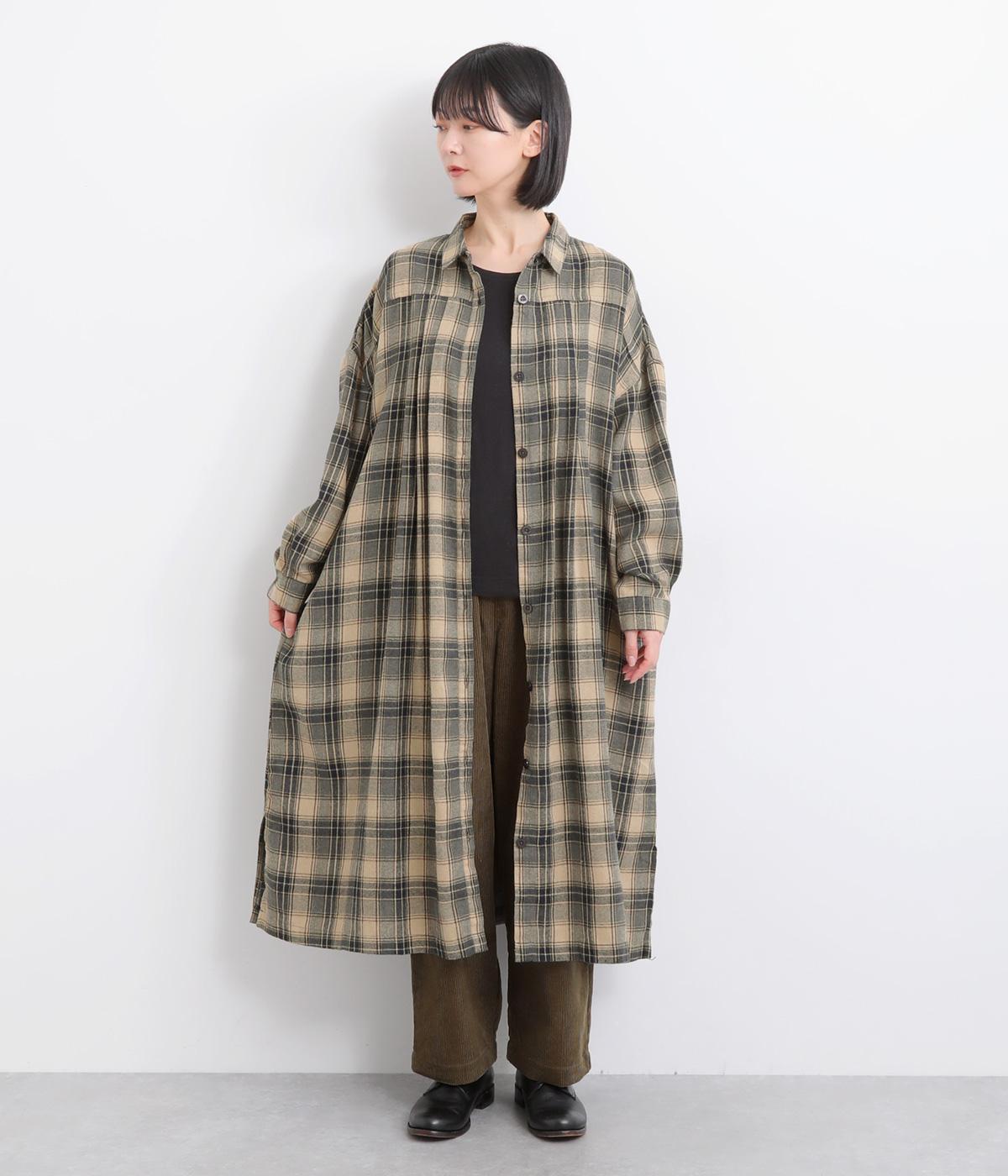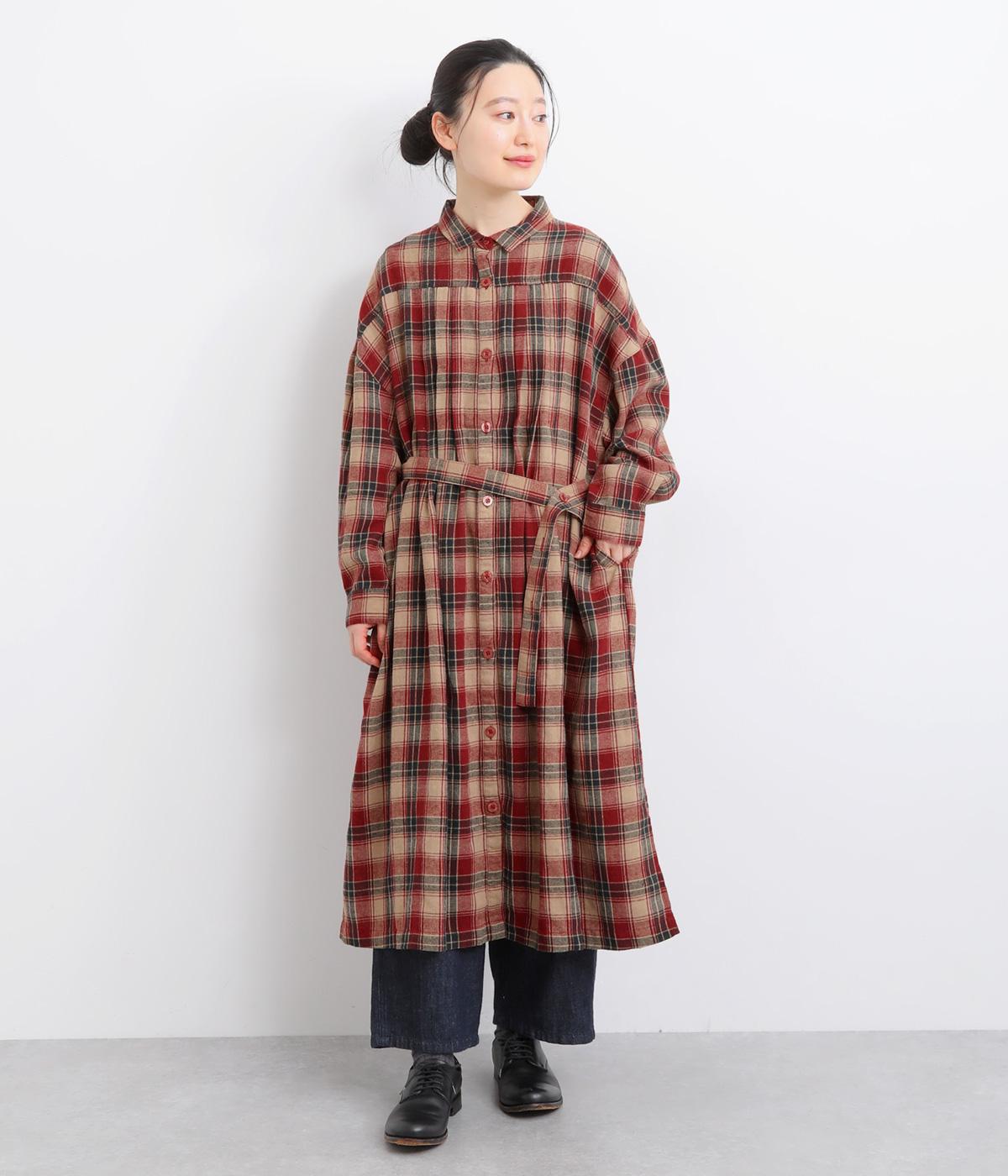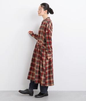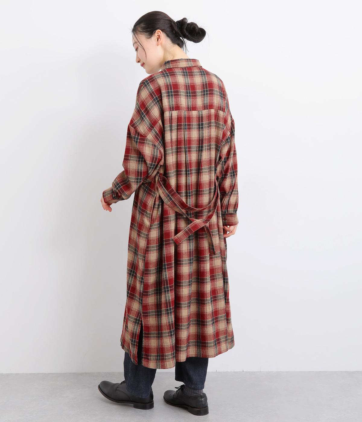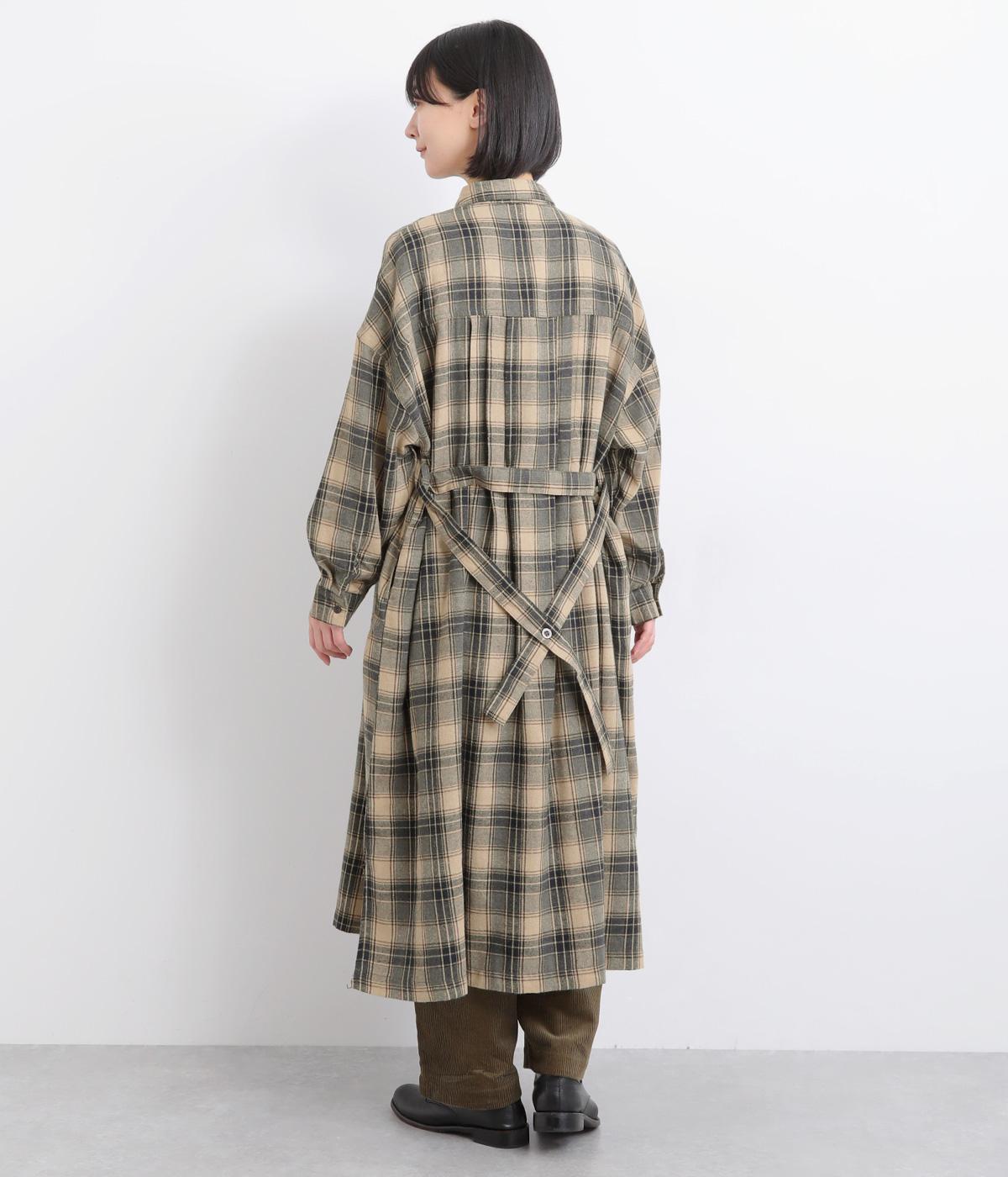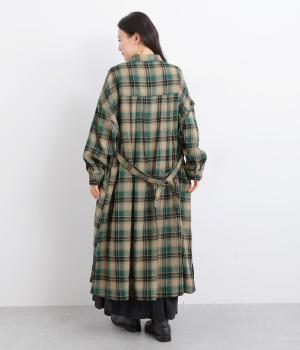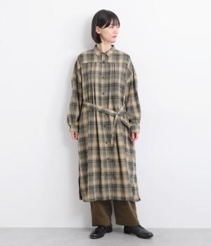 ナチュラルなチェック柄のネル起毛に、繊細なピンタックを入れることで、上品さをプラスしました。ローブのように巻ける紐はボタンでとめられる仕様。前でとめたり、後ろに垂らしたりなど、気分でアレンジができます。ボタンをあけて羽織れば軽やかなコート風にもなる、着まわしに便利なアイテムです。
