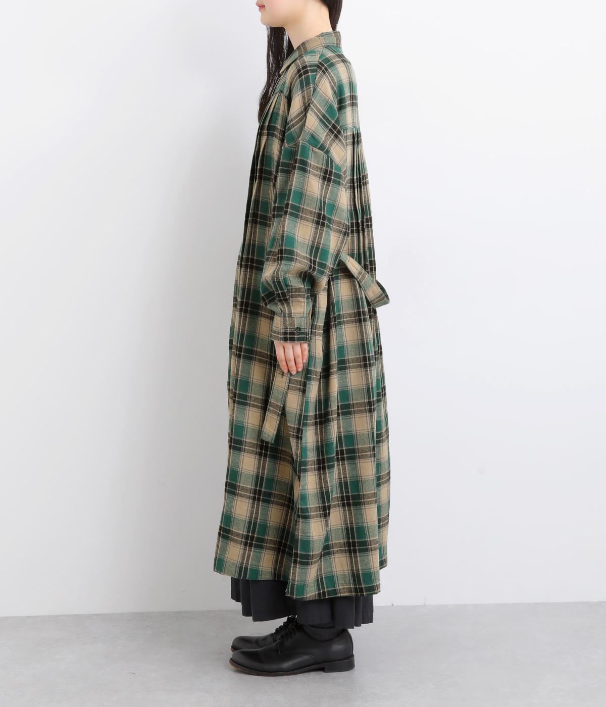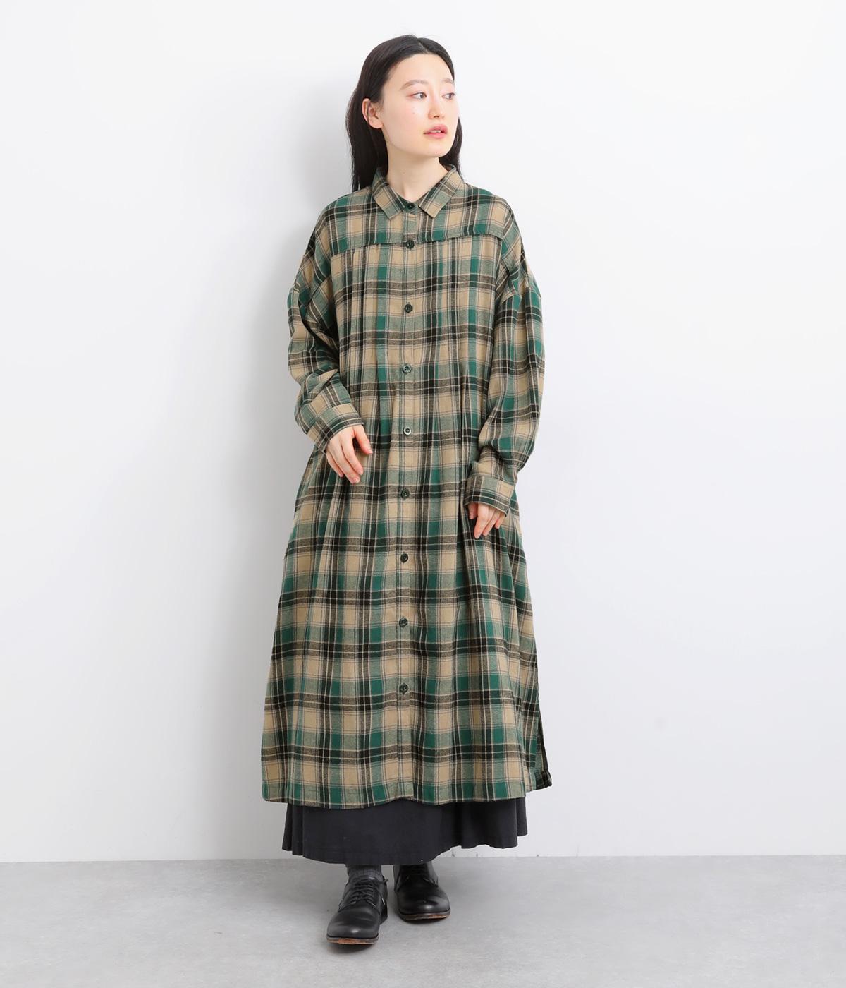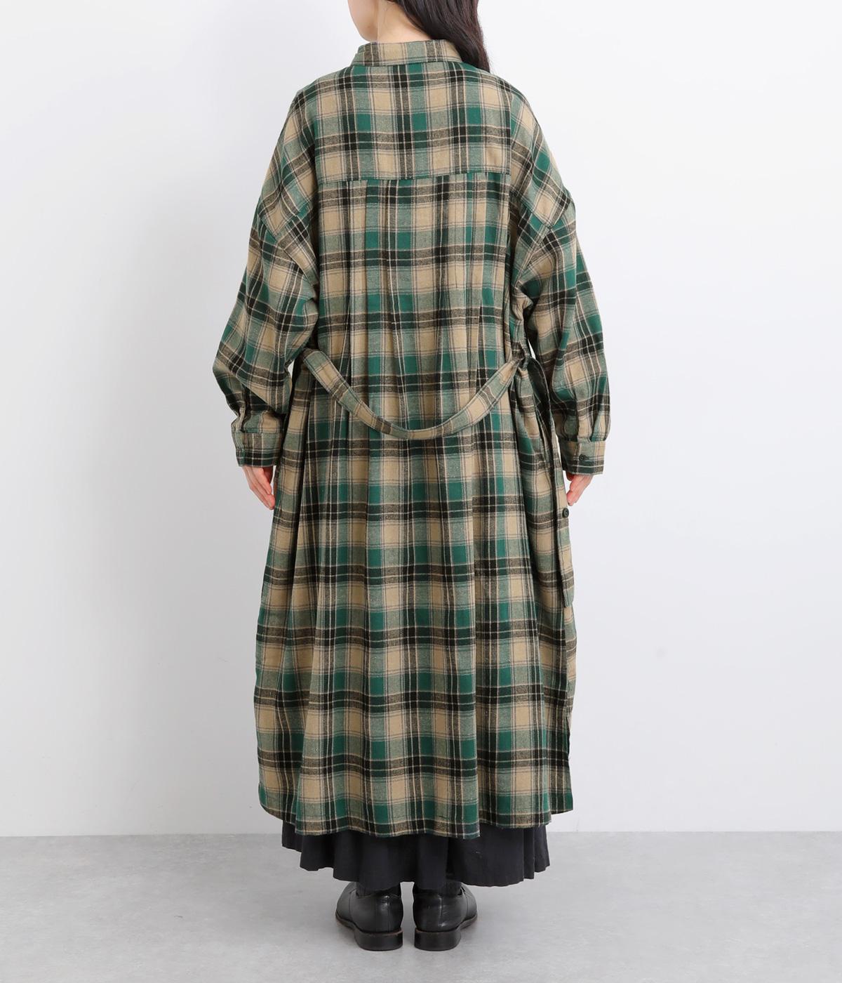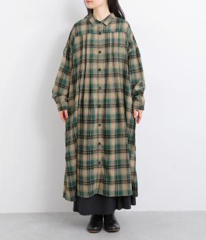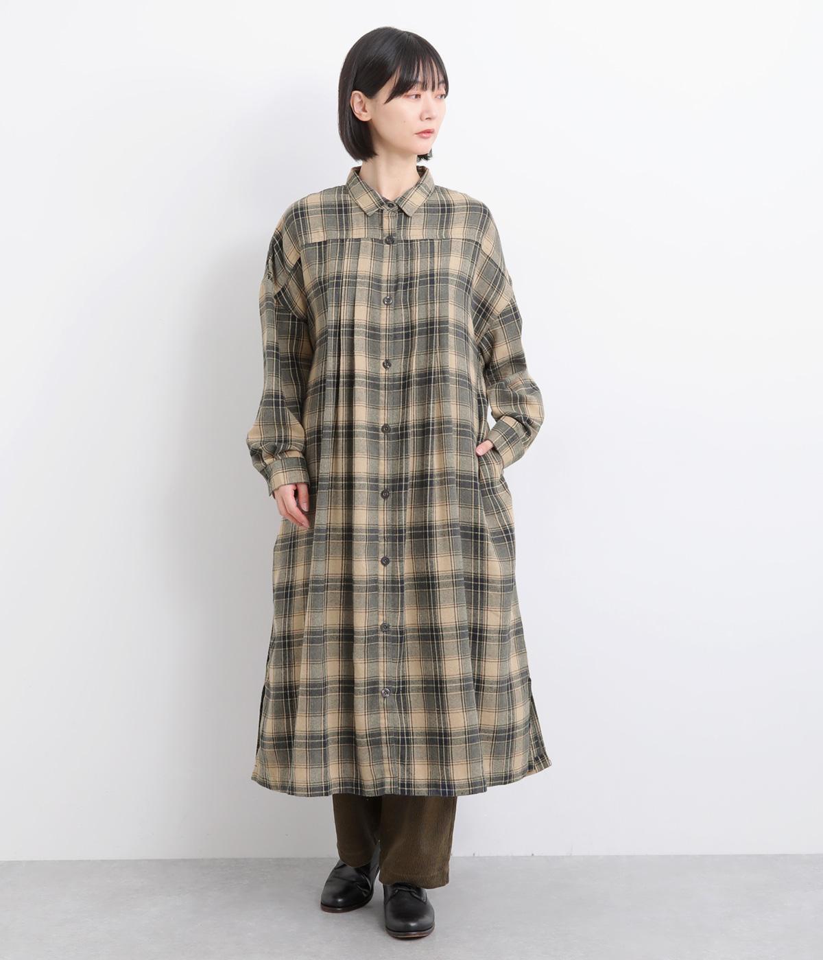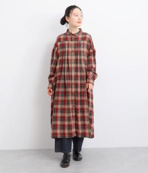 ナチュラルなチェック柄のネル起毛に、繊細なピンタックを入れることで、上品さをプラスしました。ローブのように巻ける紐はボタンでとめられる仕様。前でとめたり、後ろに垂らしたりなど、気分でアレンジができます。ボタンをあけて羽織れば軽やかなコート風にもなる、着まわしに便利なアイテムです。