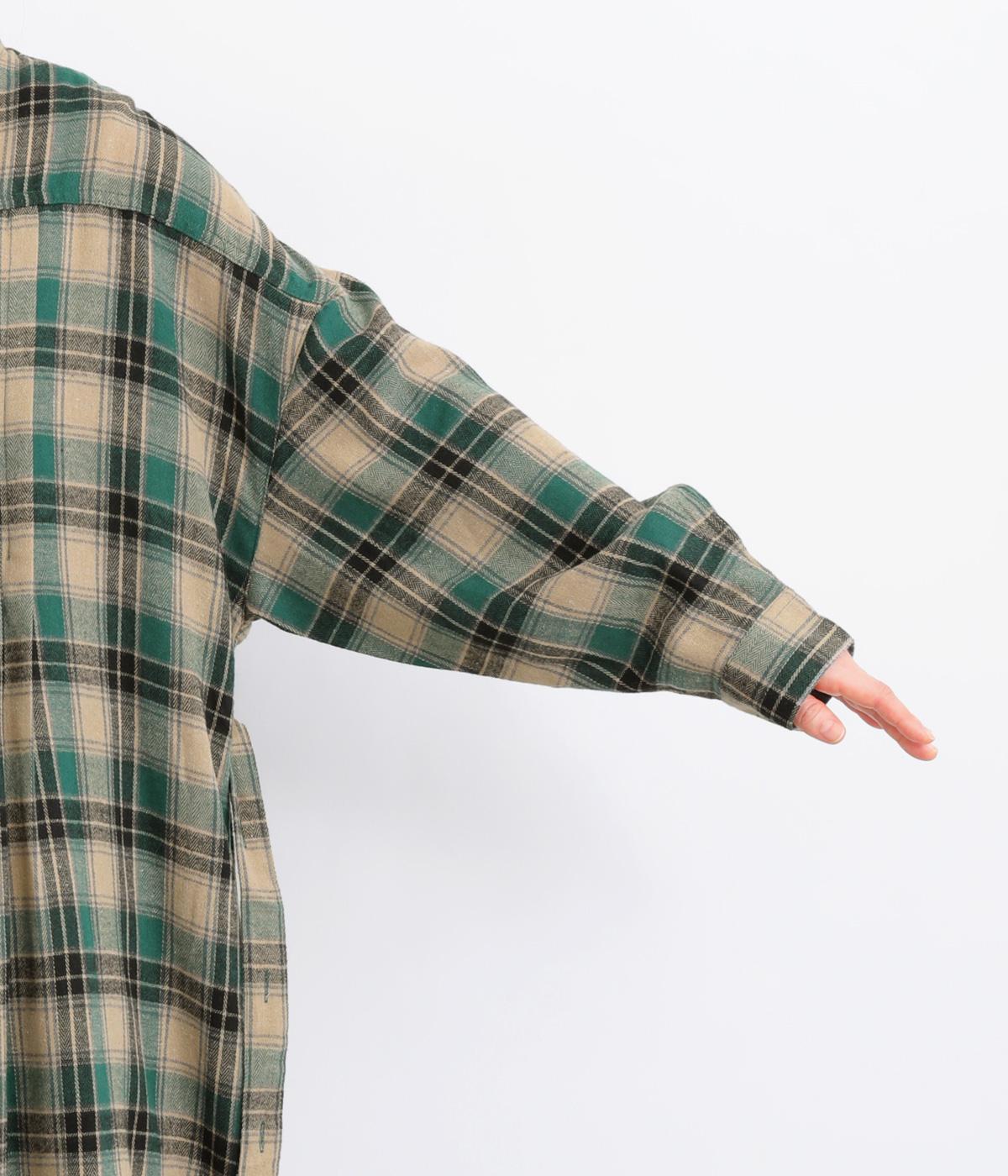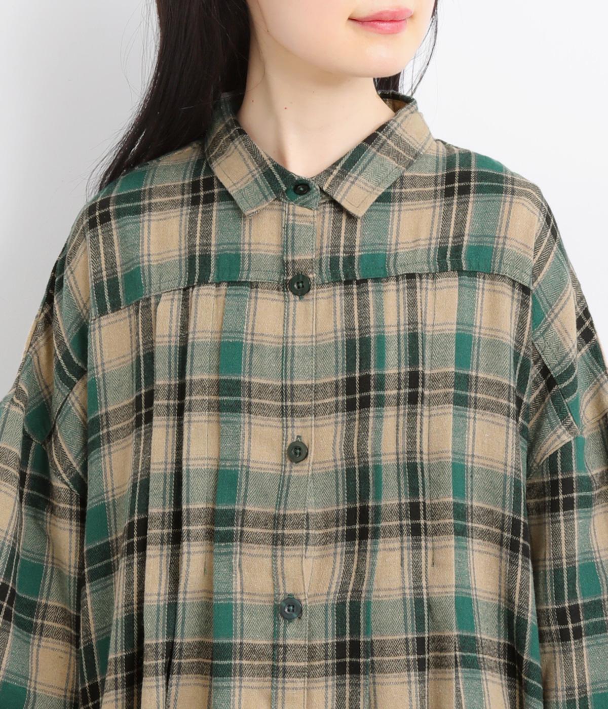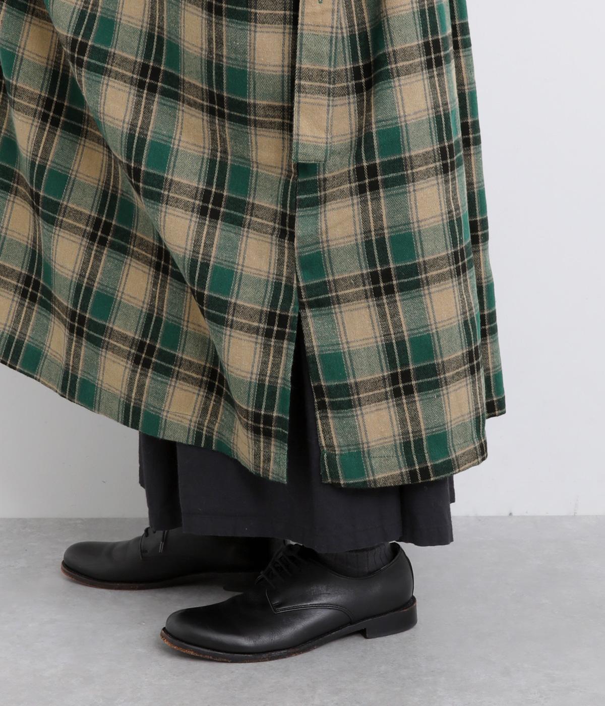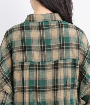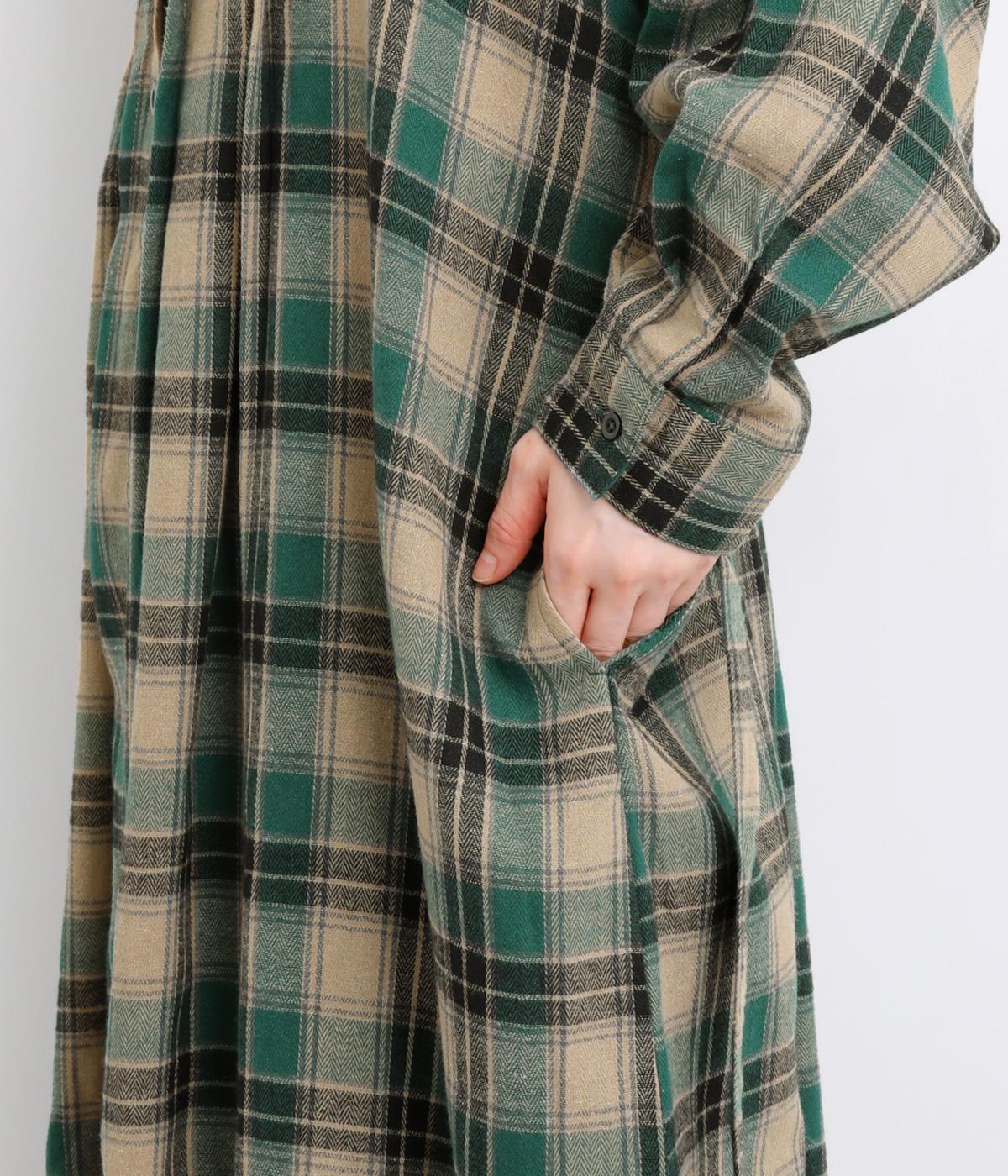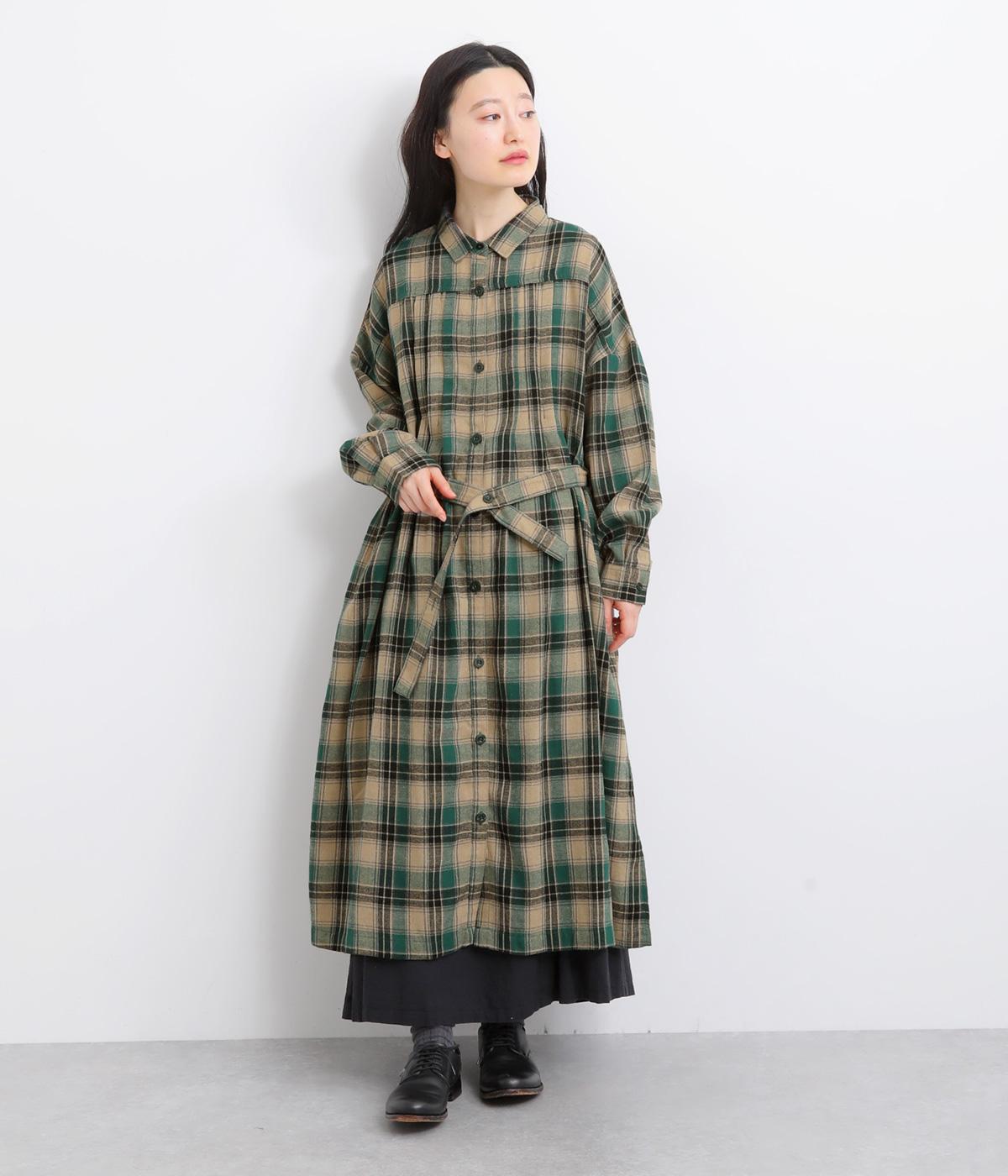 ナチュラルなチェック柄のネル起毛に、繊細なピンタックを入れることで、上品さをプラスしました。ローブのように巻ける紐はボタンでとめられる仕様。前でとめたり、後ろに垂らしたりなど、気分でアレンジができます。ボタンをあけて羽織れば軽やかなコート風にもなる、着まわしに便利なアイテムです。