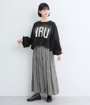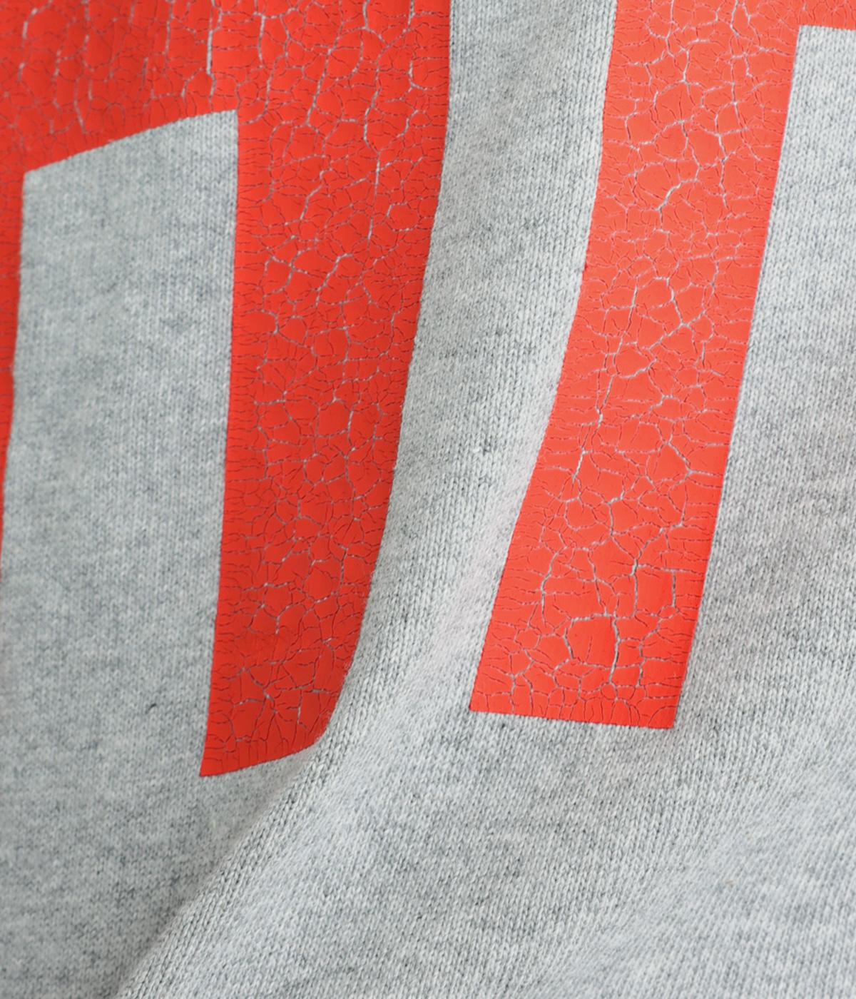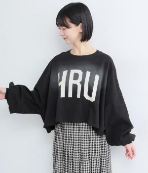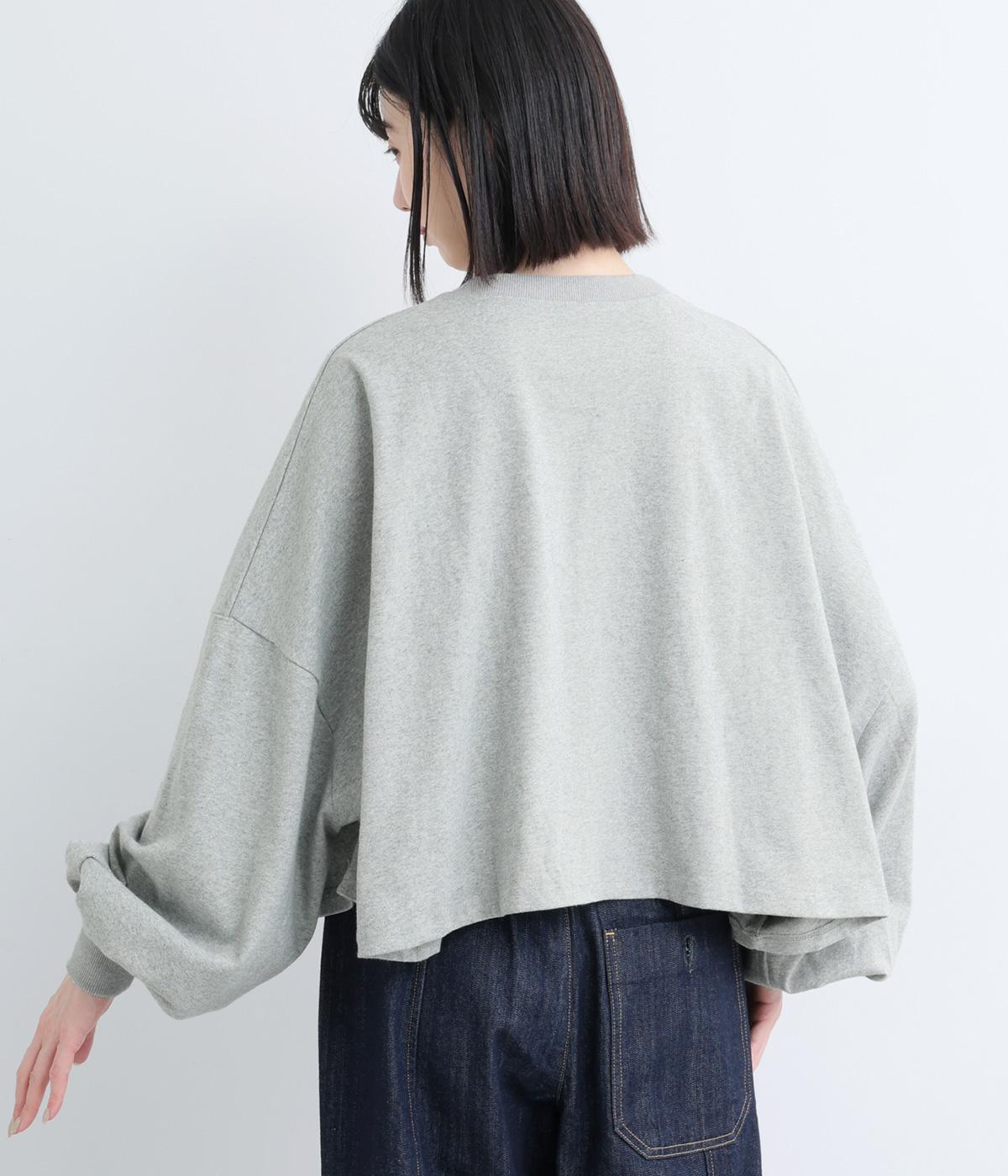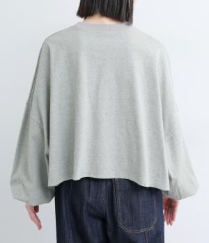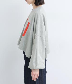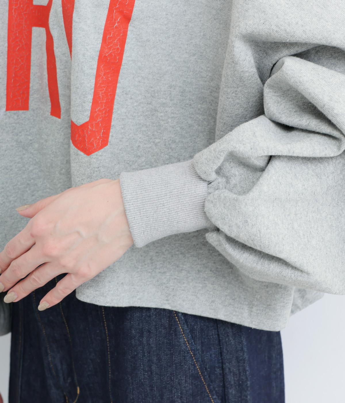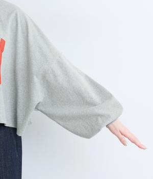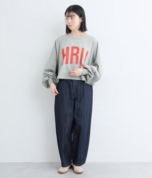 ドロップショルダーにふっくらとした袖のボリューム感と、すっきりカットしたショート丈のバランスが特徴的。ひび割れた大きなロゴプリントもいいアクセントで、こなれ感のある大人のカジュアルスタイルが完成。