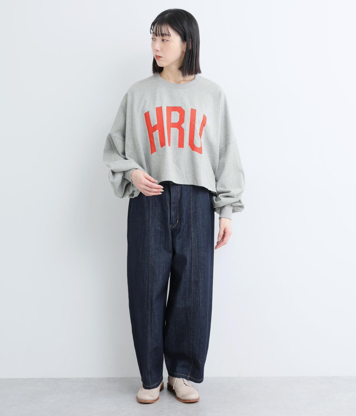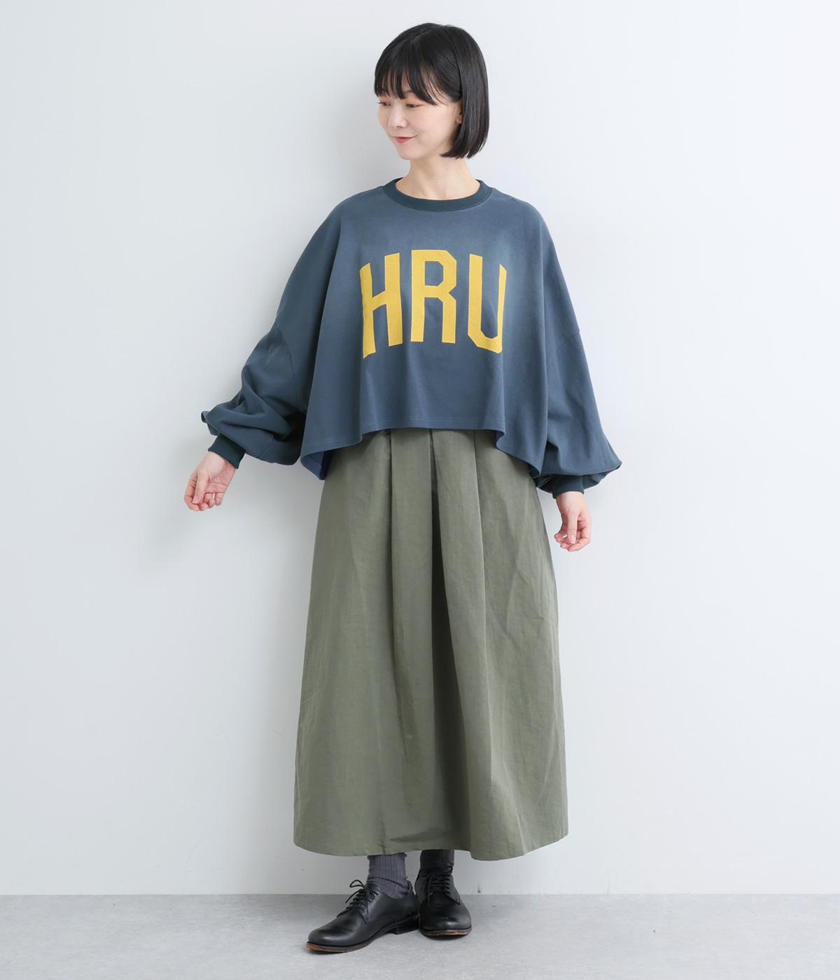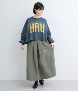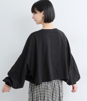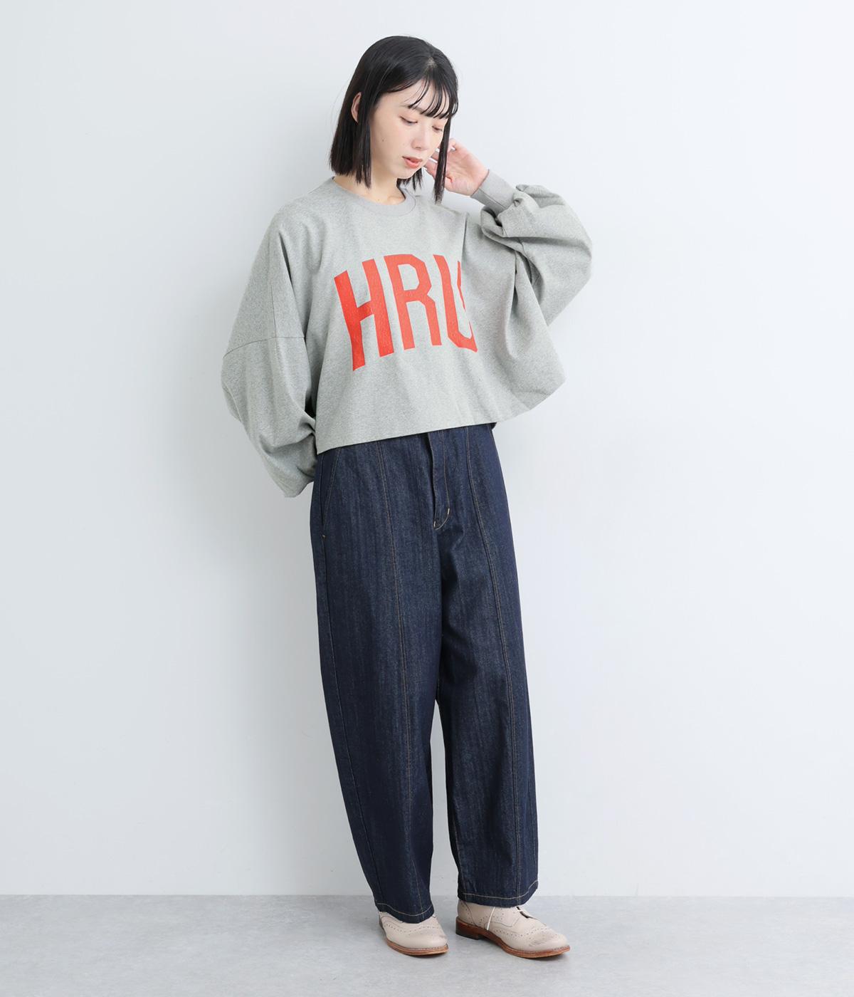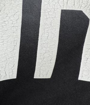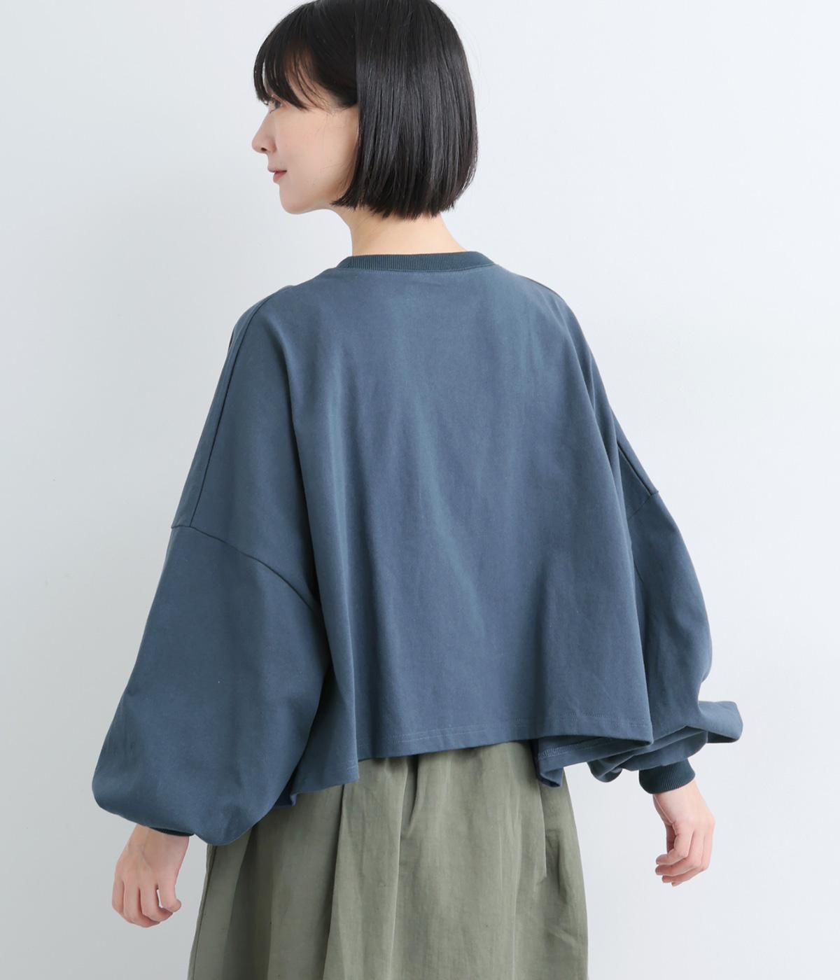 ドロップショルダーにふっくらとした袖のボリューム感と、すっきりカットしたショート丈のバランスが特徴的。ひび割れた大きなロゴプリントもいいアクセントで、こなれ感のある大人のカジュアルスタイルが完成。