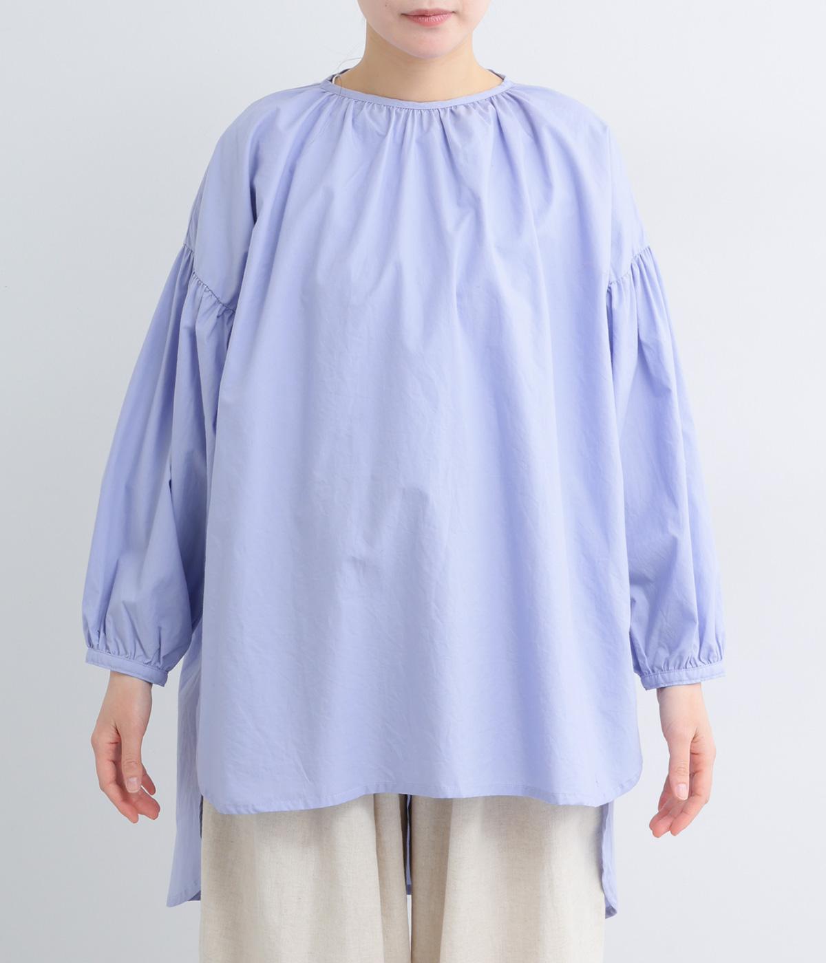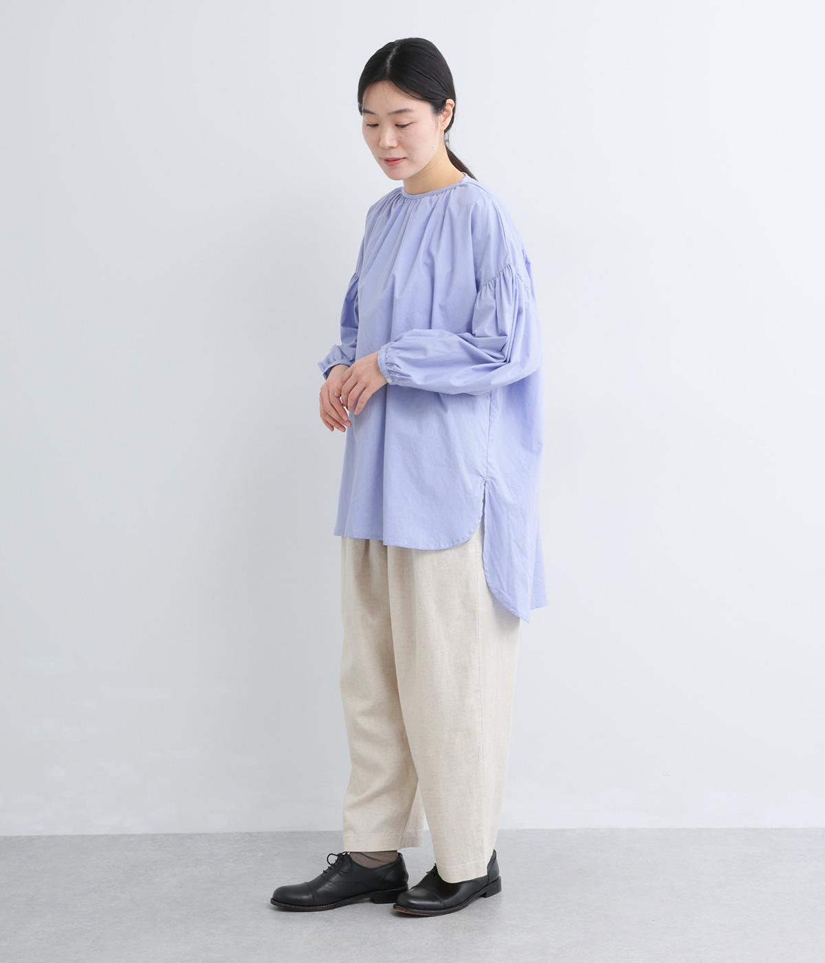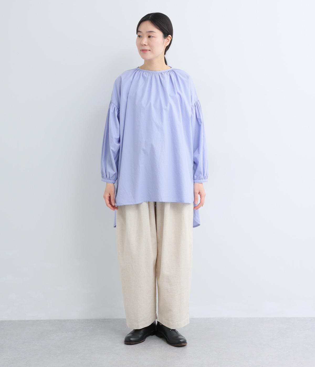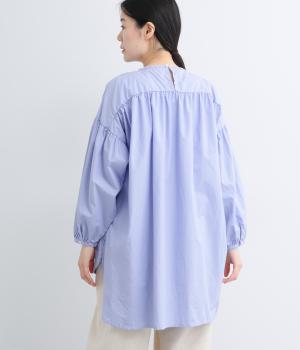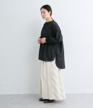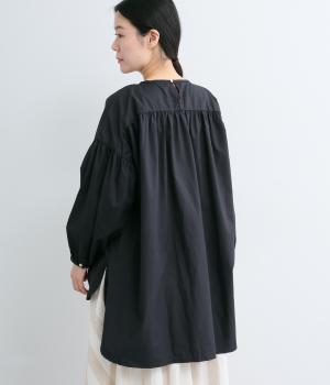 肩にギャザーを寄せたボリューム袖や、前後差をつけた着丈など、ディテールにこだわったブラウスです。どの角度から見ても美しいシルエットを描き、さらりと一枚で着るだけでスタイリングが決まります。