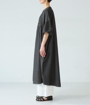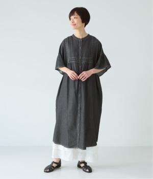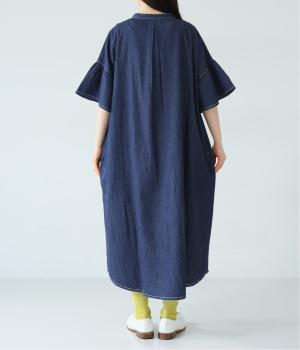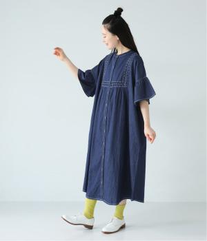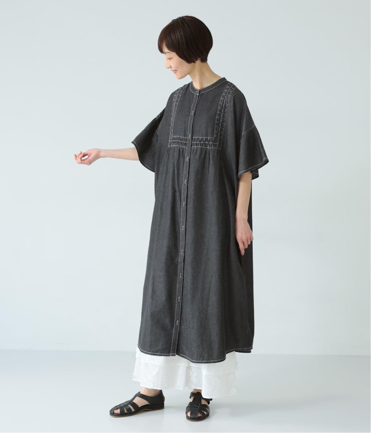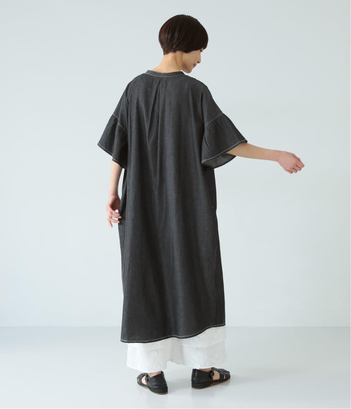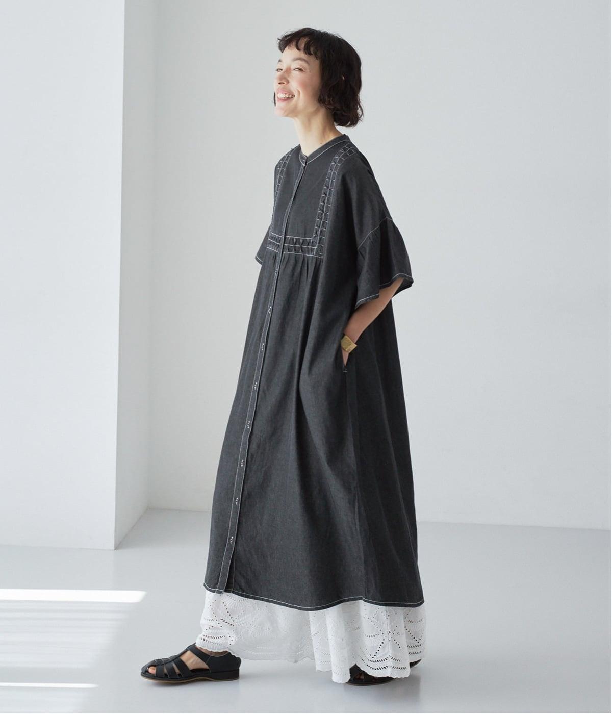 ゆったりとしたシルエットに、胸元の繊細なディテールと袖口のフリルが映えるワンピース。さらりと袖を通すだけで、装いが自然と整います。