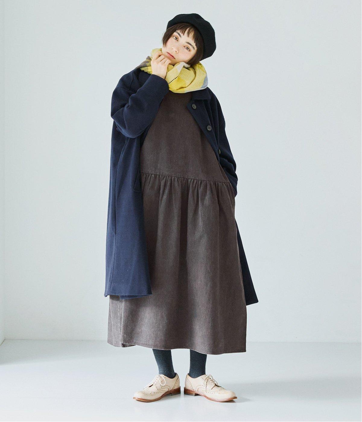アウターを羽織った着こなしも、ちらりと覗くジャンパースカートの独特の風合いが、存在感を引き立てます。