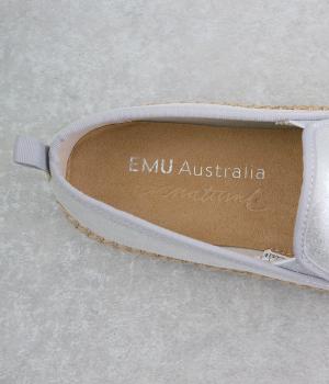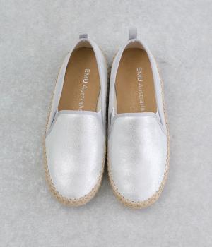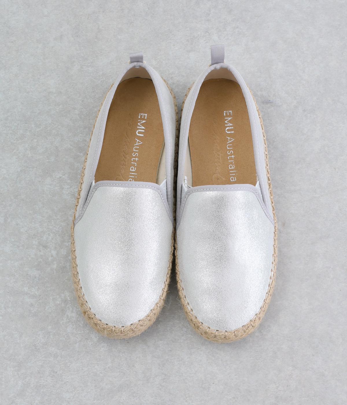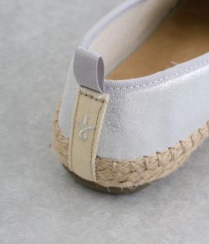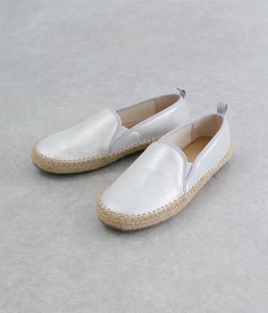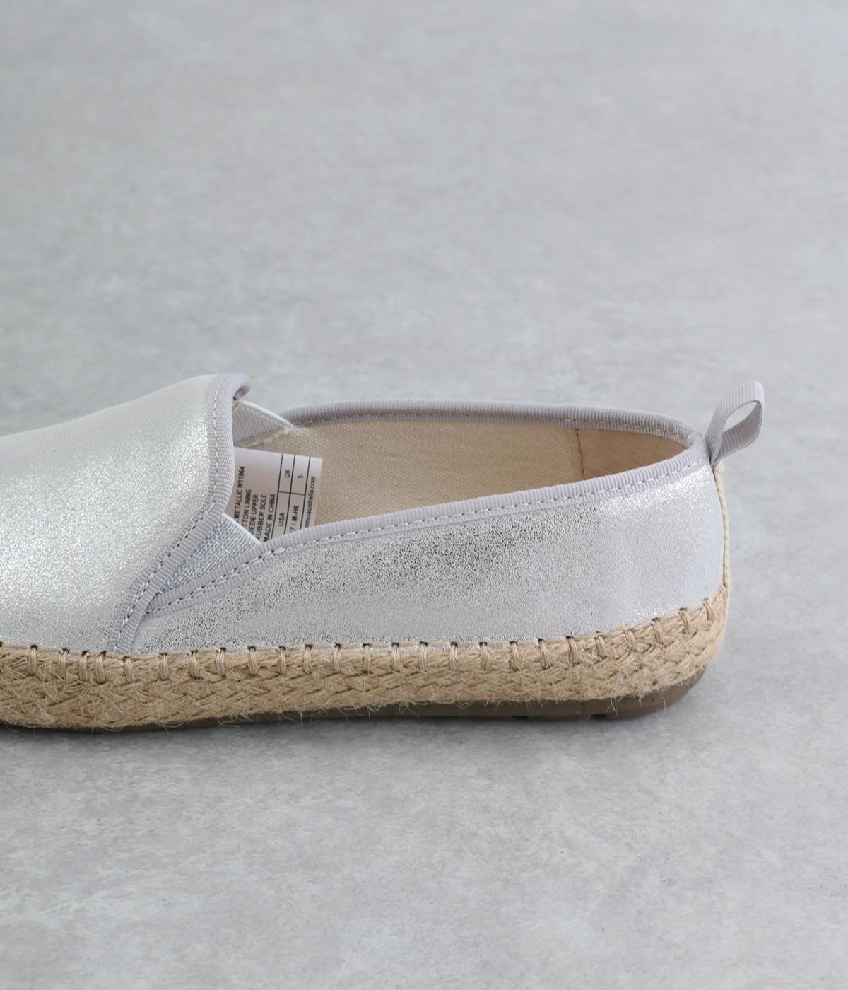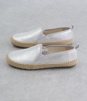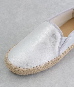 アッパーはシルバーメタリックの牛革でラグジュアリーに、ソールまわりはジュート素材でナチュラル感をプラス。シンプルなデザインに素材のコントラストがきいています。