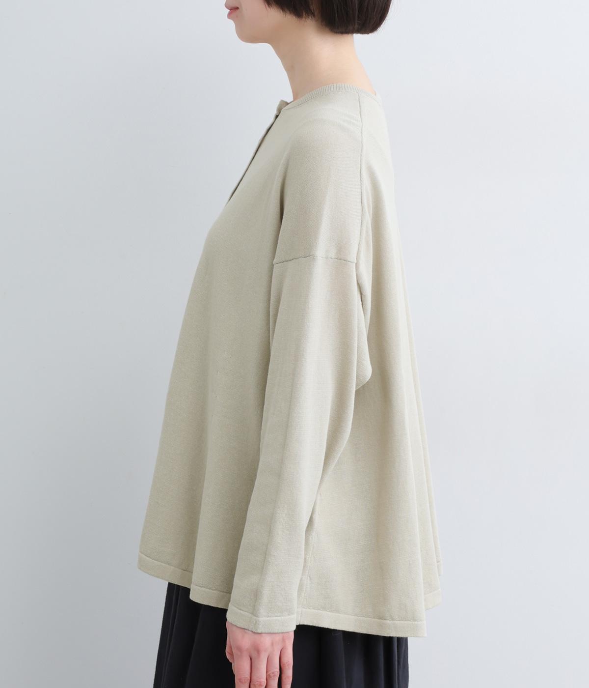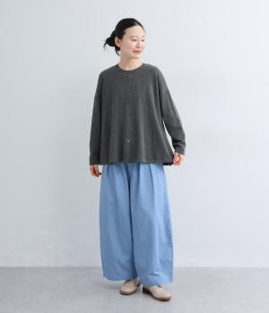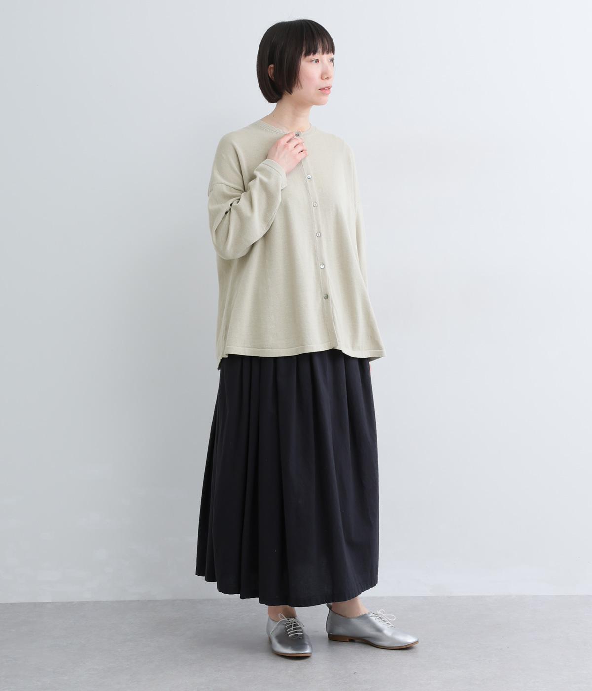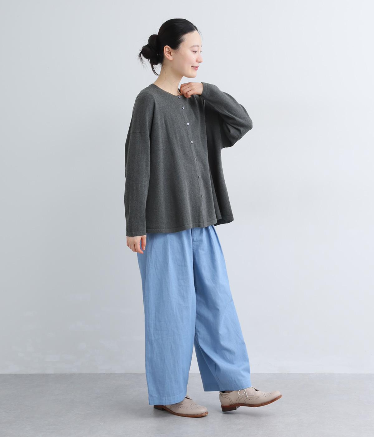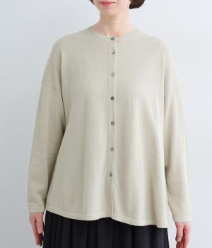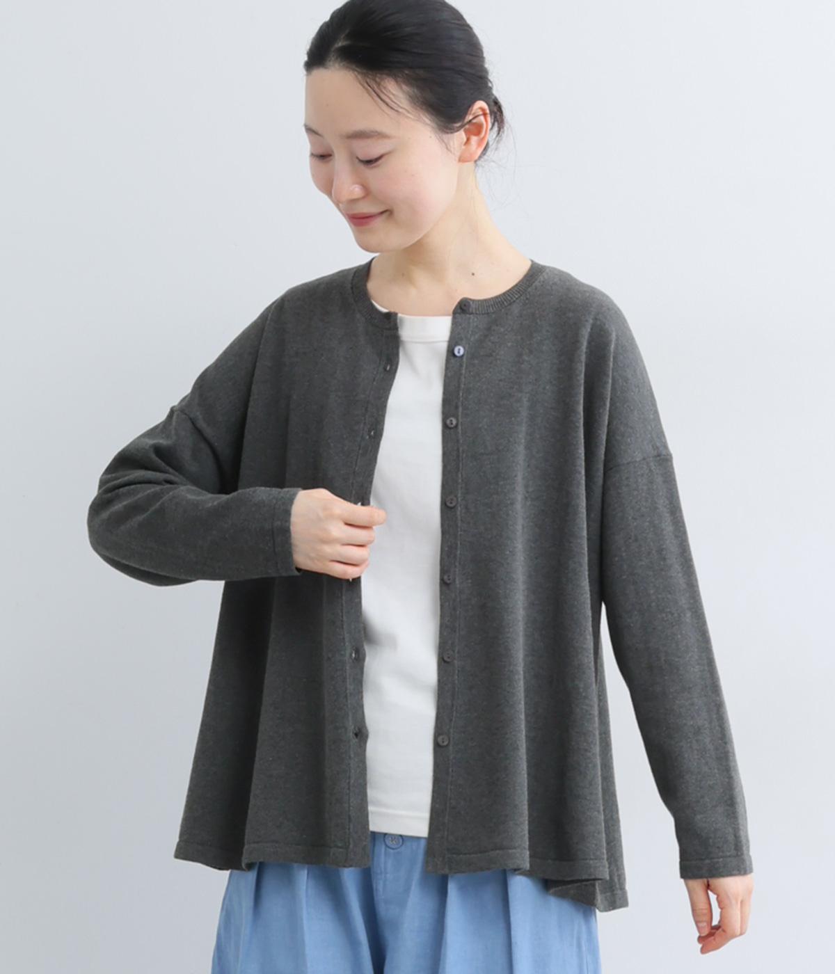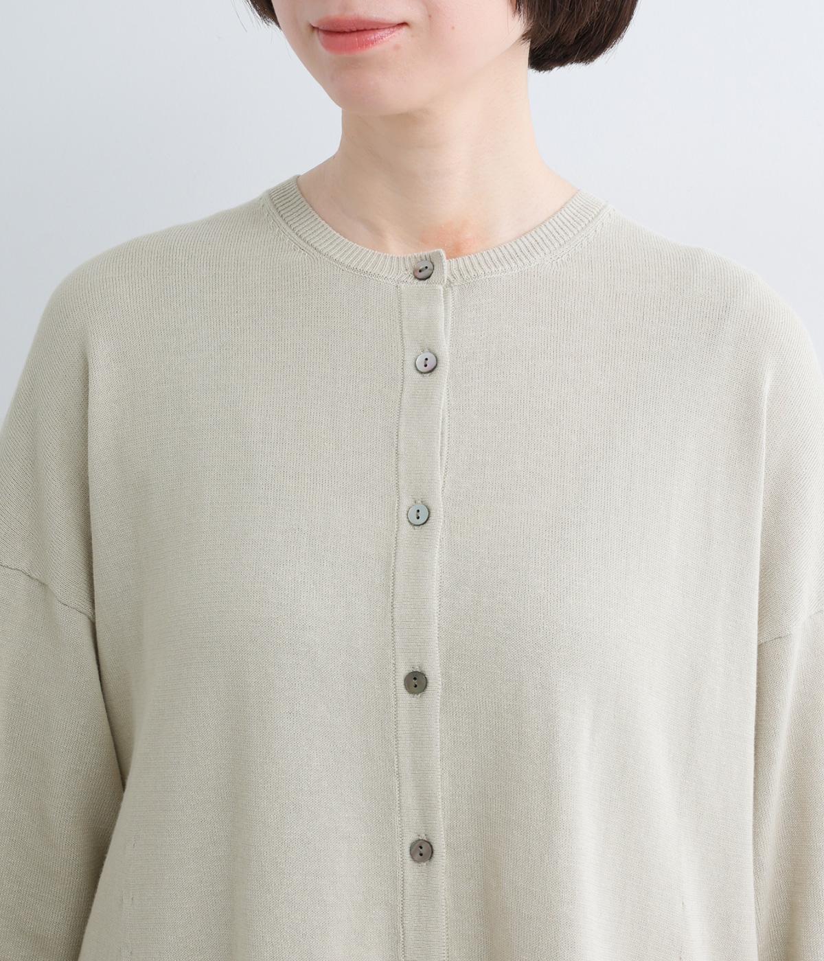 ゆとりのある身幅にドロップショルダーでラフ感を出したカーディガン。シルエットをきれいに描く生地感のおかげでルーズに見えず、カットソーからシャツまで幅広いアイテムと好相性に。品のいい丸首はボタンを留めてプルオーバー感覚で着るのもおすすめ。