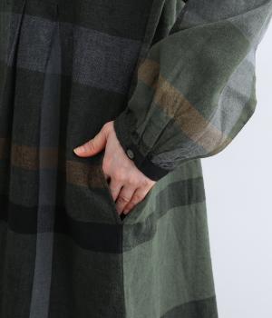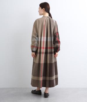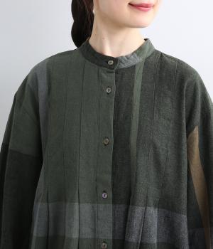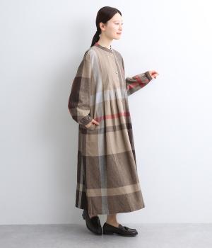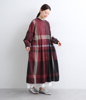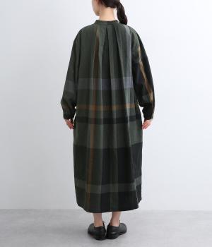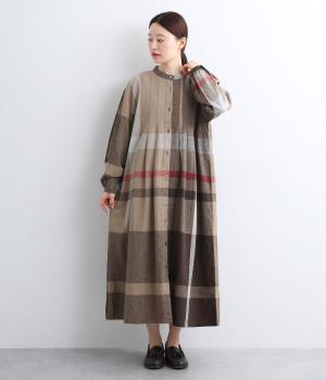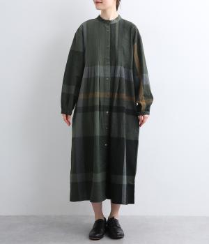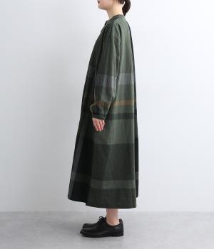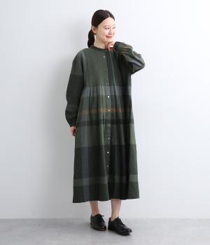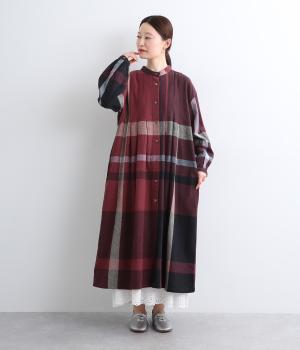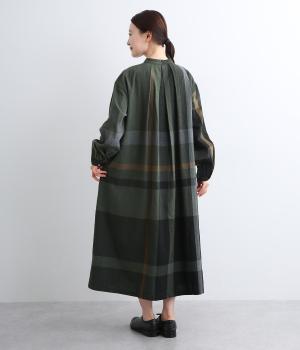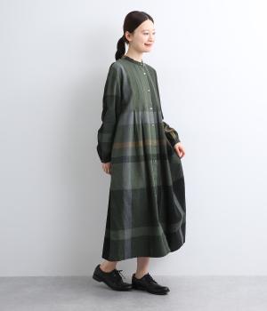 襟もとをすっきりとした印象のバンドカラーに仕立てたワンピースです。前後の肩から入ったタックで、ほどよい分量感を出したシルエット。前ボタンあきなので羽織りとしても重宝するアイテムです。