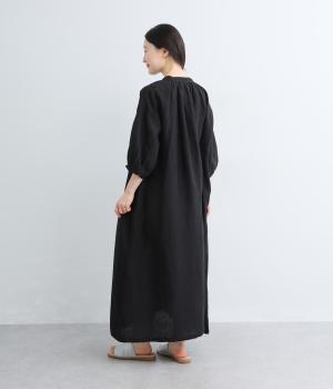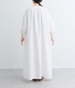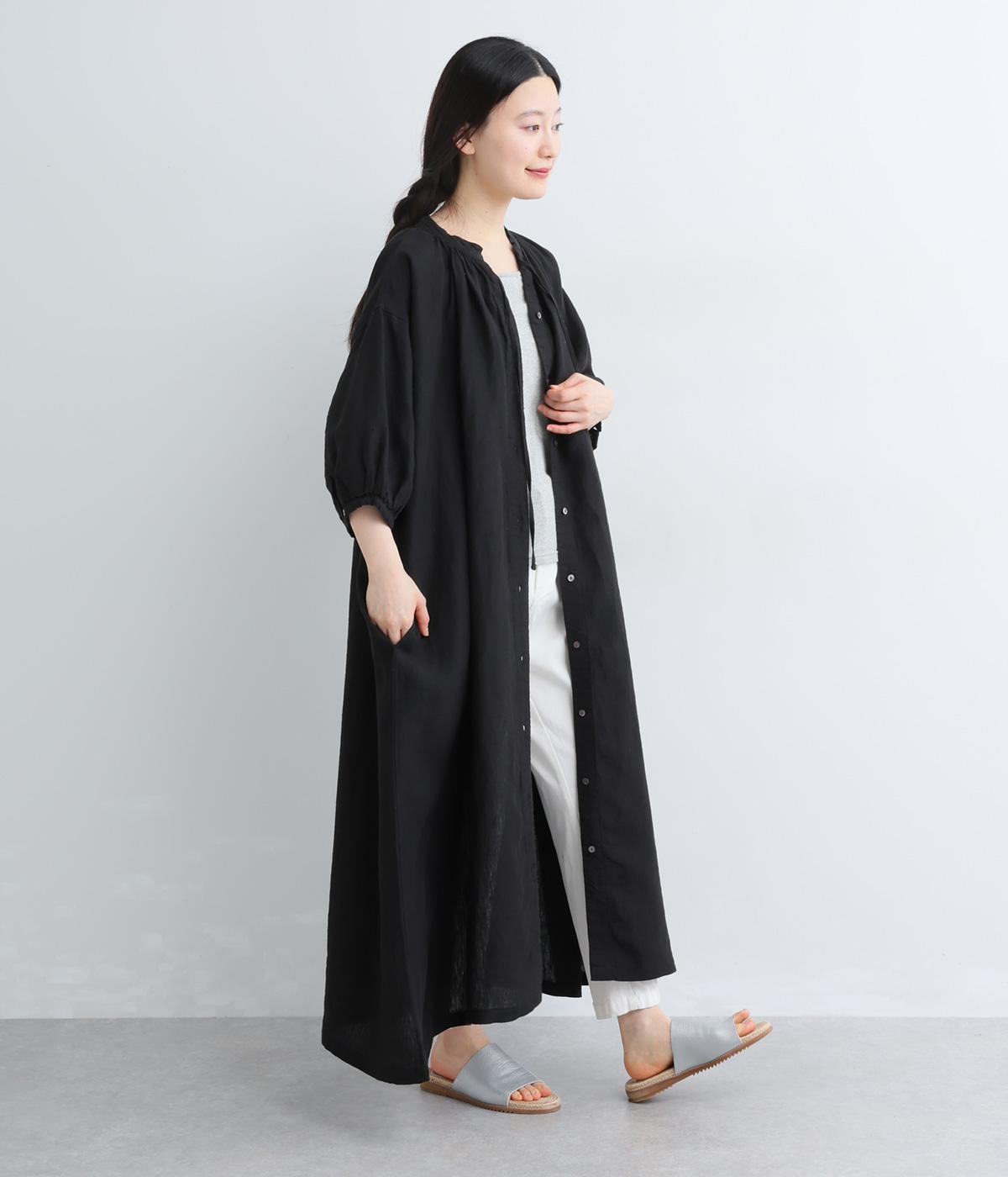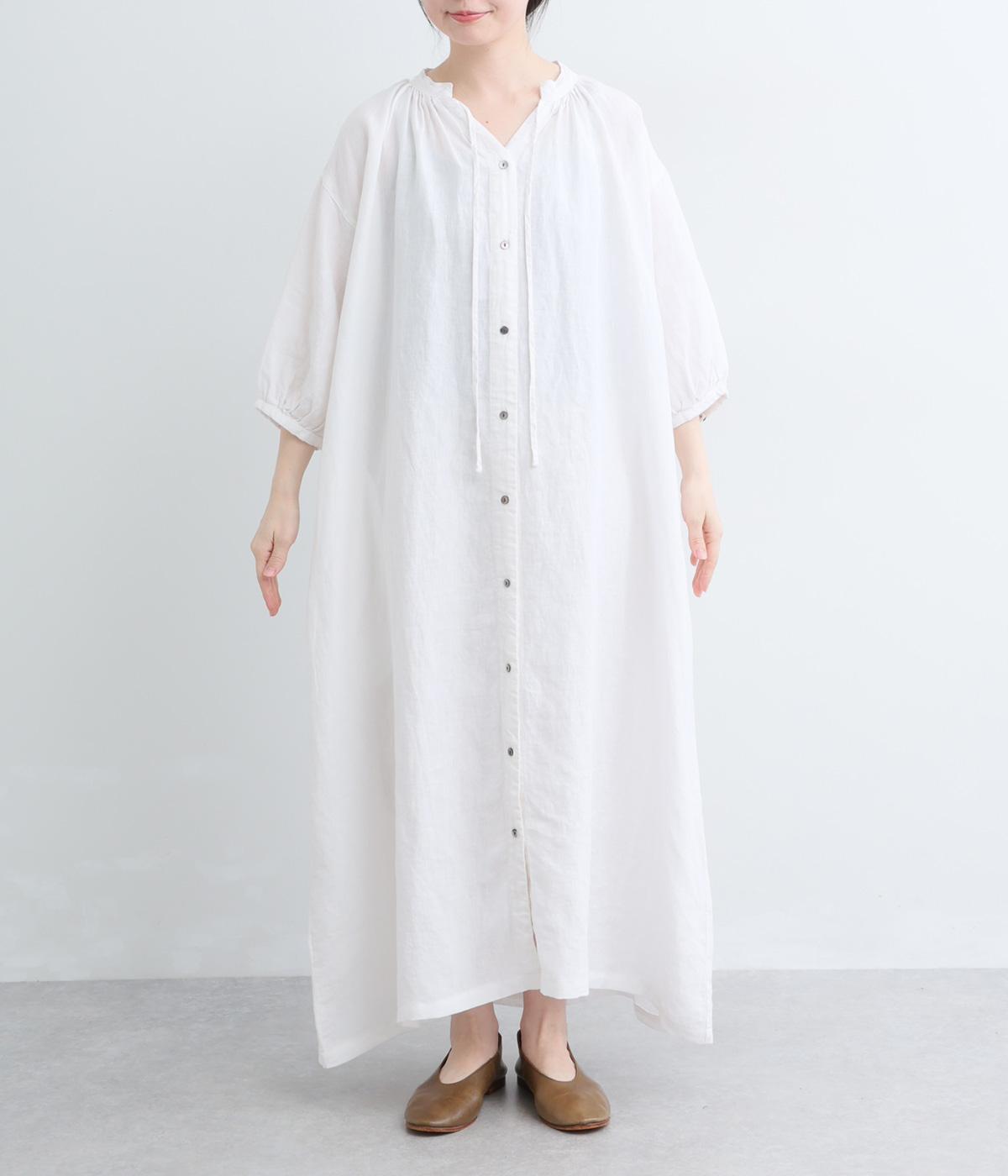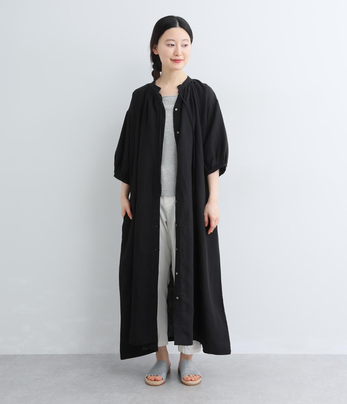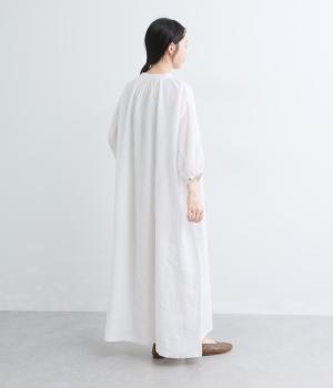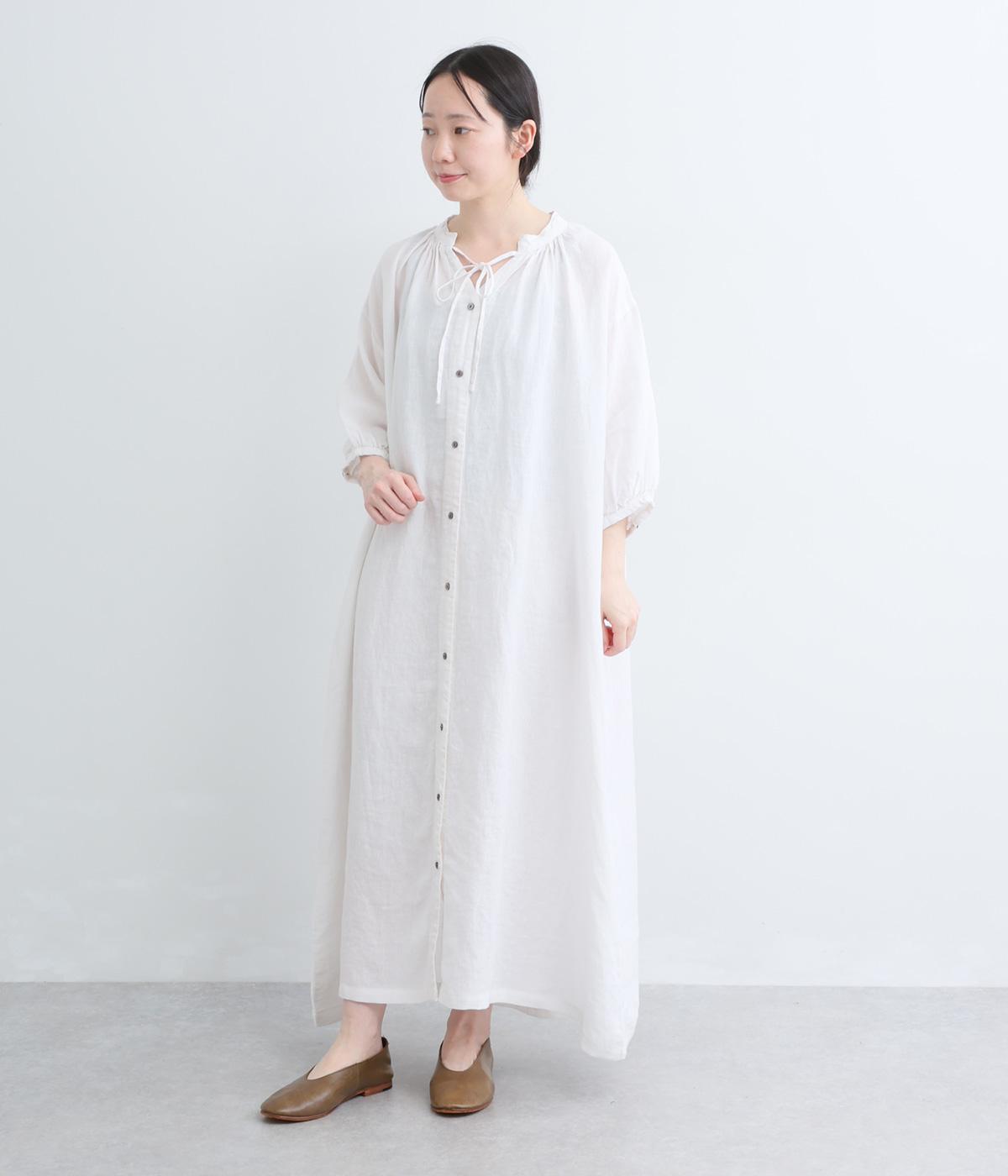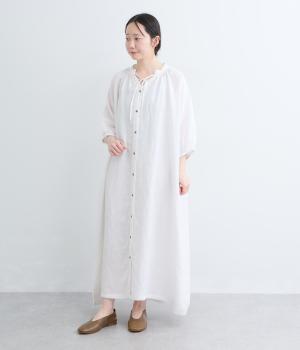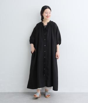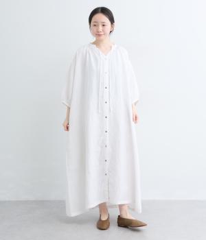 すっきりと開いた首元にリボンを配したギャザーワンピース。前開きで羽織りとしても活躍し、胸もとで可憐に揺れるリボンが軽やかな動きを添えてくれます。手首の出る袖丈で、抜け感のある着こなしが叶います。