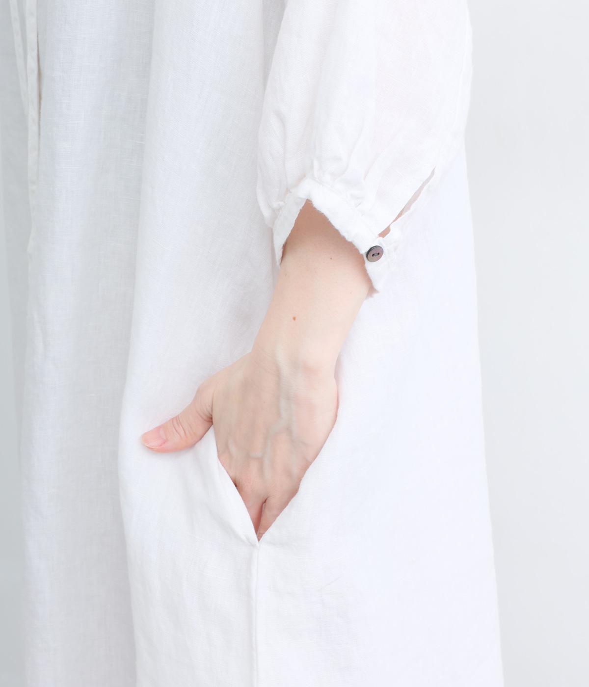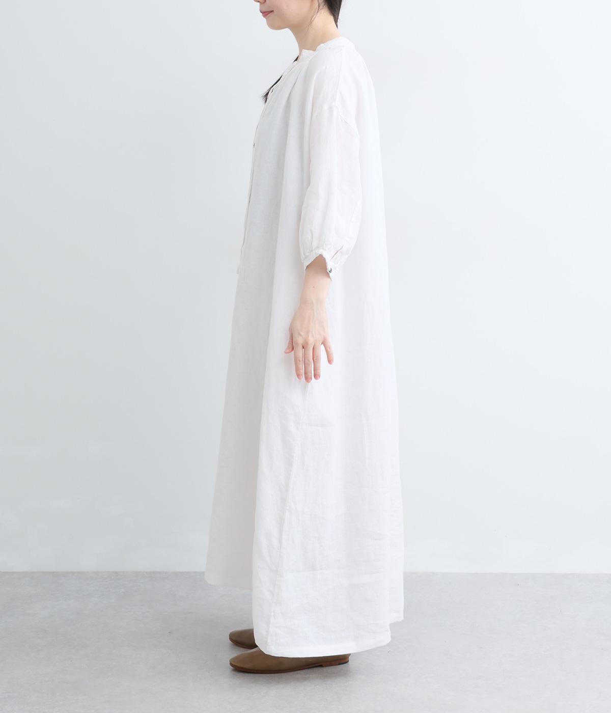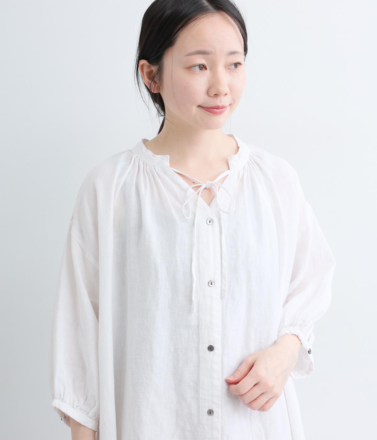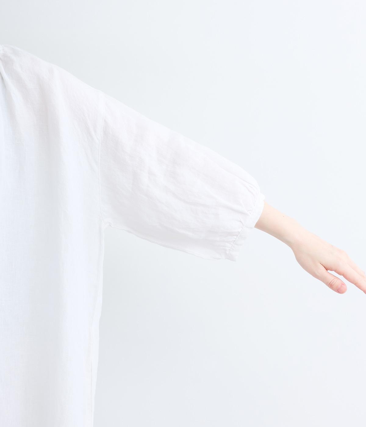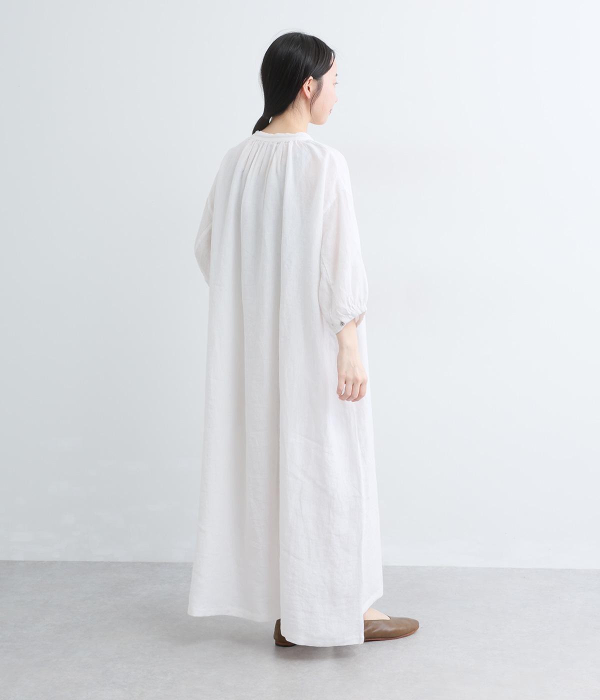 すっきりと開いた首元にリボンを配したギャザーワンピース。前開きで羽織りとしても活躍し、胸もとで可憐に揺れるリボンが軽やかな動きを添えてくれます。手首の出る袖丈で、抜け感のある着こなしが叶います。