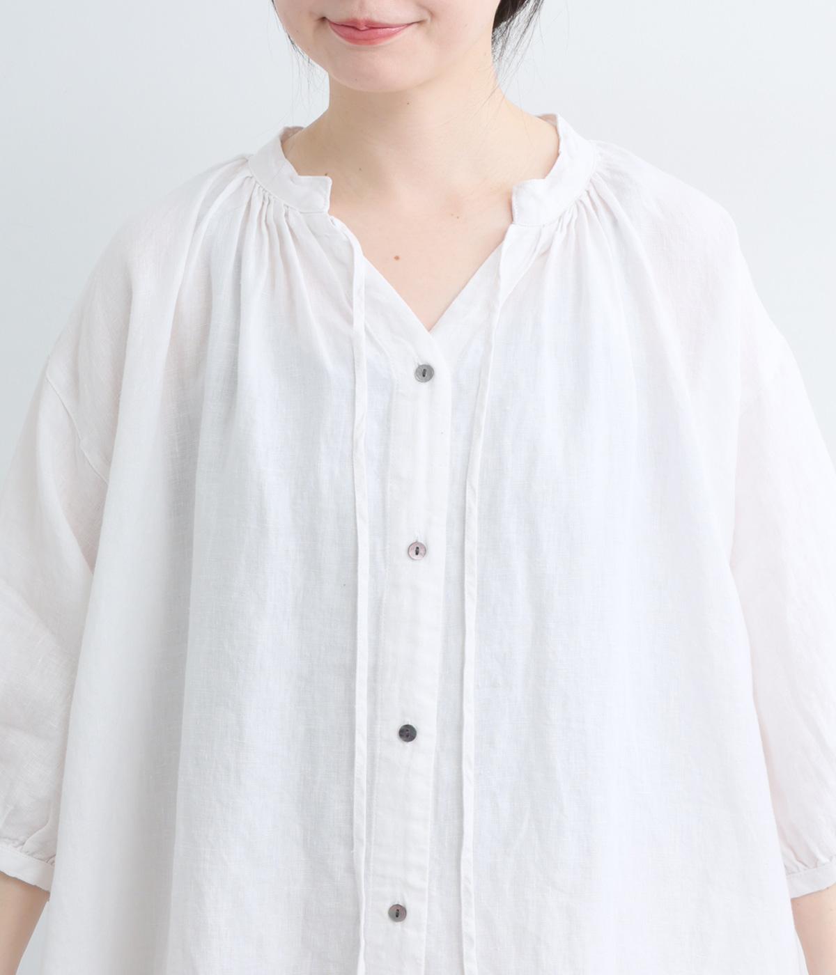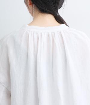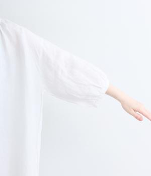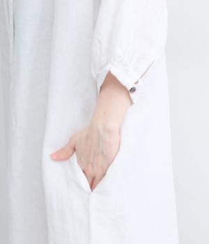 コシのあるリネン生地を使用しています。さらりと清涼感のある肌ざわりです。ネップ混じりの温かみのある質感で、天然素材ならではの風合いを楽しめる仕上がりです。