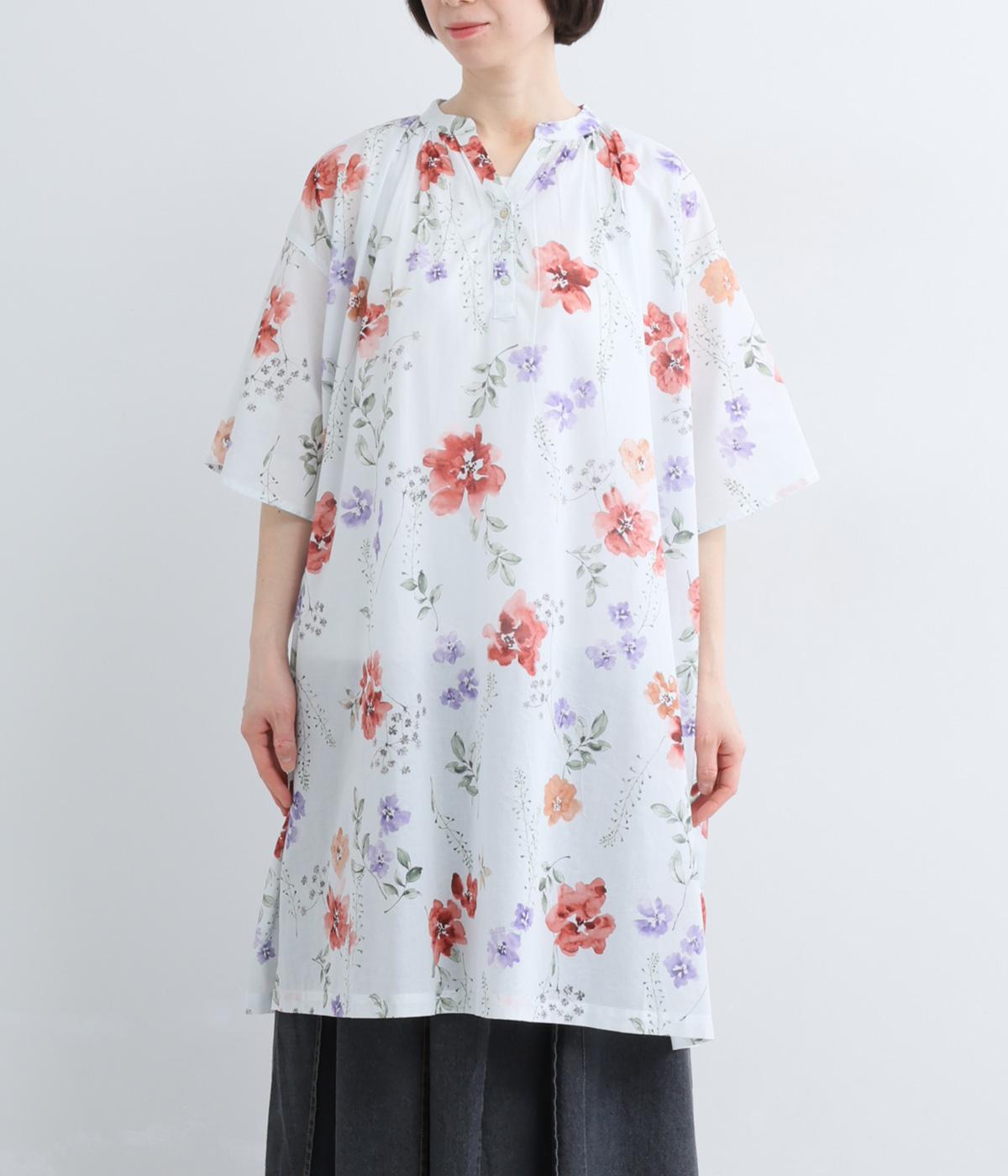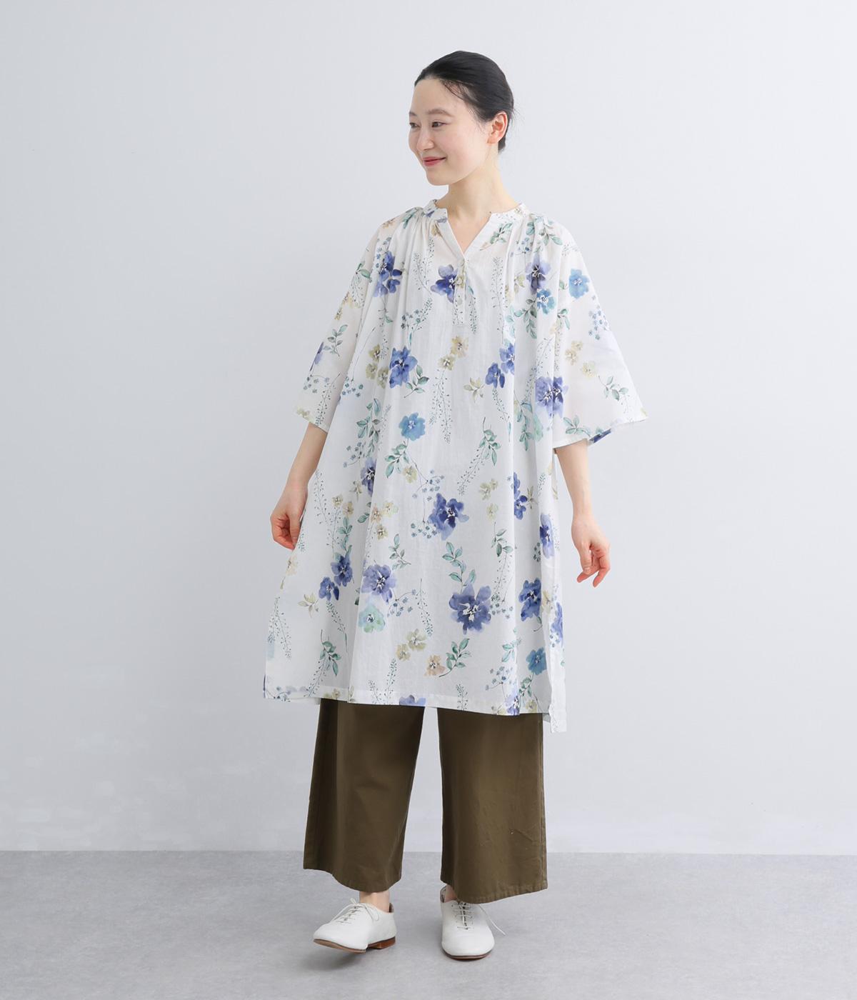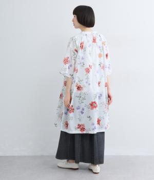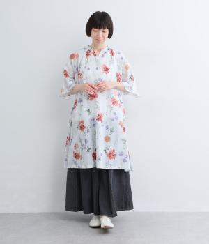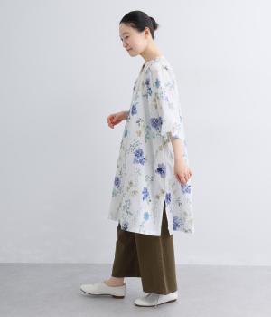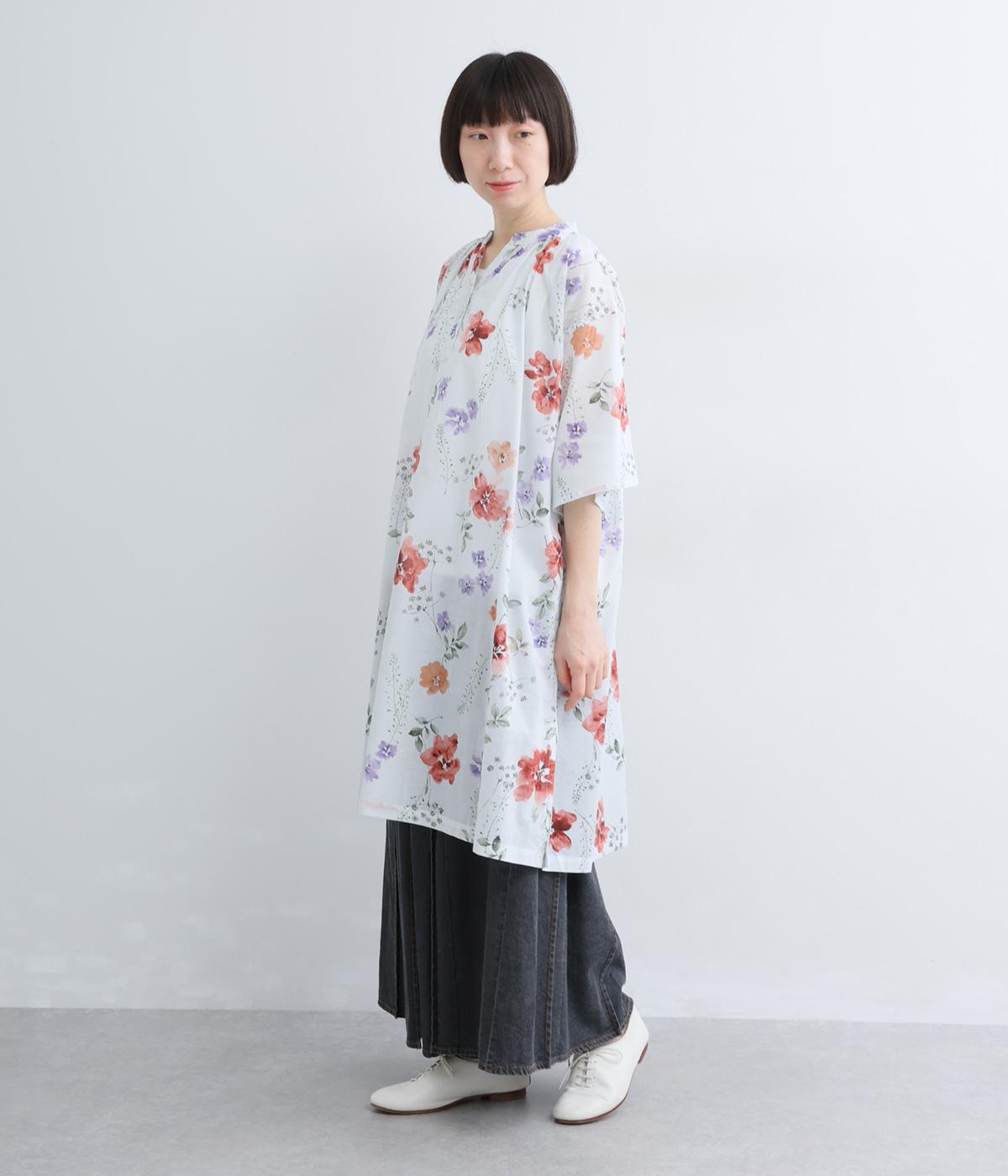 水彩画のような滲んだフラワープリントが、儚くも雰囲気のあるワンピース。ひざあたりのハーフ丈にサイドスリット入りで、ボトムとのレイヤードがたのしめます。キーネックで顔まわりには抜け感をプラスし、さわやかな着こなしを生みます。