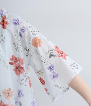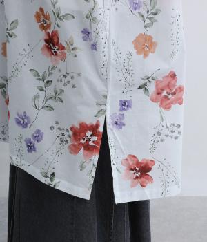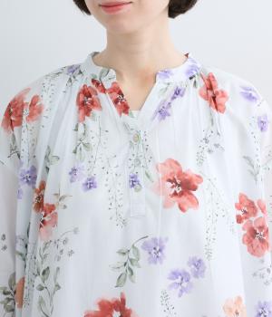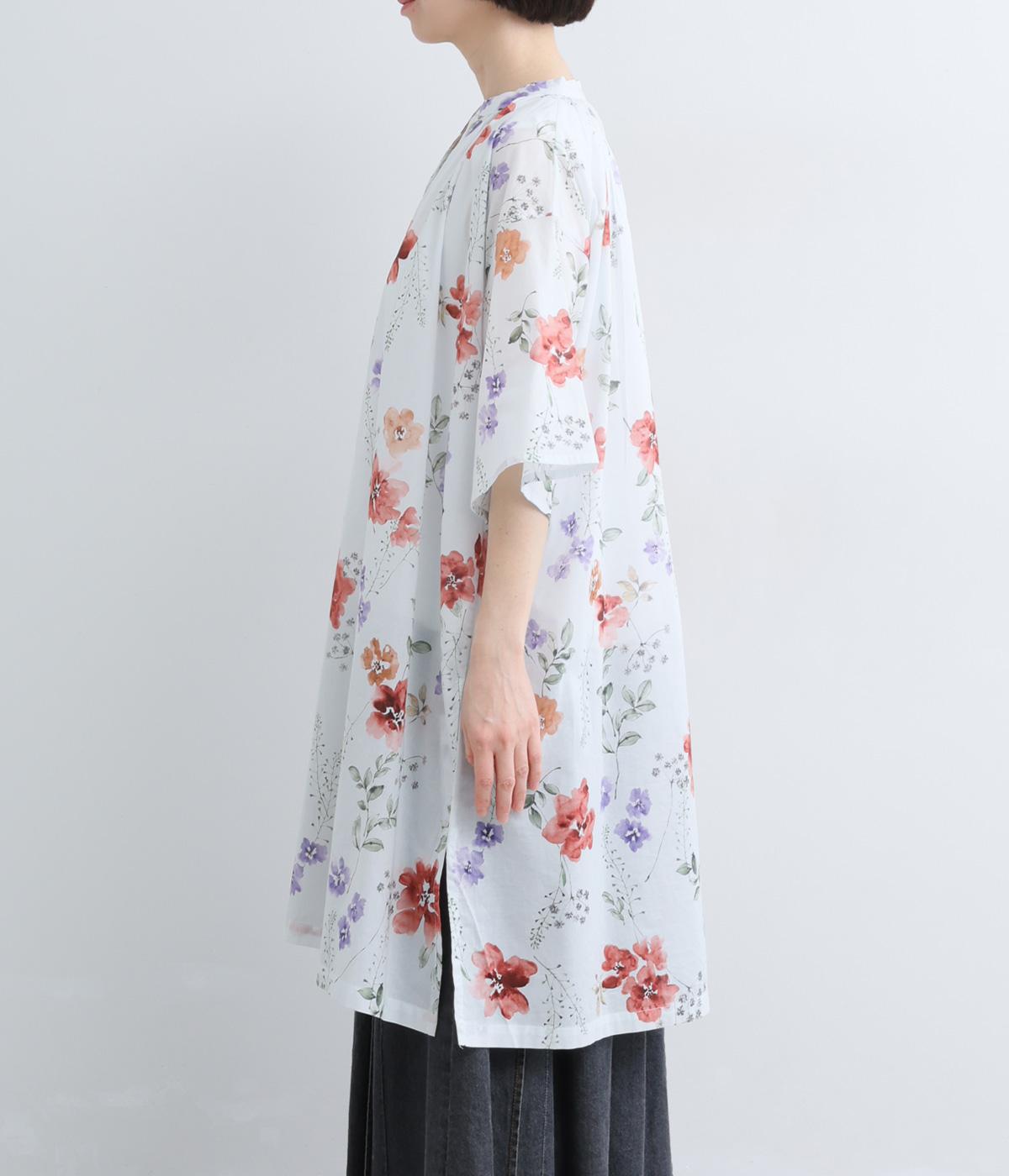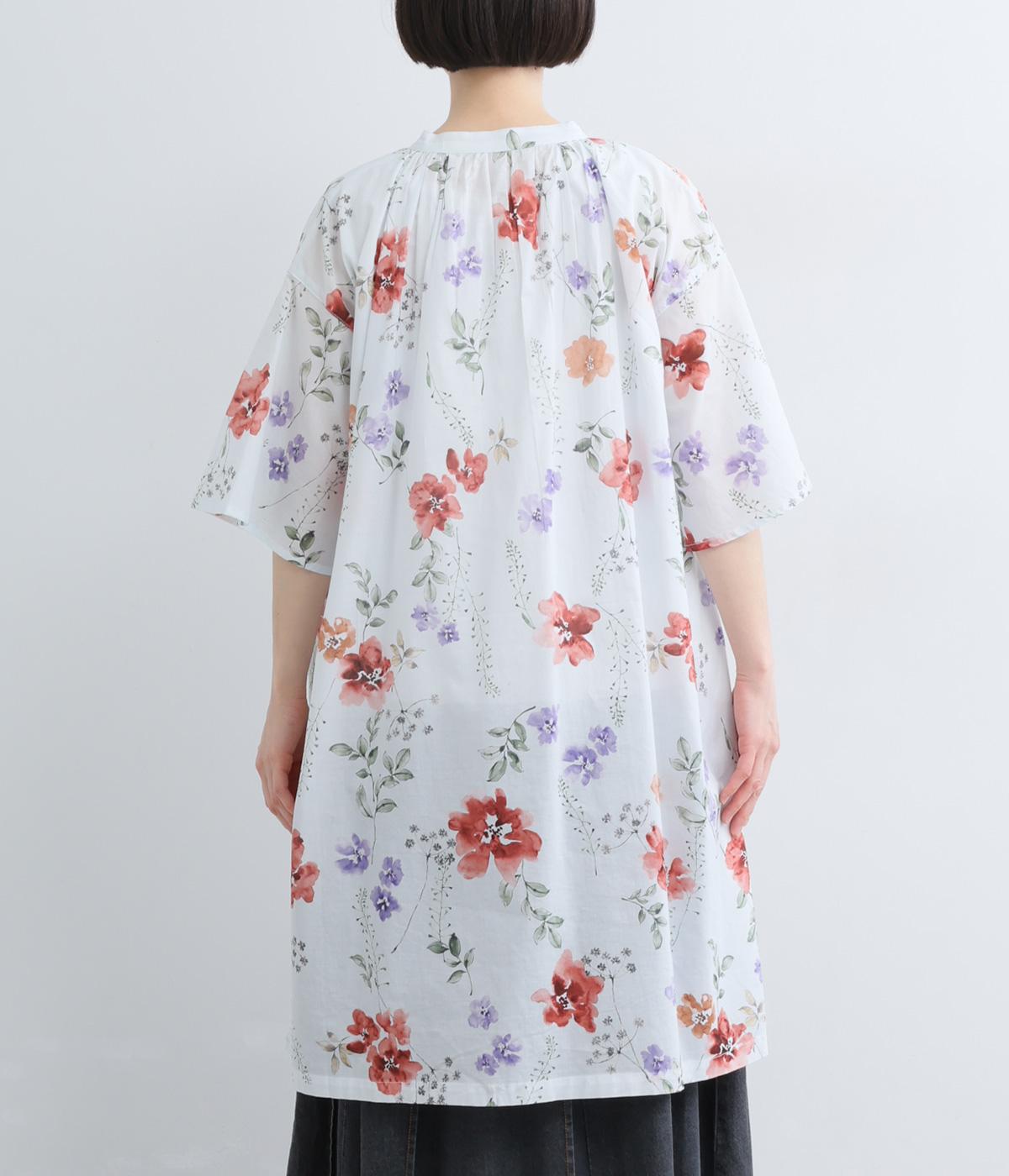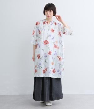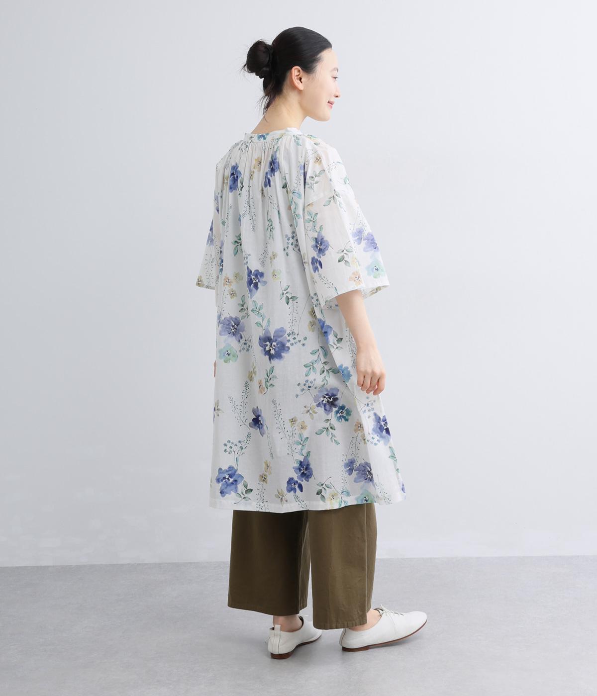 水彩画のような滲んだフラワープリントが、儚くも雰囲気のあるワンピース。ひざあたりのハーフ丈にサイドスリット入りで、ボトムとのレイヤードがたのしめます。キーネックで顔まわりには抜け感をプラスし、さわやかな着こなしを生みます。