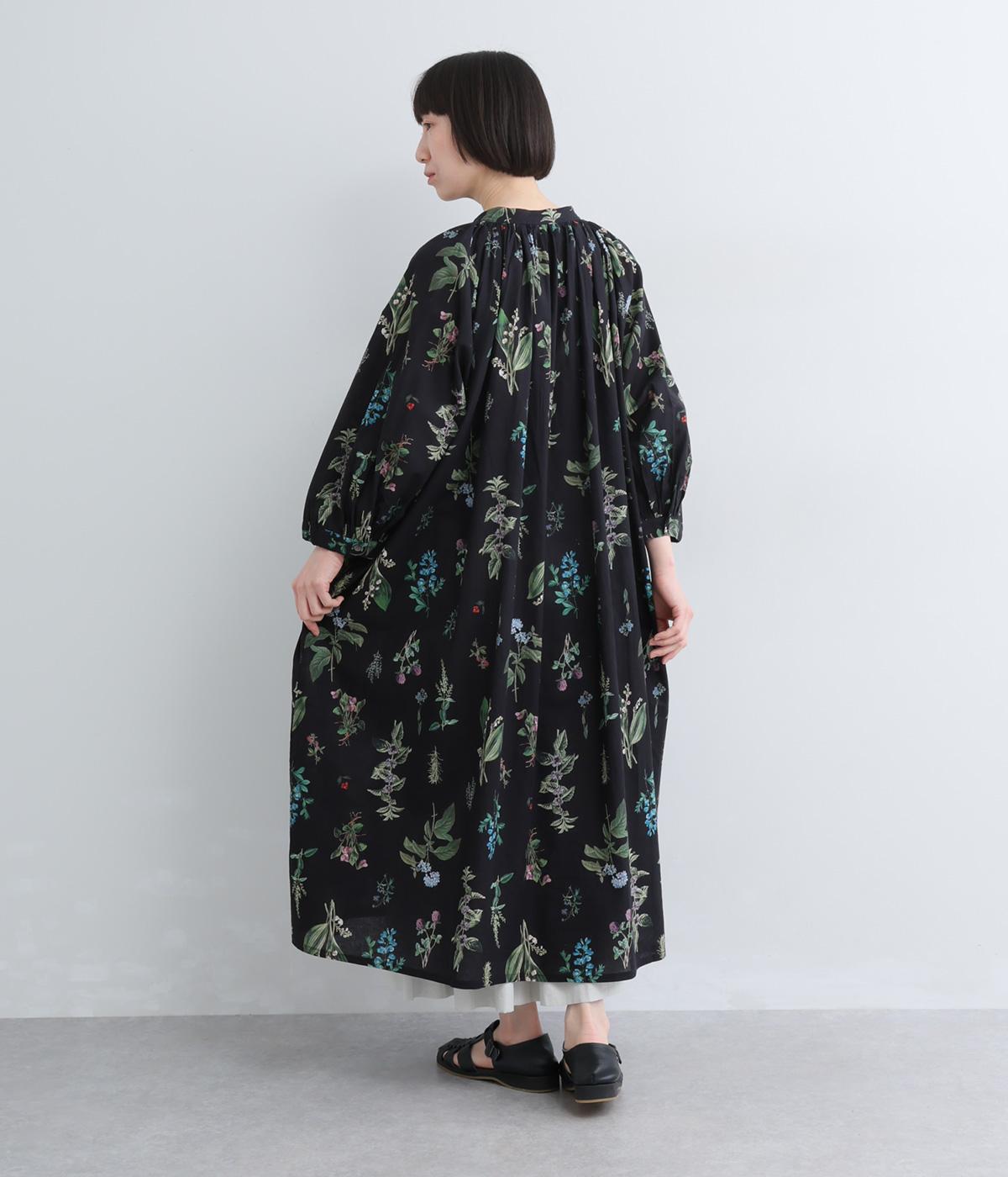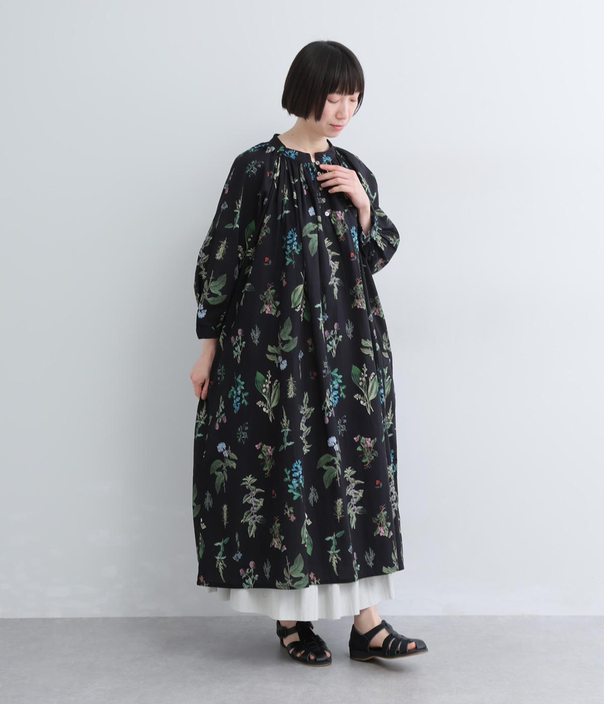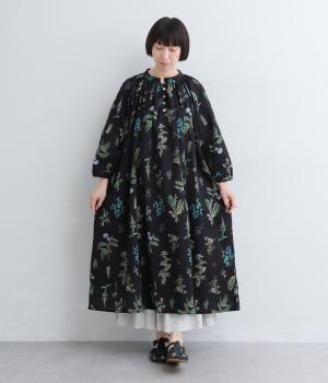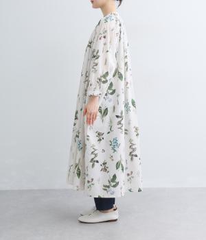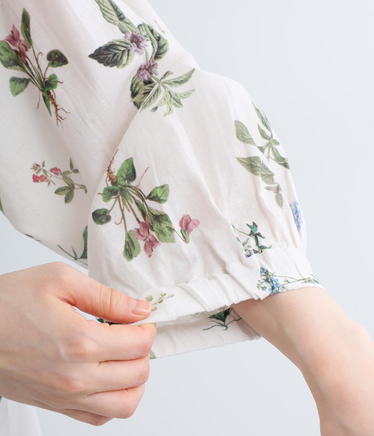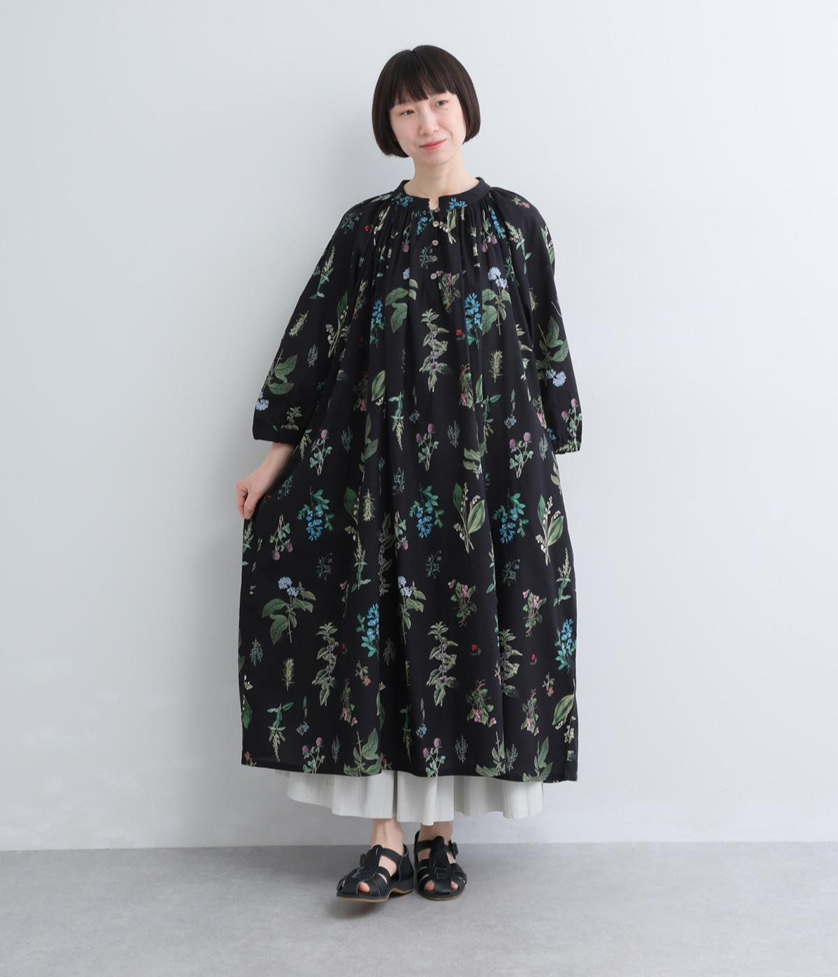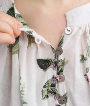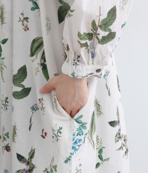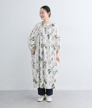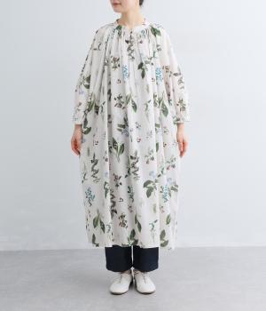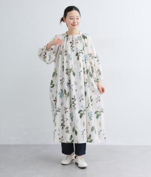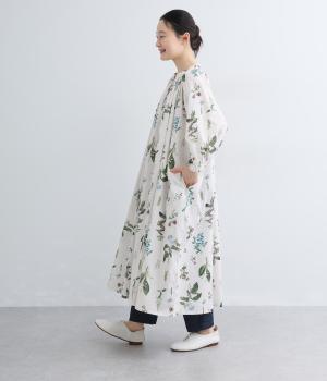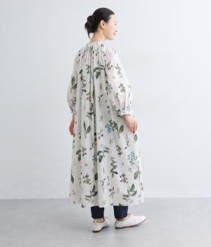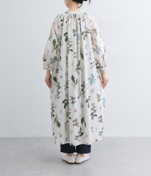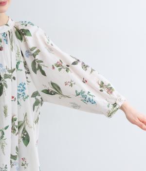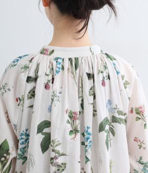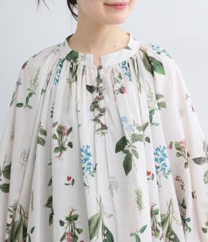 繊細なボタニカルプリントに涼感のある素材で、ナチュラルスタイルに華やかさを添える一着。襟ぐりにたっぷりギャザーを寄せてボリューム感を出し、顔まわりな抜け感のあるヘンリー仕立てに。袖口はゴムを入れているので、たくし上げても◎。