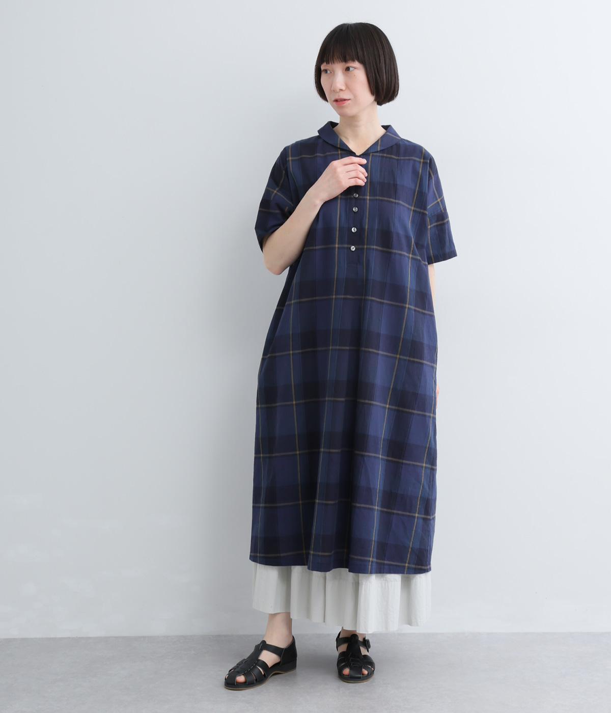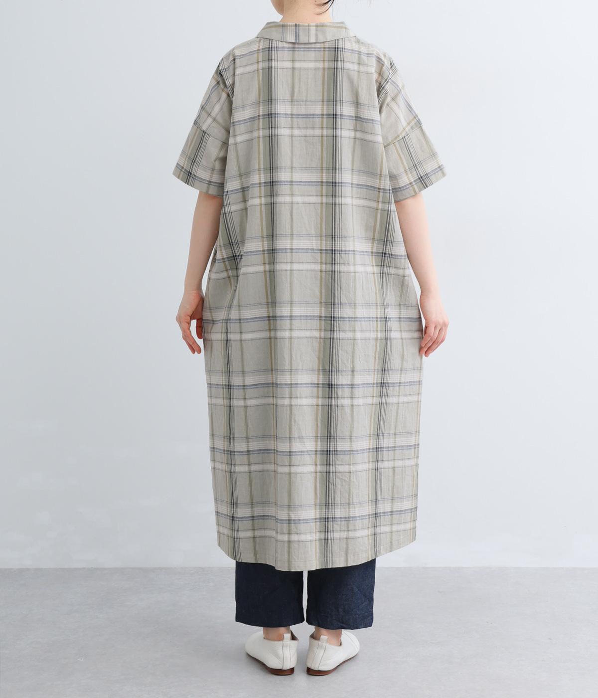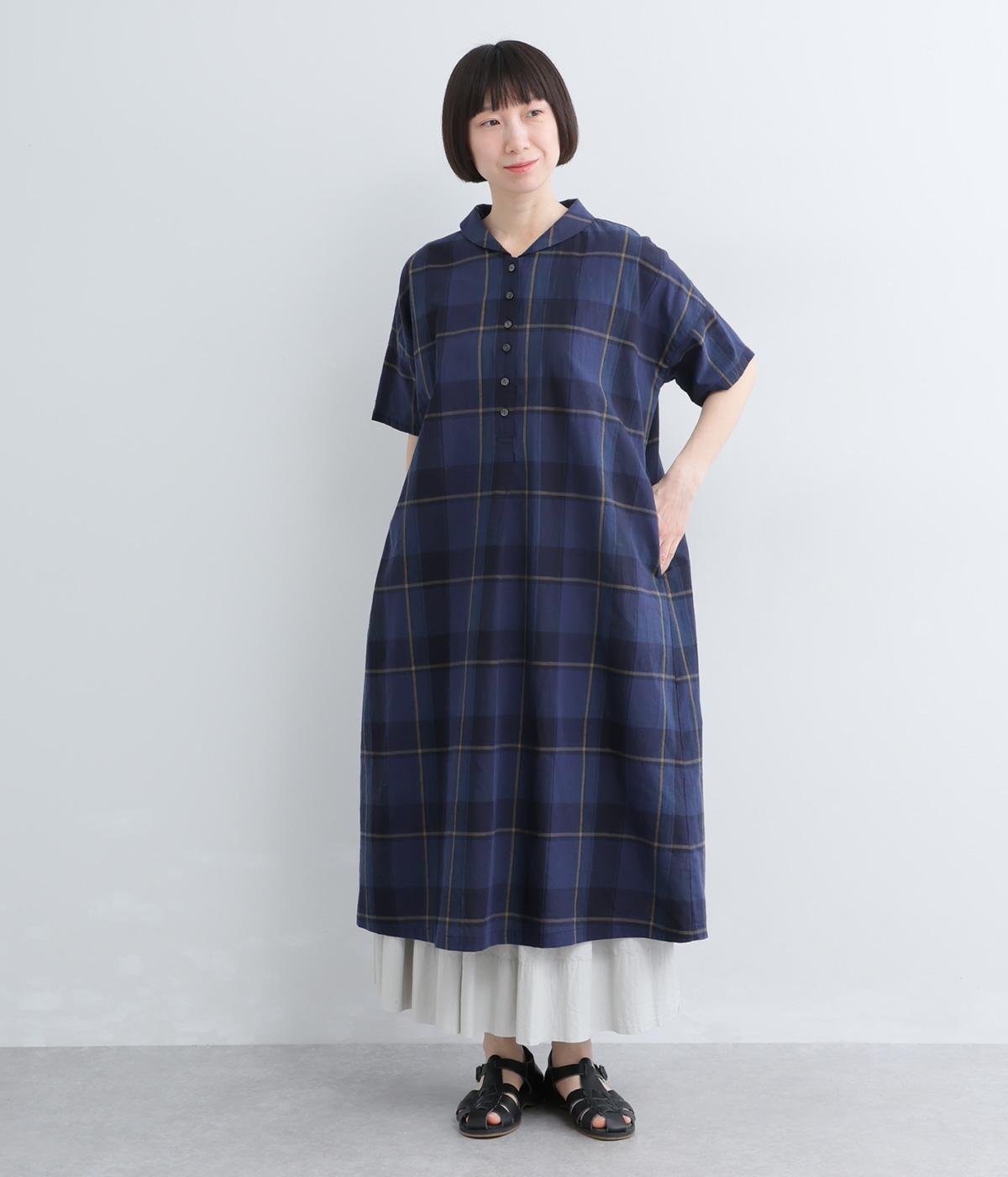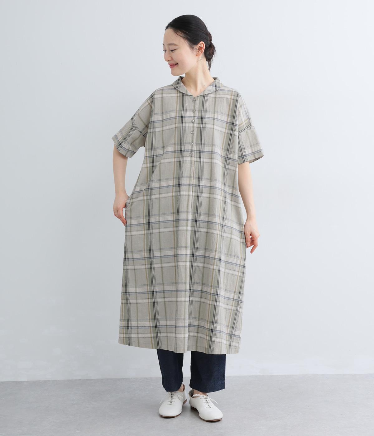 ショールカラーにチェック柄でさわやかにまとめたワンピース。適度にゆとりを持たせながらも広がりすぎないシルエットが着こなしやすく、ボトムとのレイヤードがおすすめ。ヘンリーネック仕様で脱ぎ着しやすく、トップボタンをあけて抜け感を出しても◎。