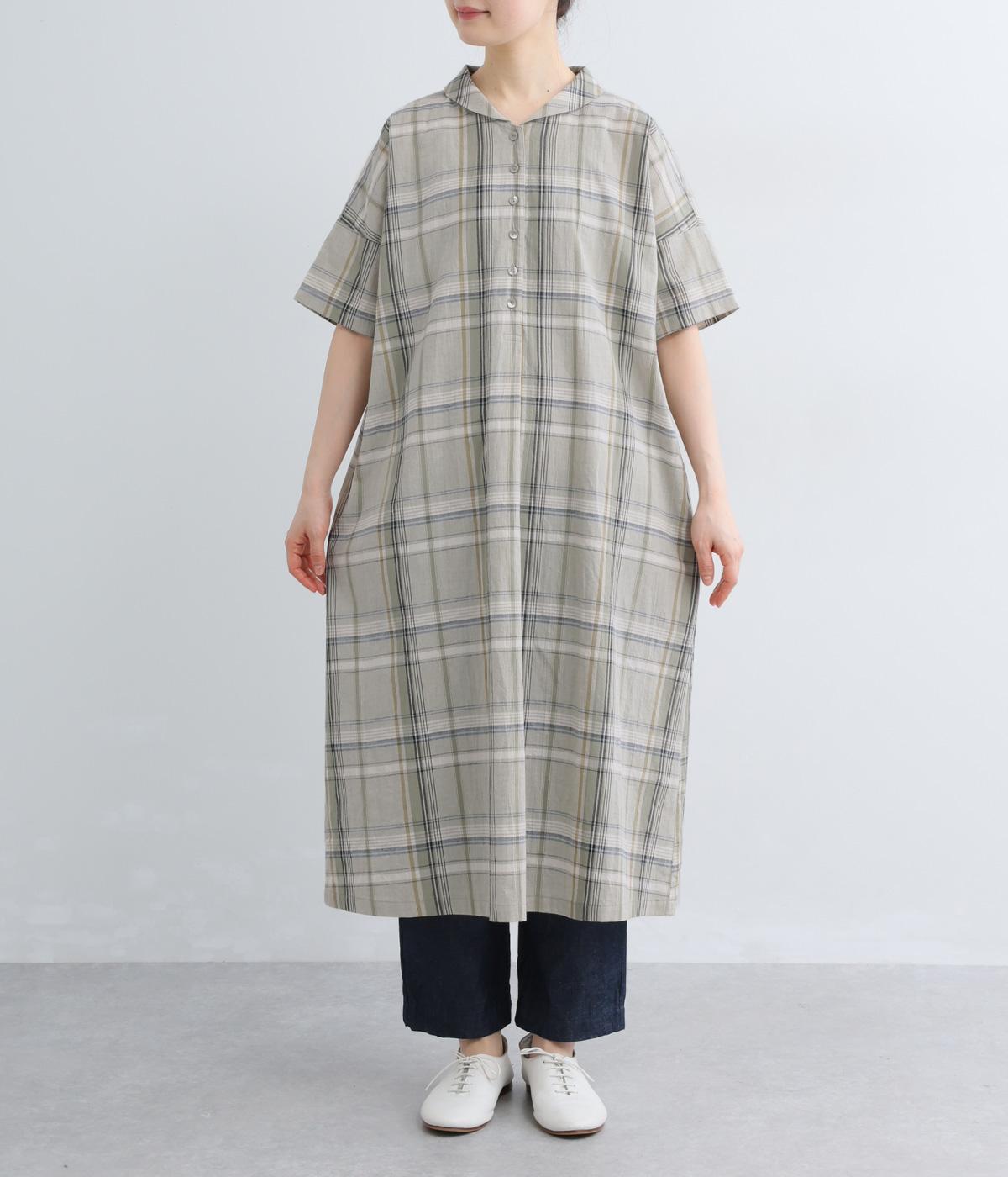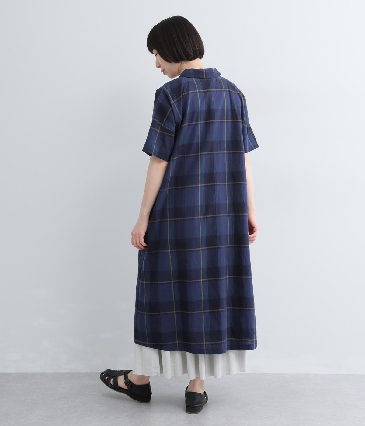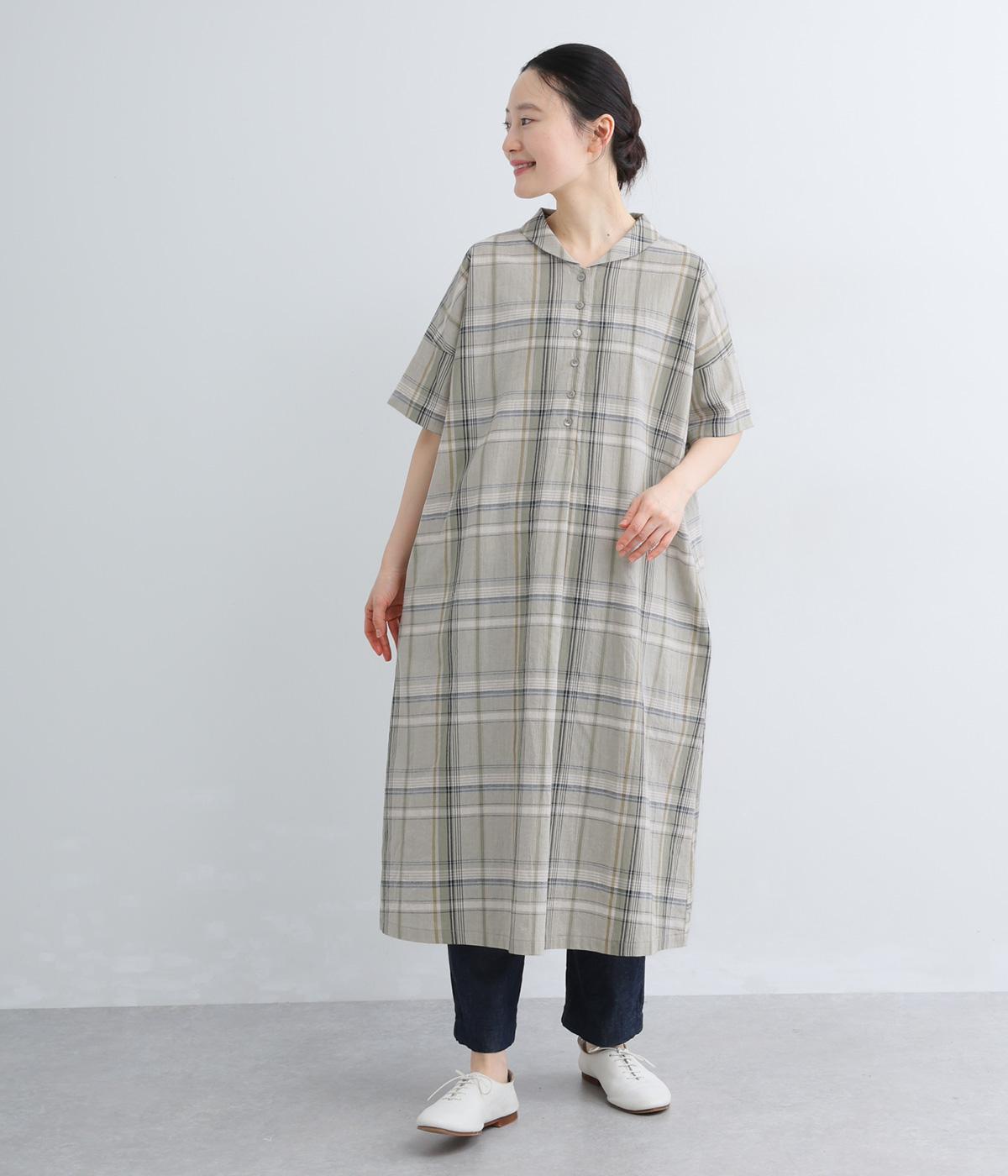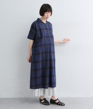 ショールカラーにチェック柄でさわやかにまとめたワンピース。適度にゆとりを持たせながらも広がりすぎないシルエットが着こなしやすく、ボトムとのレイヤードがおすすめ。ヘンリーネック仕様で脱ぎ着しやすく、トップボタンをあけて抜け感を出しても◎。