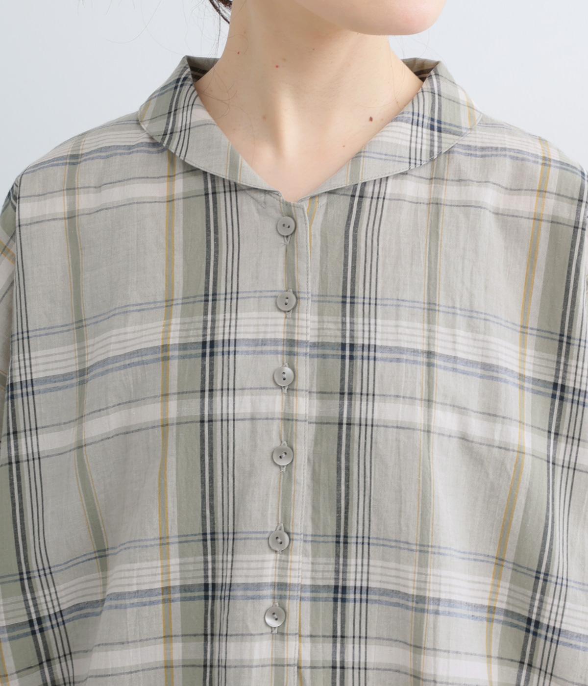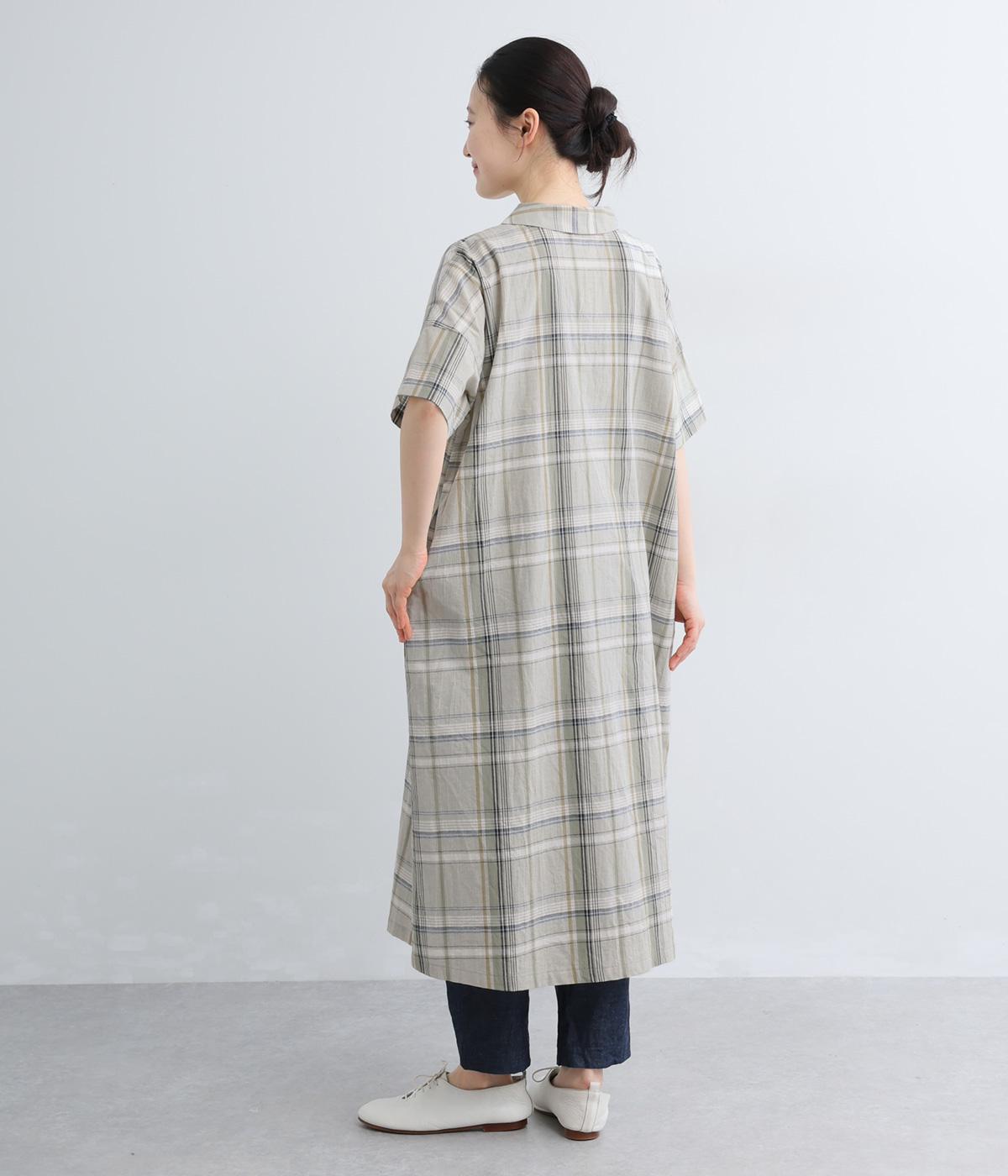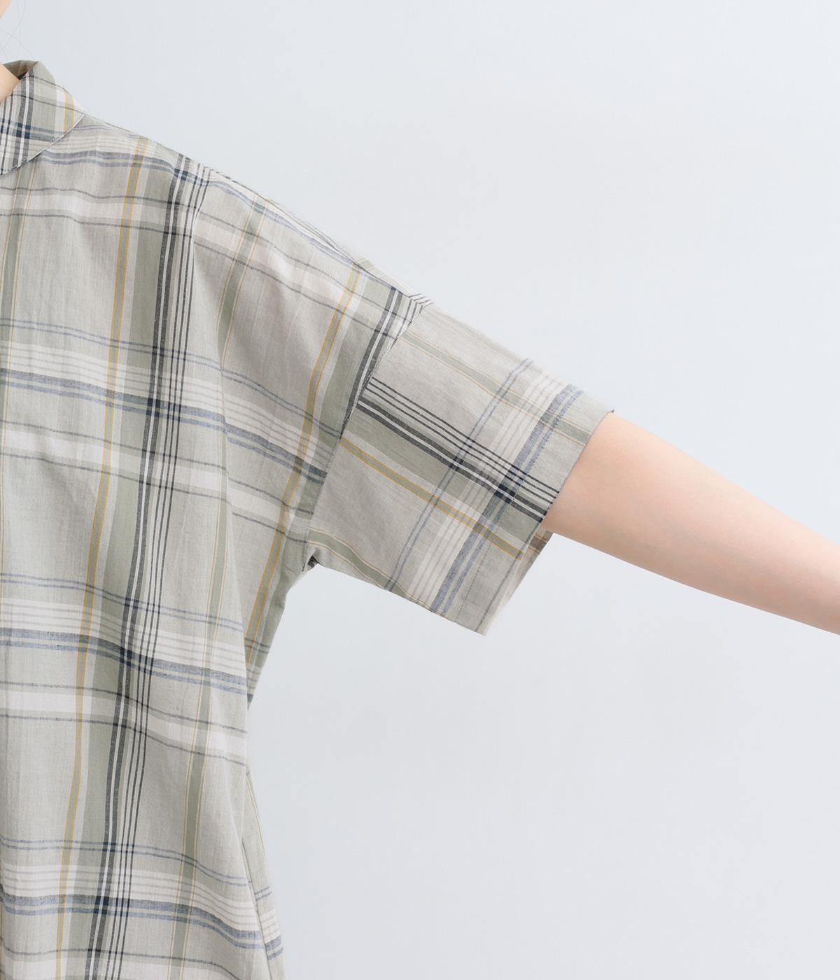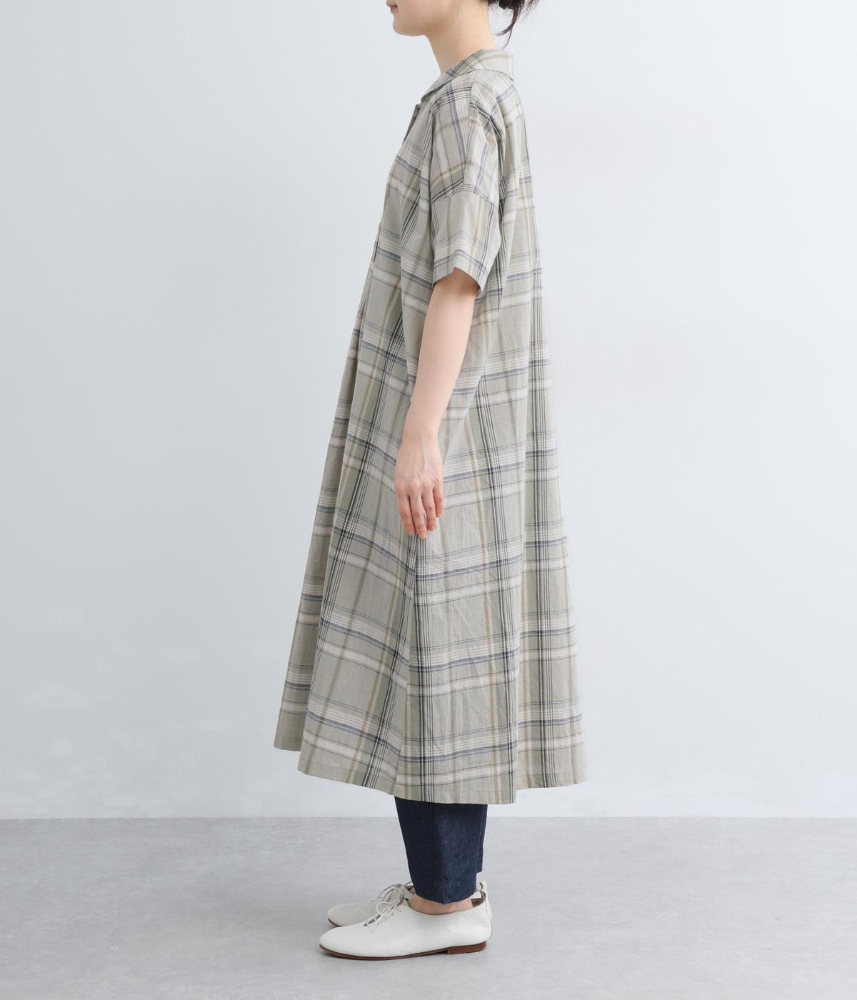 ショールカラーにチェック柄でさわやかにまとめたワンピース。適度にゆとりを持たせながらも広がりすぎないシルエットが着こなしやすく、ボトムとのレイヤードがおすすめ。ヘンリーネック仕様で脱ぎ着しやすく、トップボタンをあけて抜け感を出しても◎。