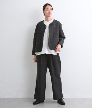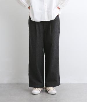フロントにタックを入れて腰まわりをゆったり仕上げたワイドパンツ。比翼仕立てでお腹まわりはすっきりと見せ、トップスをインしたきれいな着こなしも◎。ウエスト後ろはゴム入り、サイドは調節タブで心地よいフィット感に。