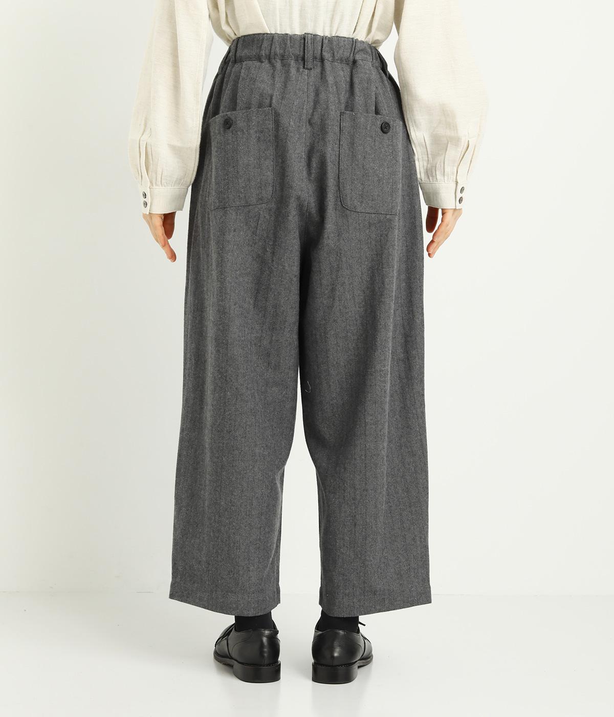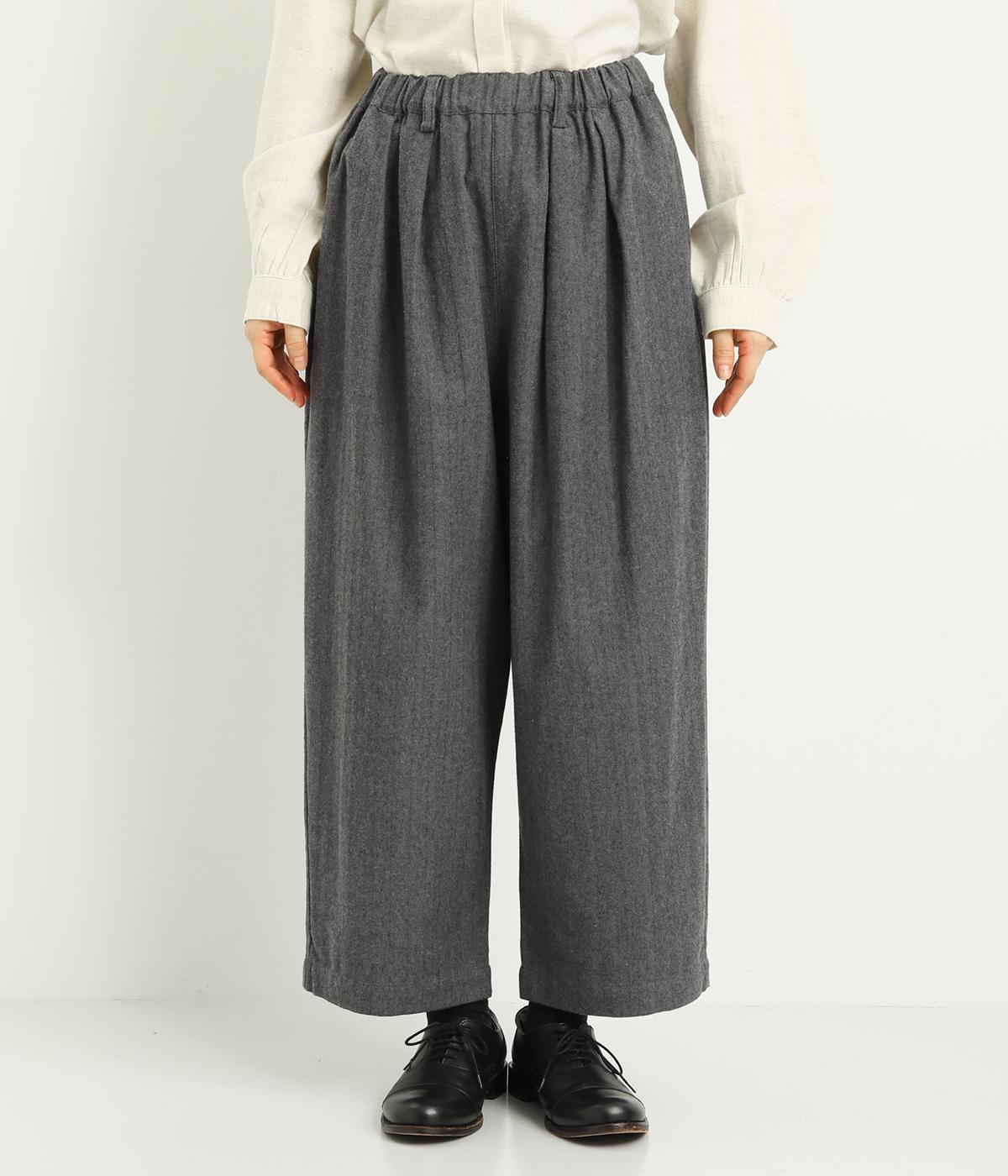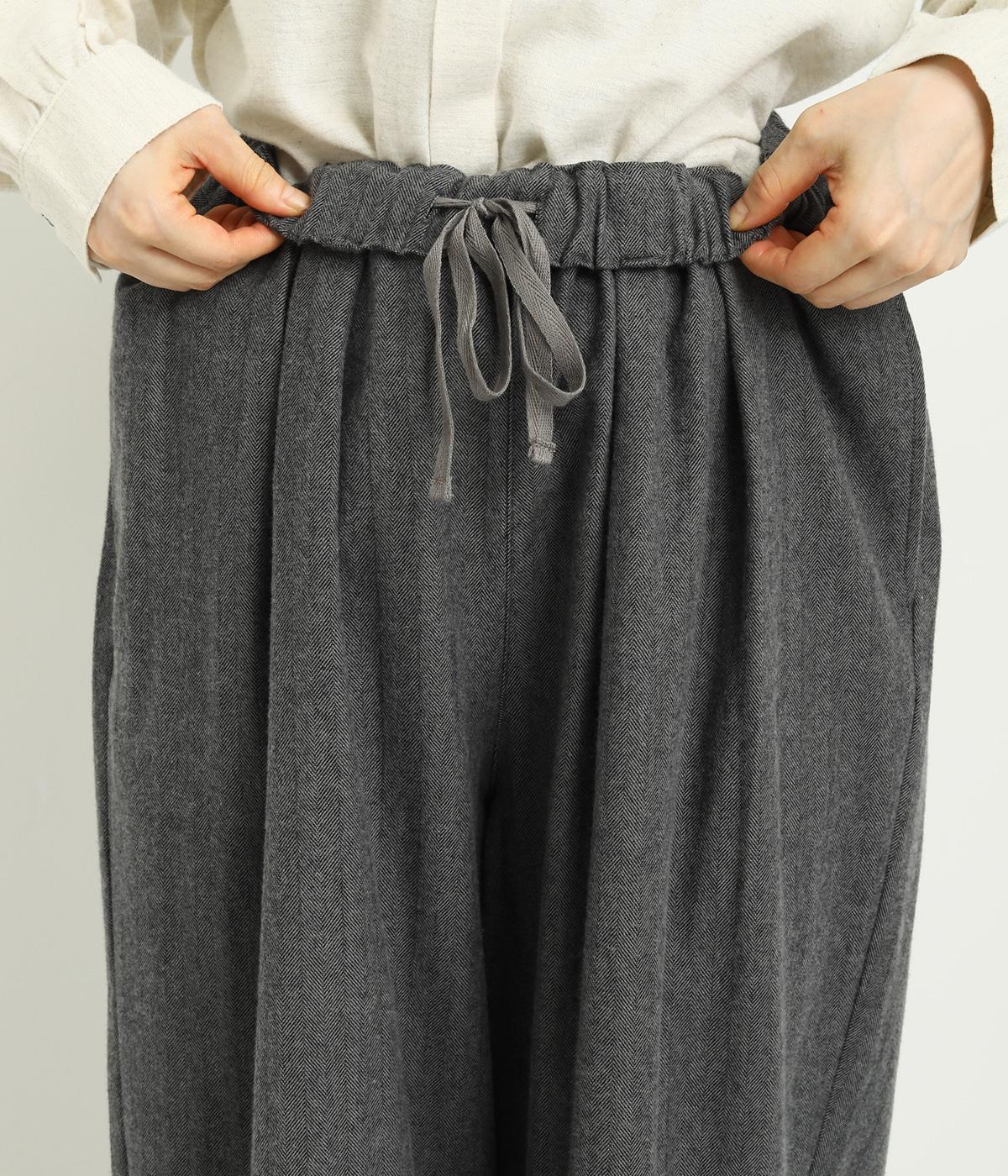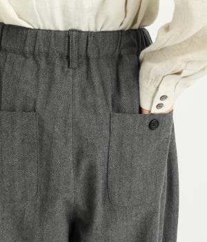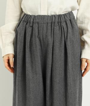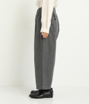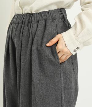 タックを寄せた分量感にクラシカルテイストな素材で雰囲気よく仕立てました。大人の落ち着いた装いにぴったりなパンツで、紐靴などマニッシュシューズとも相性◎。ウエストは安定感のある総太平ゴムに内紐入りで調整も可能。