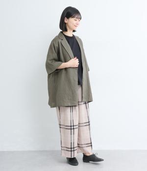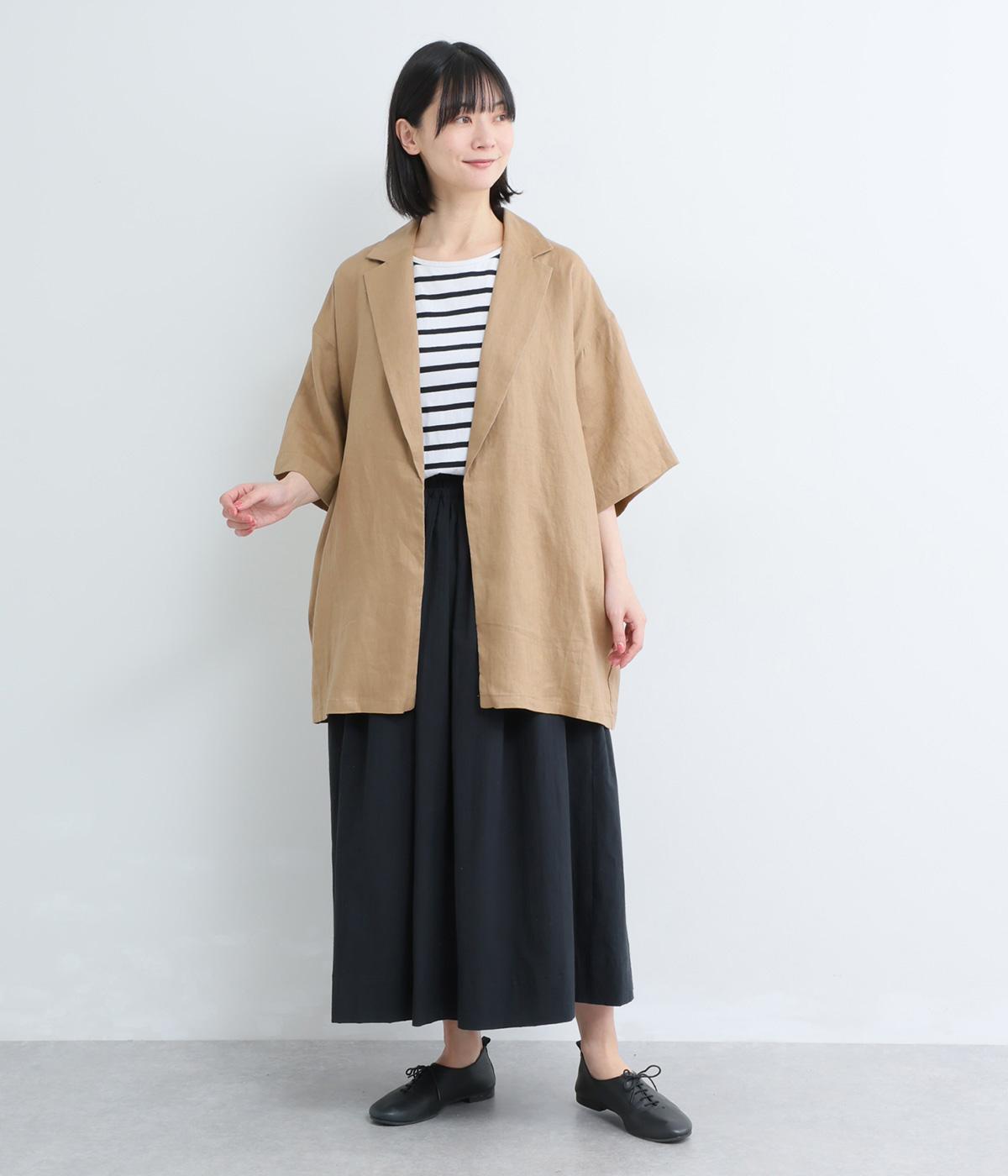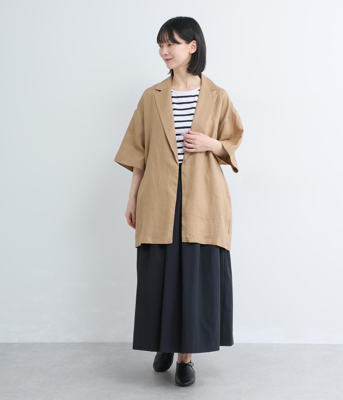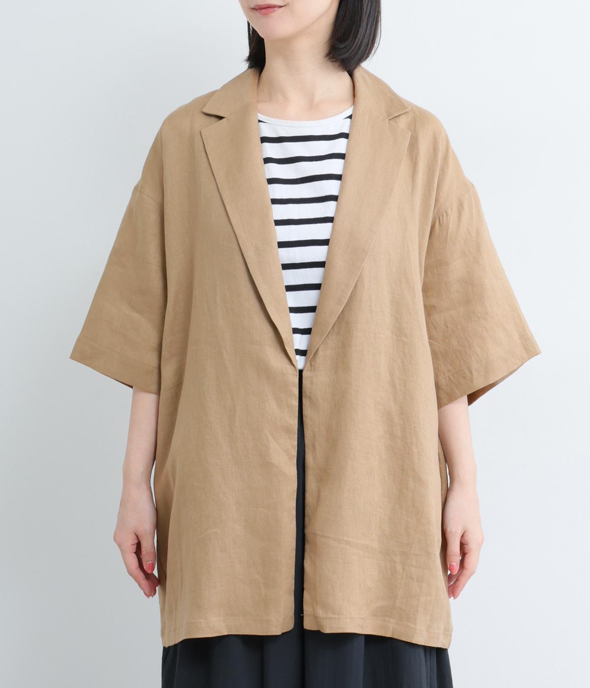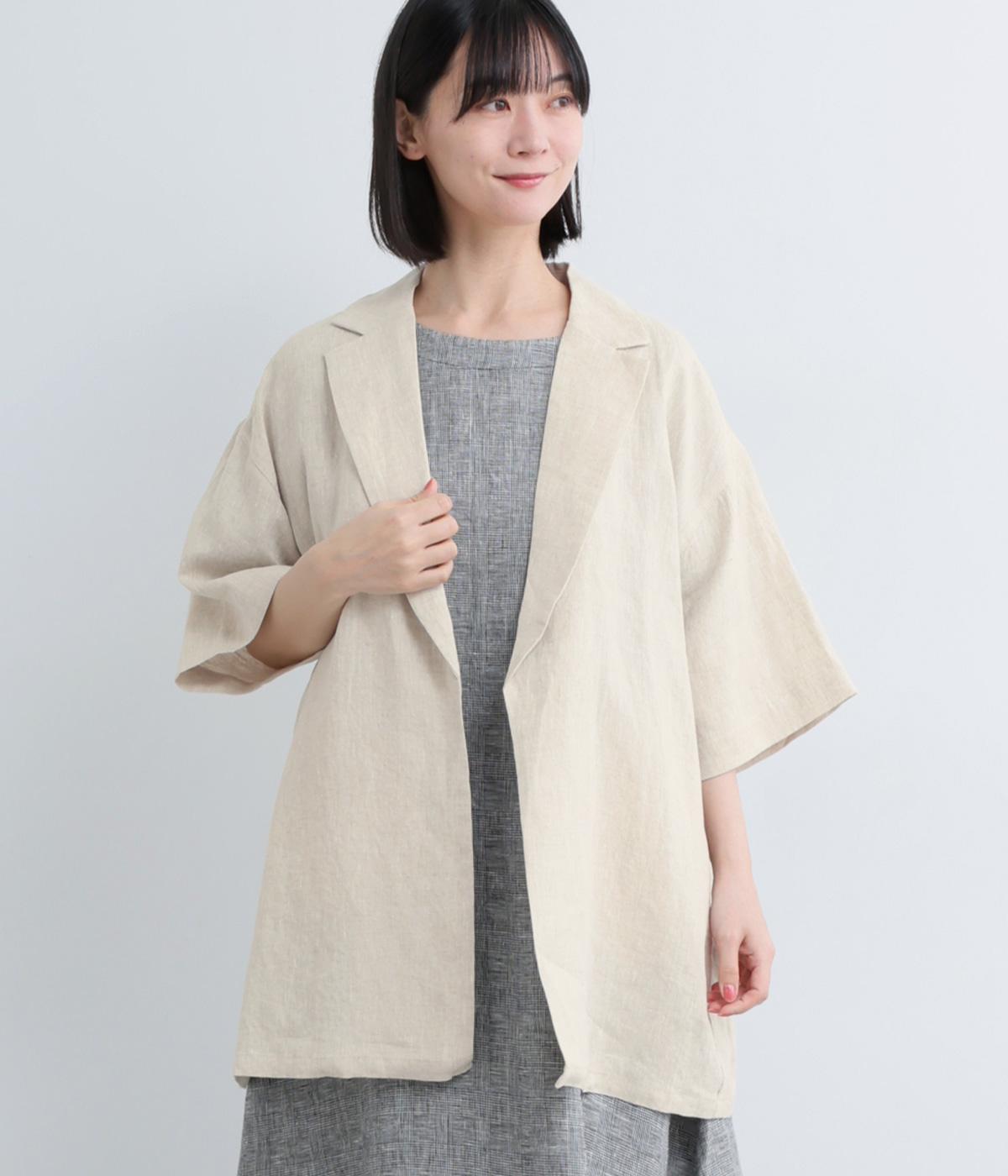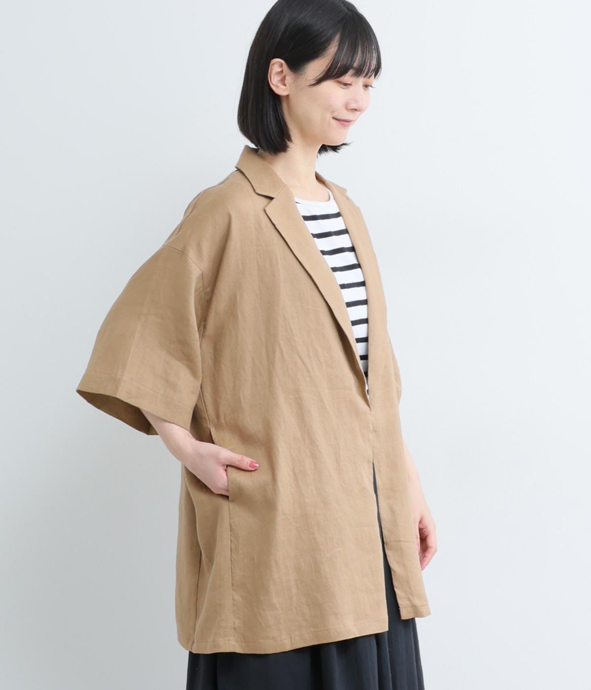 きちんと感のあるテーラード要素を取り入れつつ、ゆとりのある五分袖仕立てで抜け感をもたせました。リネンの素材感が良く、どんなアイテムに羽織ってもサマになります。オフィスカジュアルからふだん使いまで、毎日に寄り添う一着です。