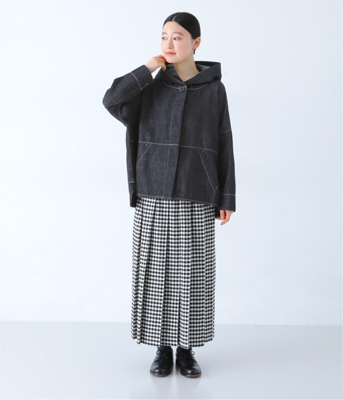 ふわりと揺れるチェックスカートを合わせた、女性らしさを引き立てるコーディネート。落ち着いたインディゴが、ボトムスのカラーリングや柄を際立たせ、バランスのいいスタイルに。