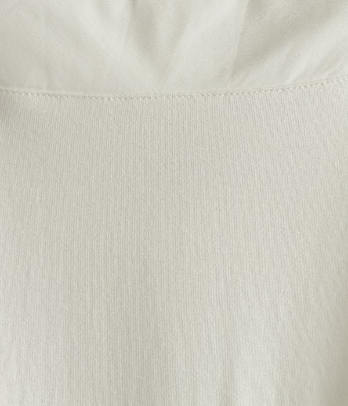 細番手の天竺ニット素材ならではの柔らかな肌触りのよい生地で仕立てた前胸ヨーク、別布切替えキャミソールワンピースです。切替えは同系色綿ローンを使用したひとひねりデザイン。透け感のあるワンピースのアンダーアイテムとして重宝します。肩紐はアジャスター付きなので、お好みの丈感で着こなしていただけます。
