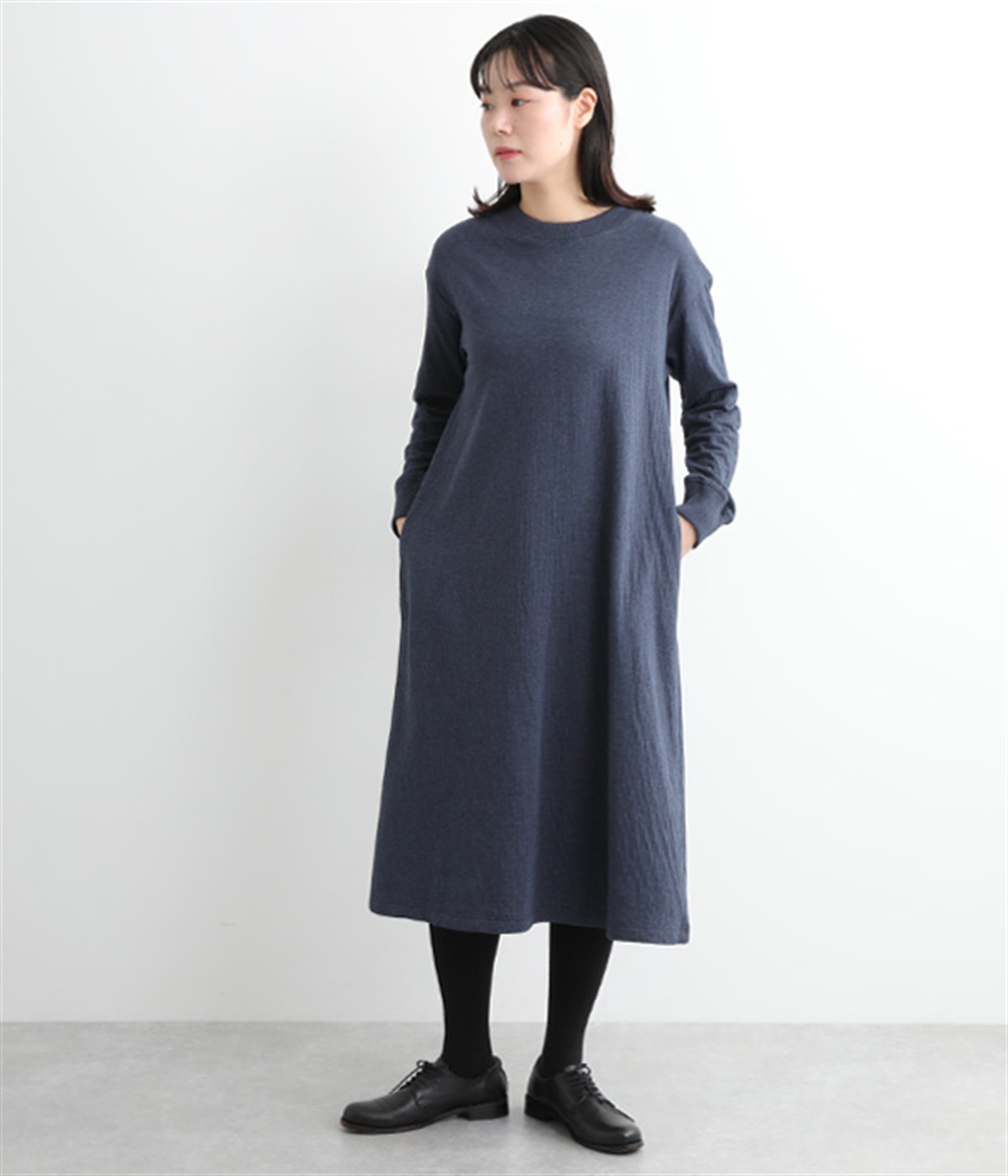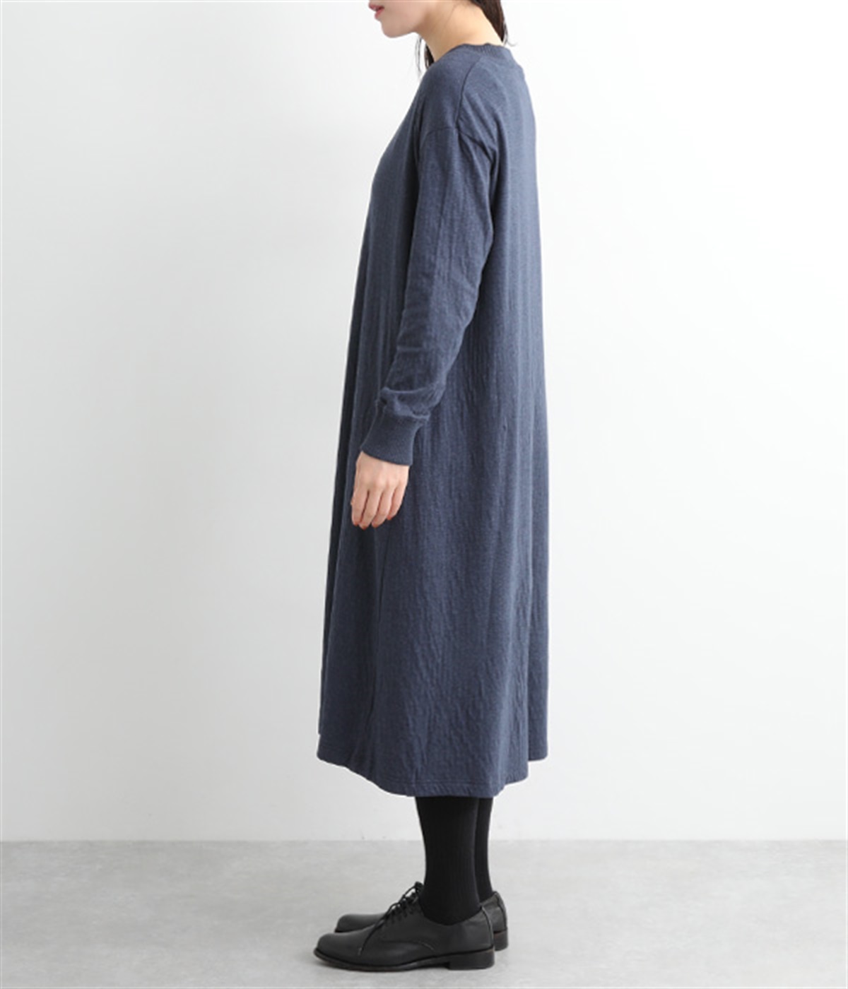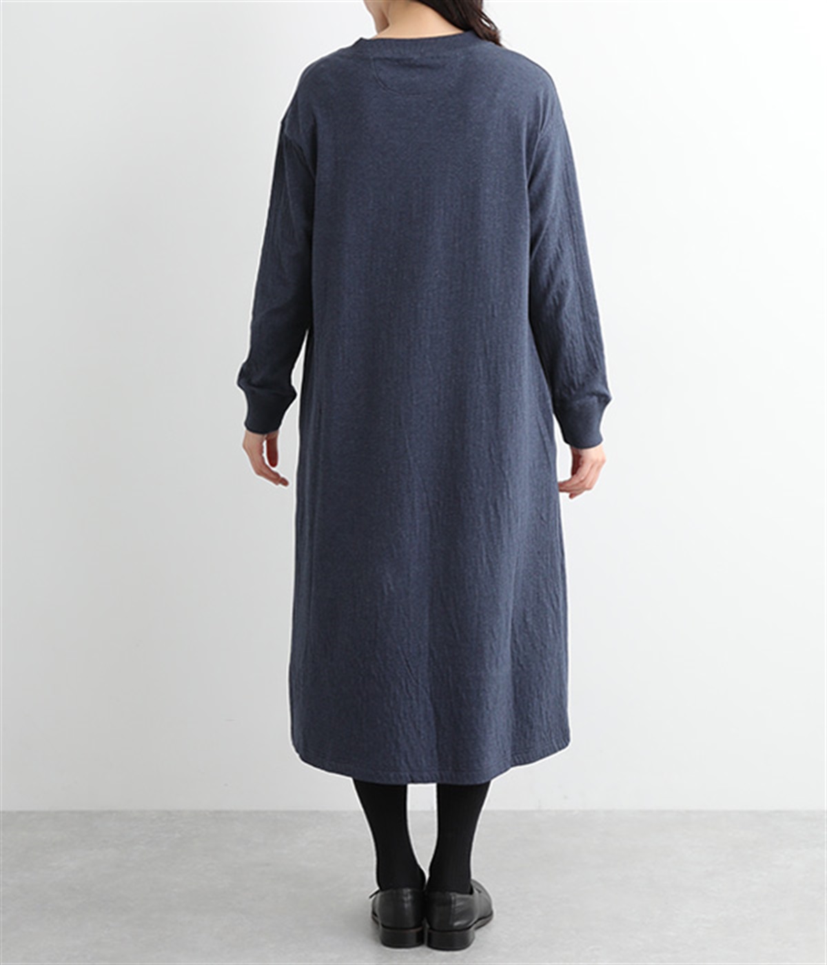 首元をすっきりと見せる、適度なあきのラウンドネック