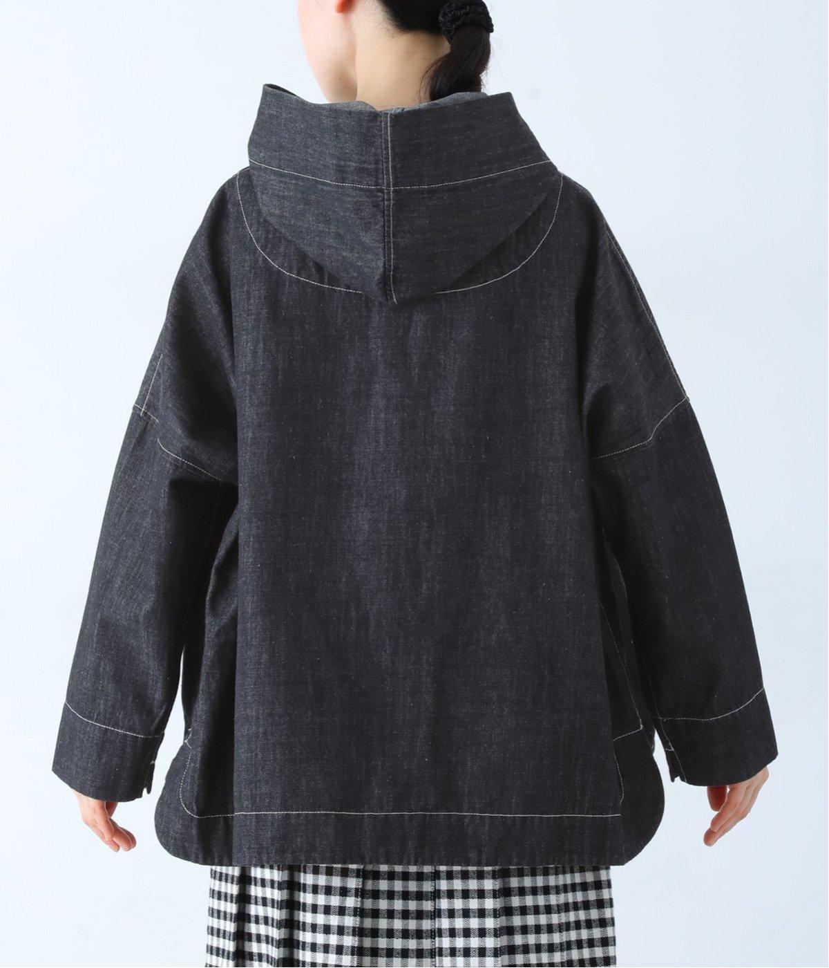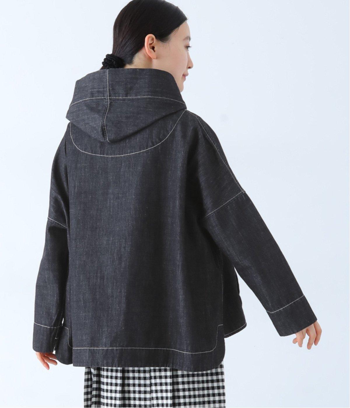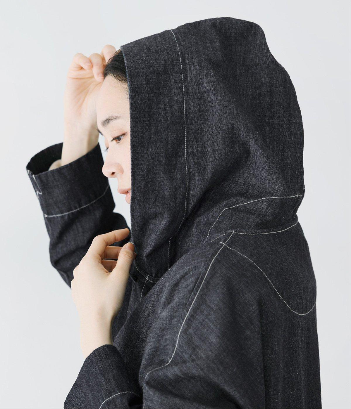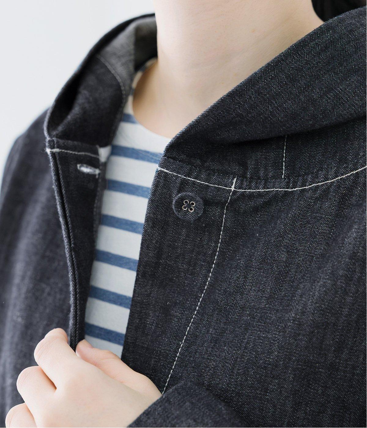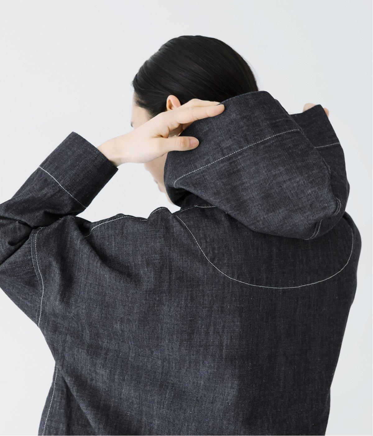首元にほどよいゆとりをもたせたフードデザイン。前立てに施した配色ステッチが、デニムの表情を引き締め、さりげないアクセントに。