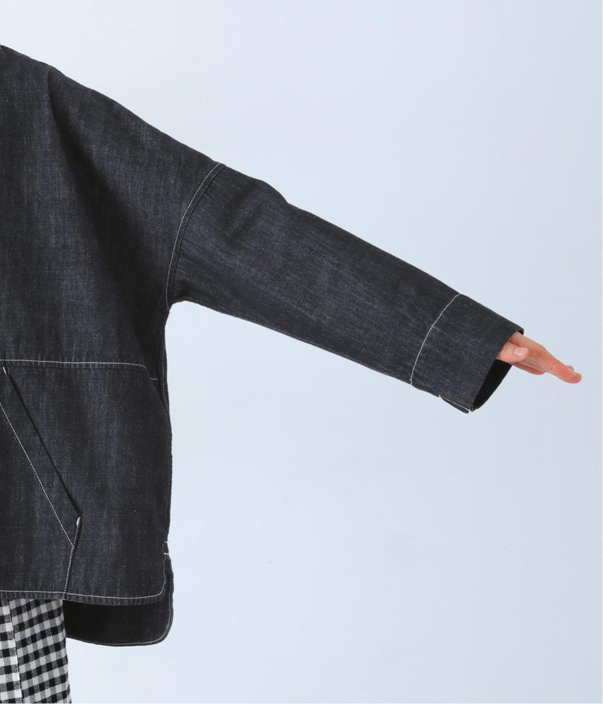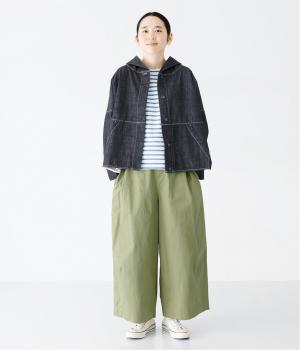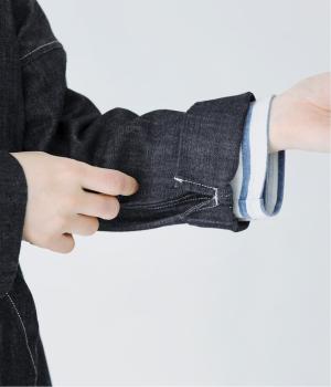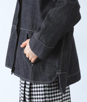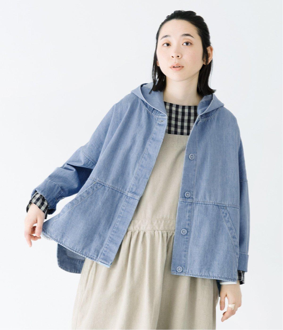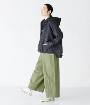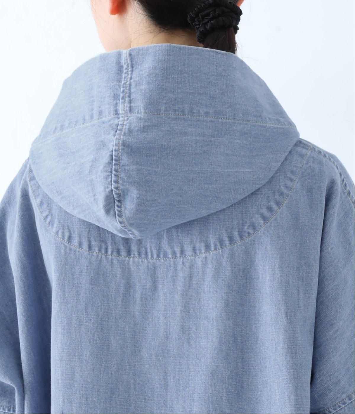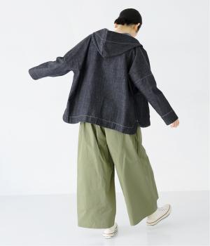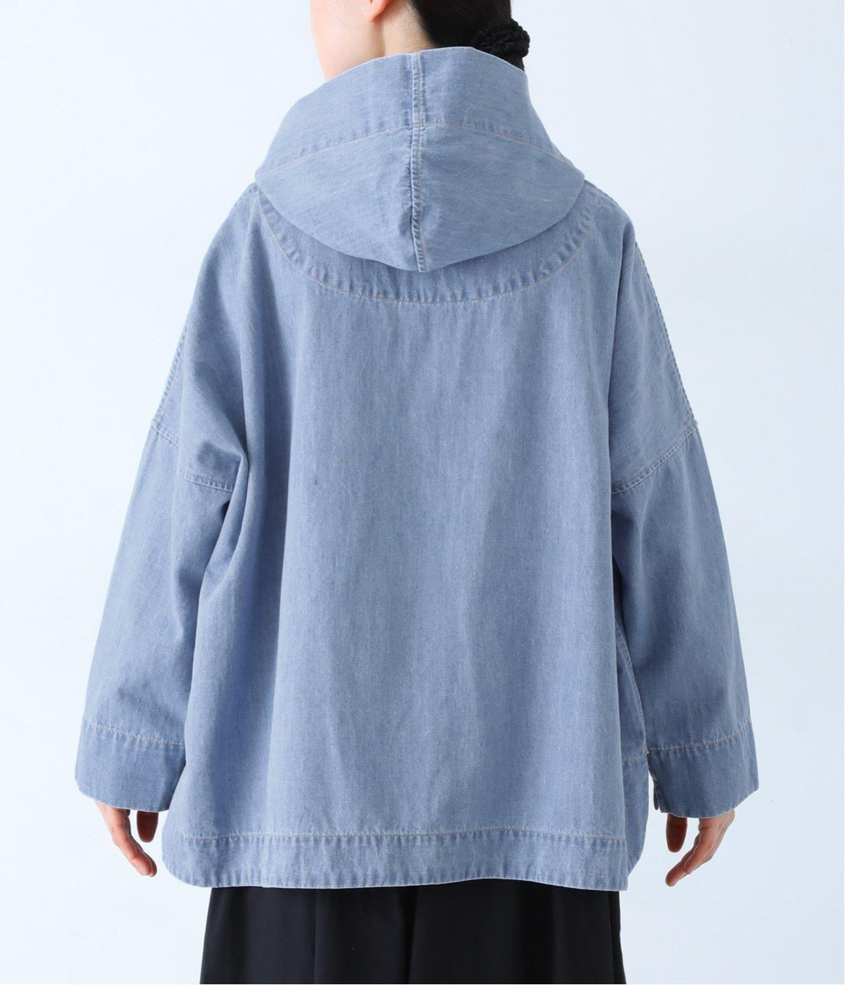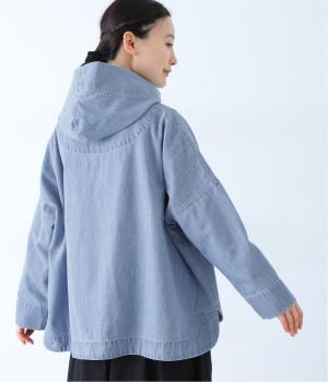 首元にほどよいゆとりをもたせたフードデザイン。前立てに施した配色ステッチが、デニムの表情を引き締め、さりげないアクセントに。