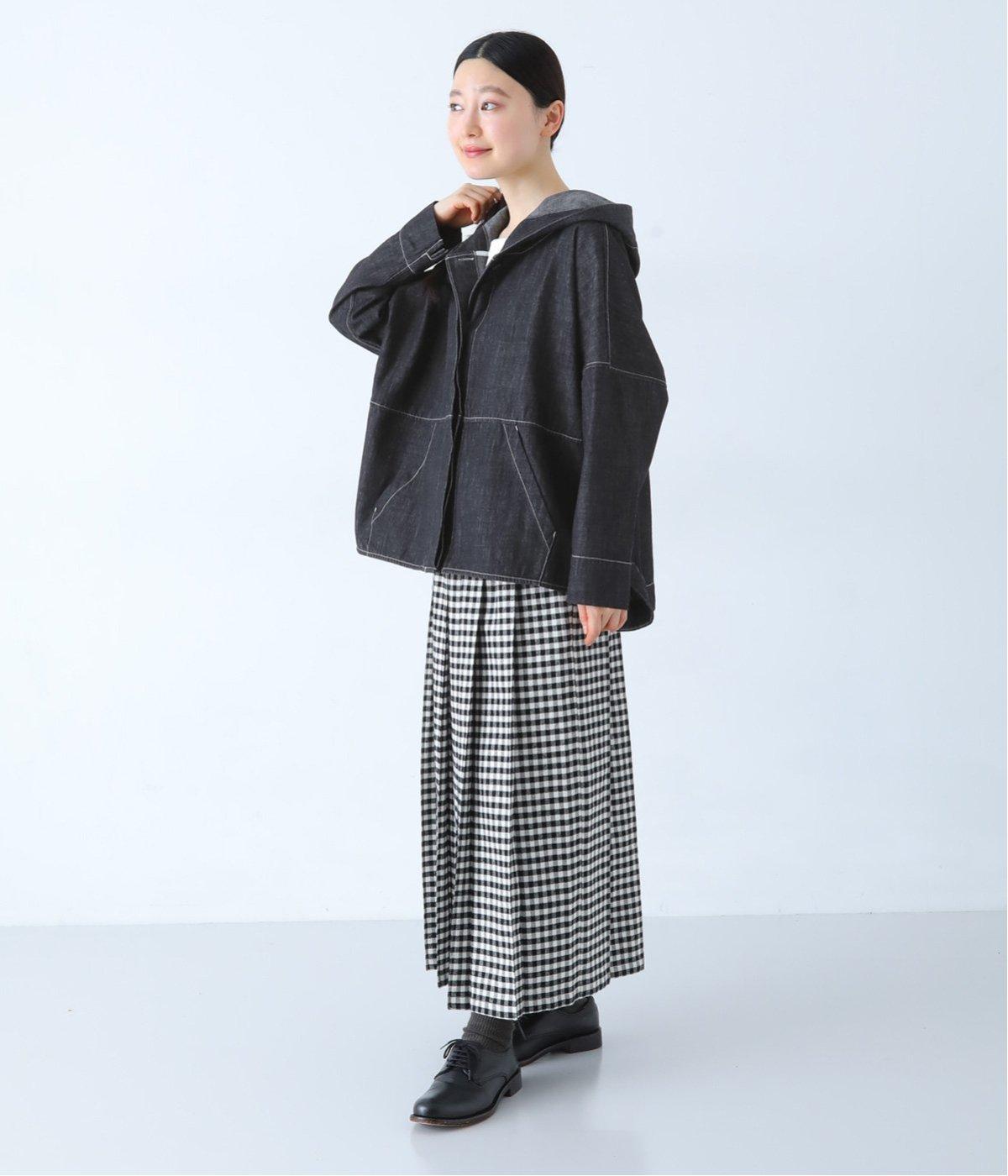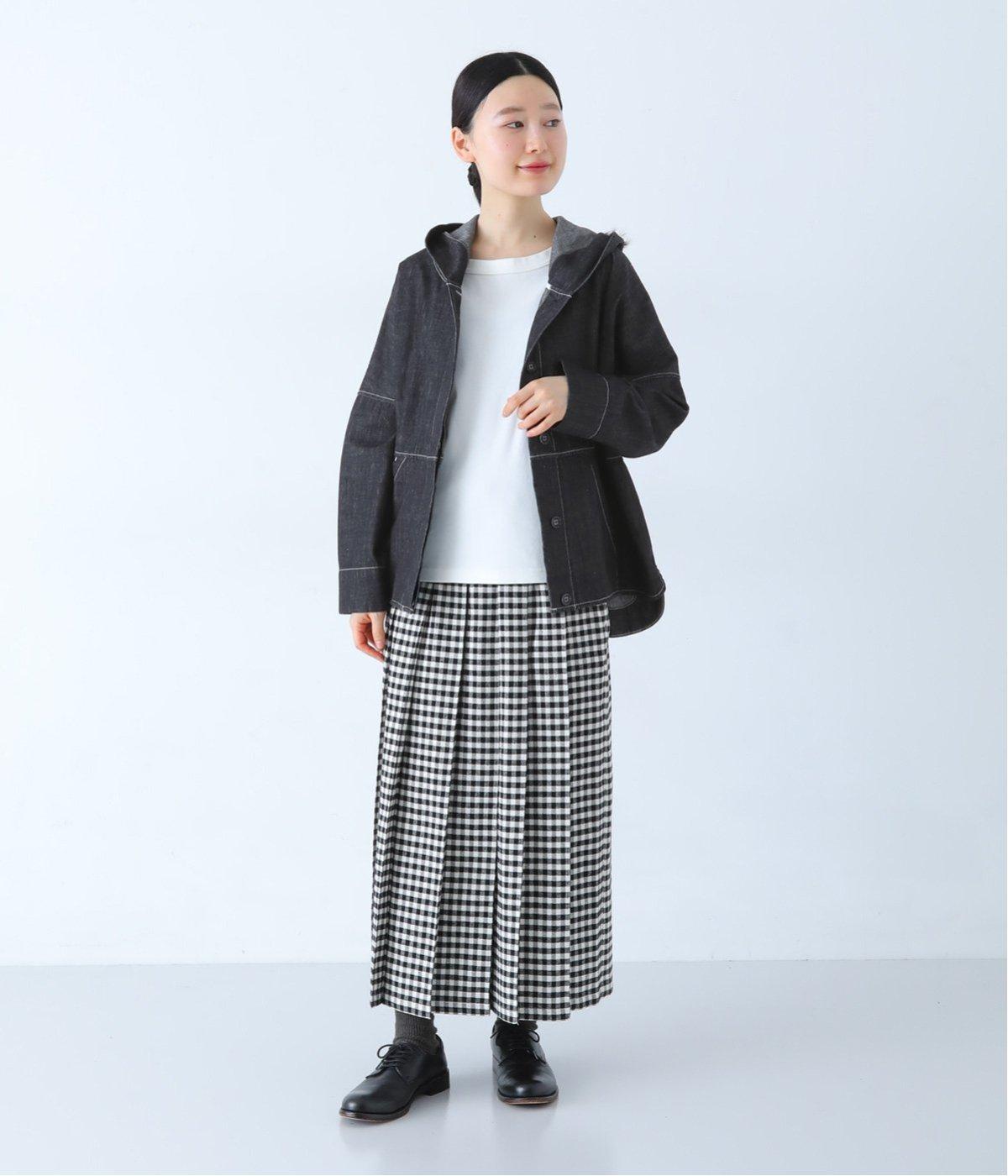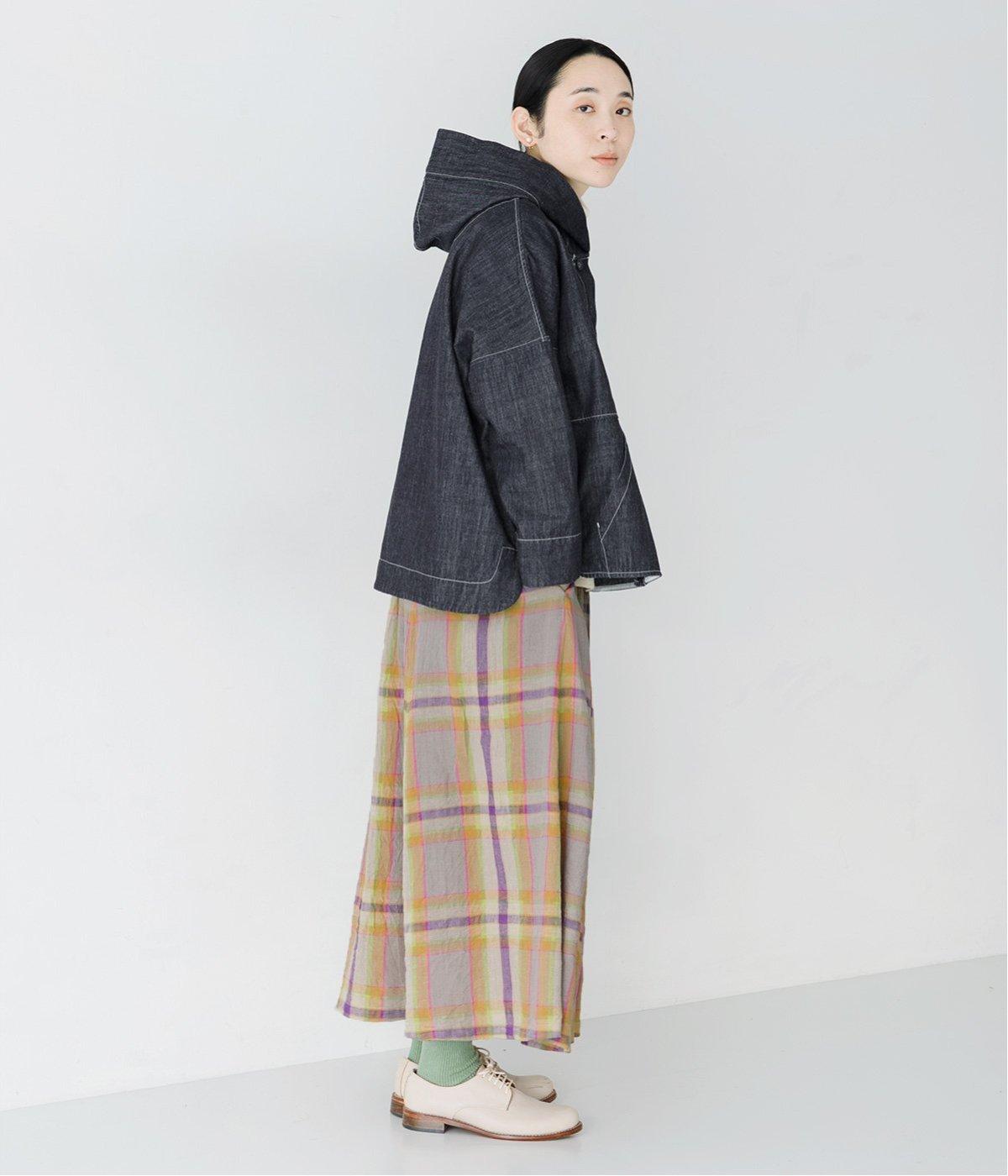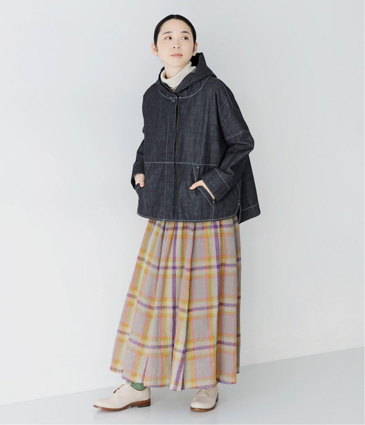ふわりと揺れるチェックスカートを合わせた、女性らしさを引き立てるコーディネート。落ち着いたインディゴが、ボトムスのカラーリングや柄を際立たせ、バランスのいいスタイルに。