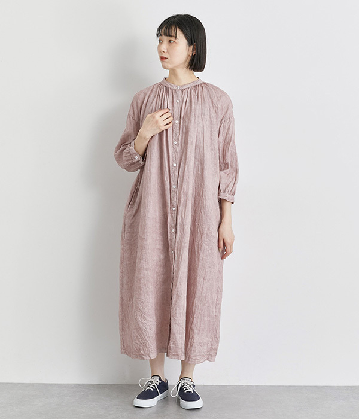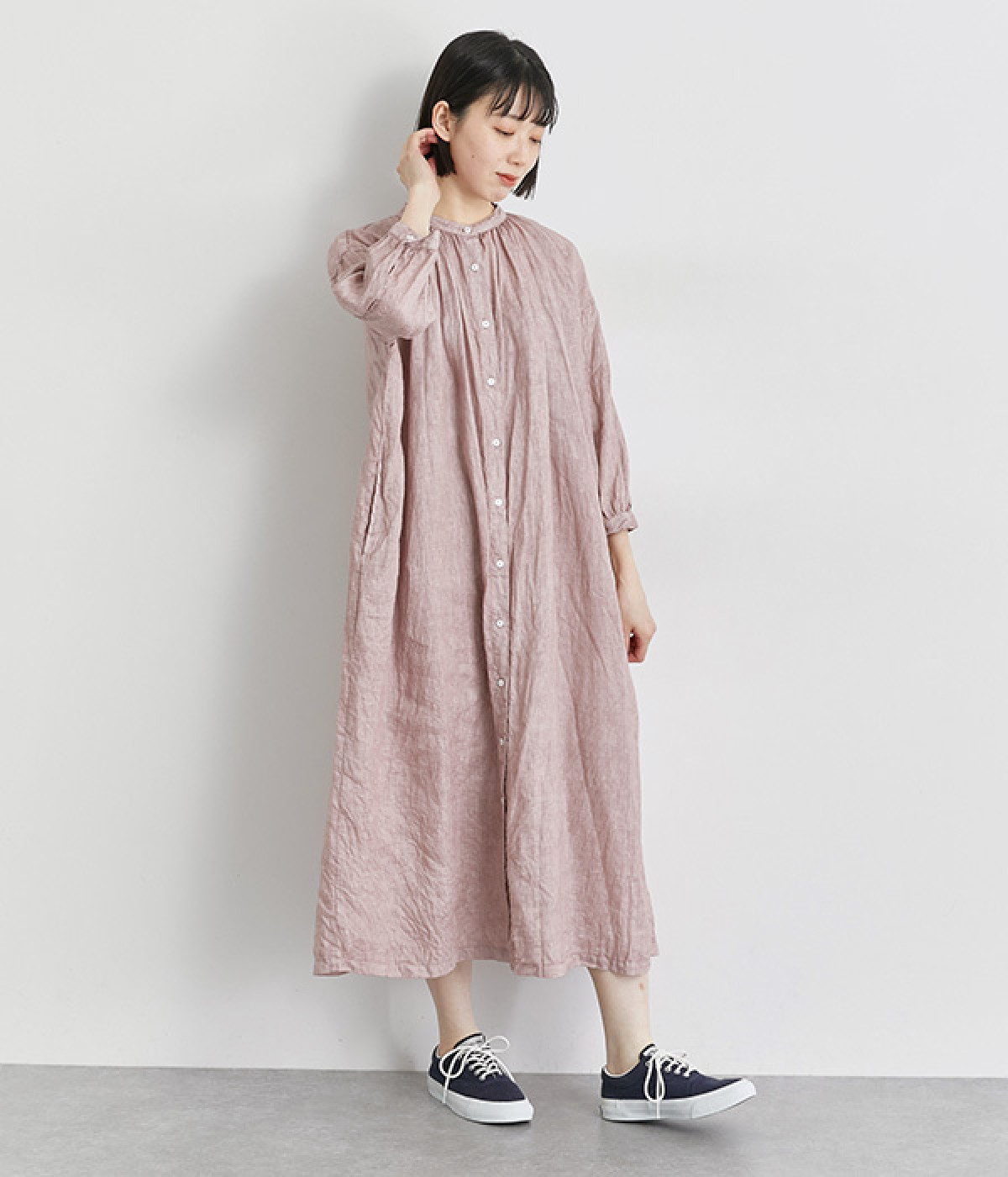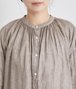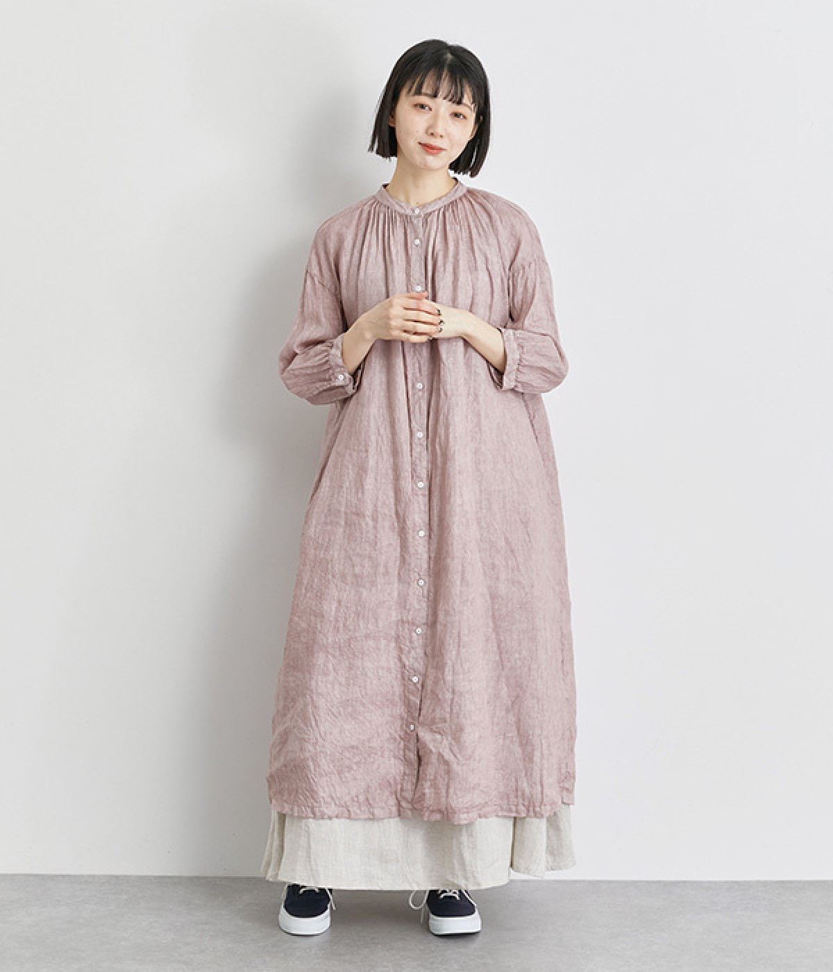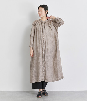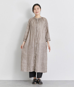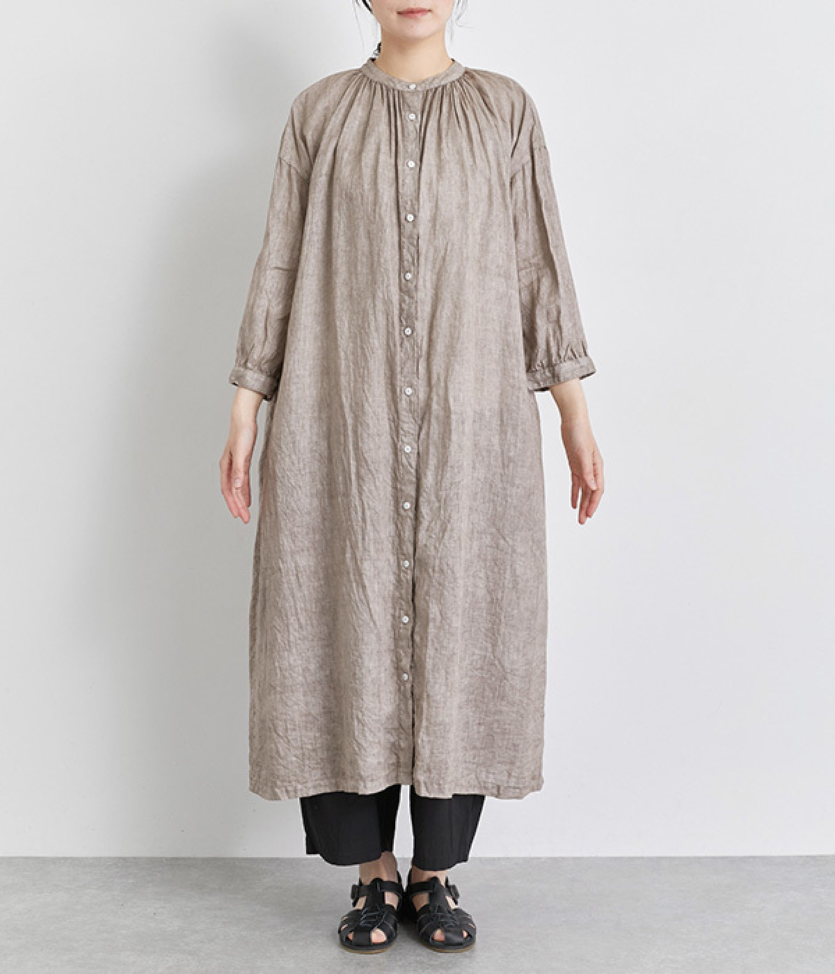 きちんと感のあるスタンドカラーに前ボタンあきで羽織りとしても重宝するワンピースです。襟ぐりや袖にギャザーをたっぷりと入れた分量感のあるシルエットが魅力的で、シンプルながらもベンガラ染めによる豊かな表情が着映えする仕上がりです。