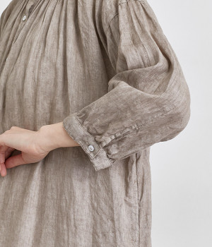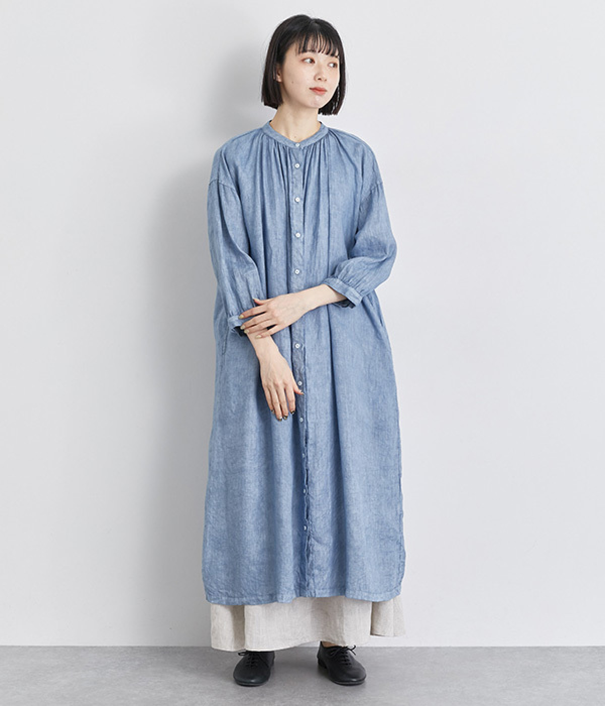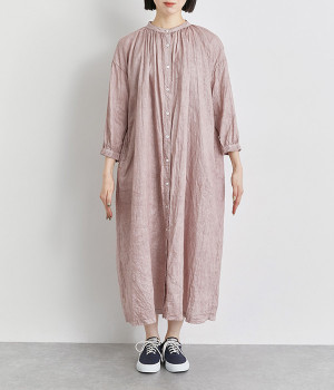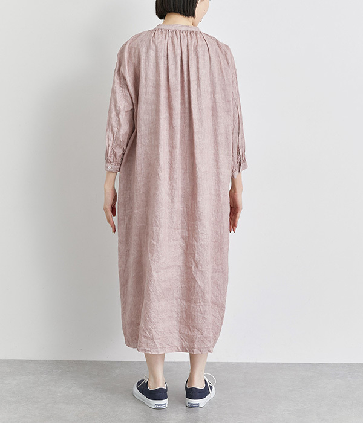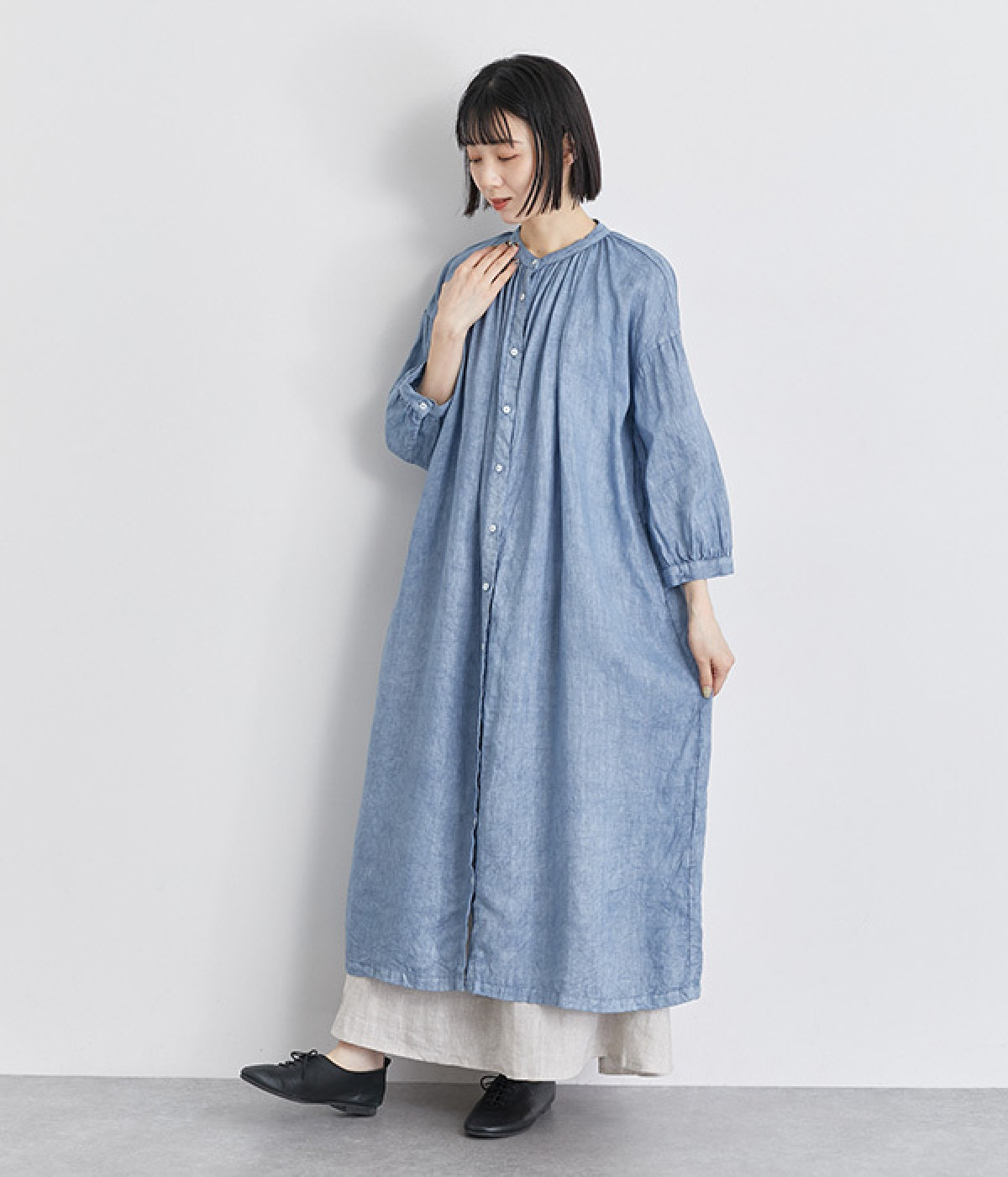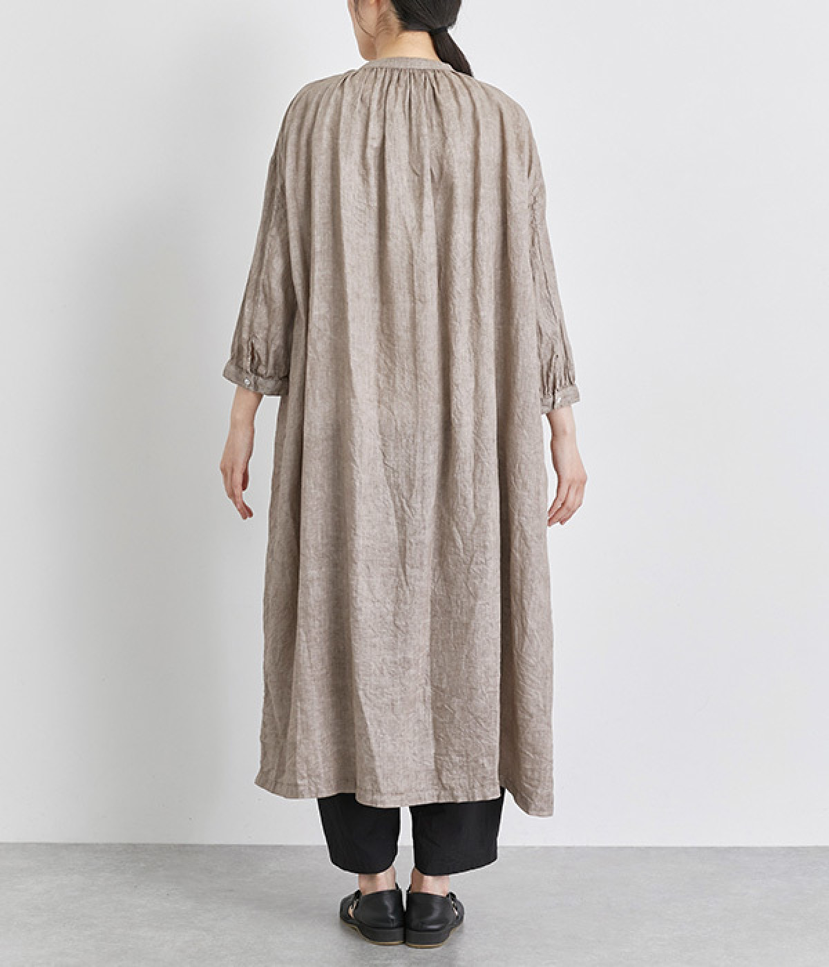 きちんと感のあるスタンドカラーに前ボタンあきで羽織りとしても重宝するワンピースです。襟ぐりや袖にギャザーをたっぷりと入れた分量感のあるシルエットが魅力的で、シンプルながらもベンガラ染めによる豊かな表情が着映えする仕上がりです。