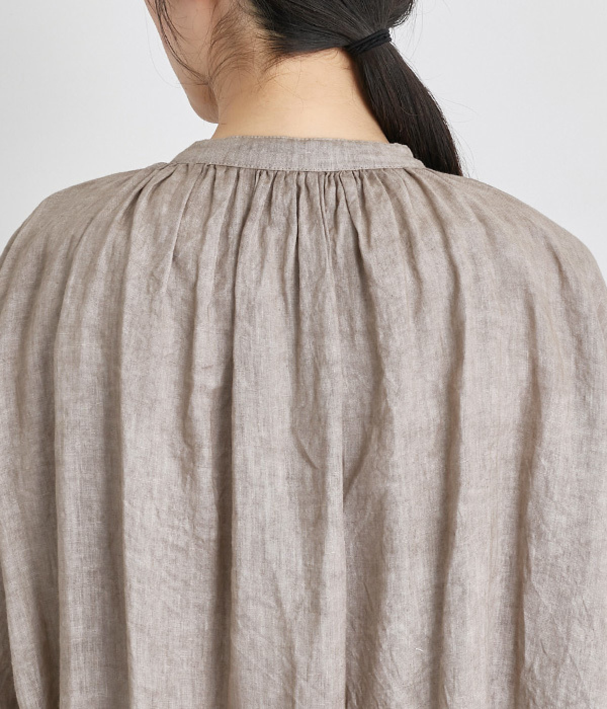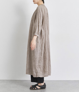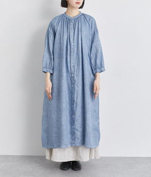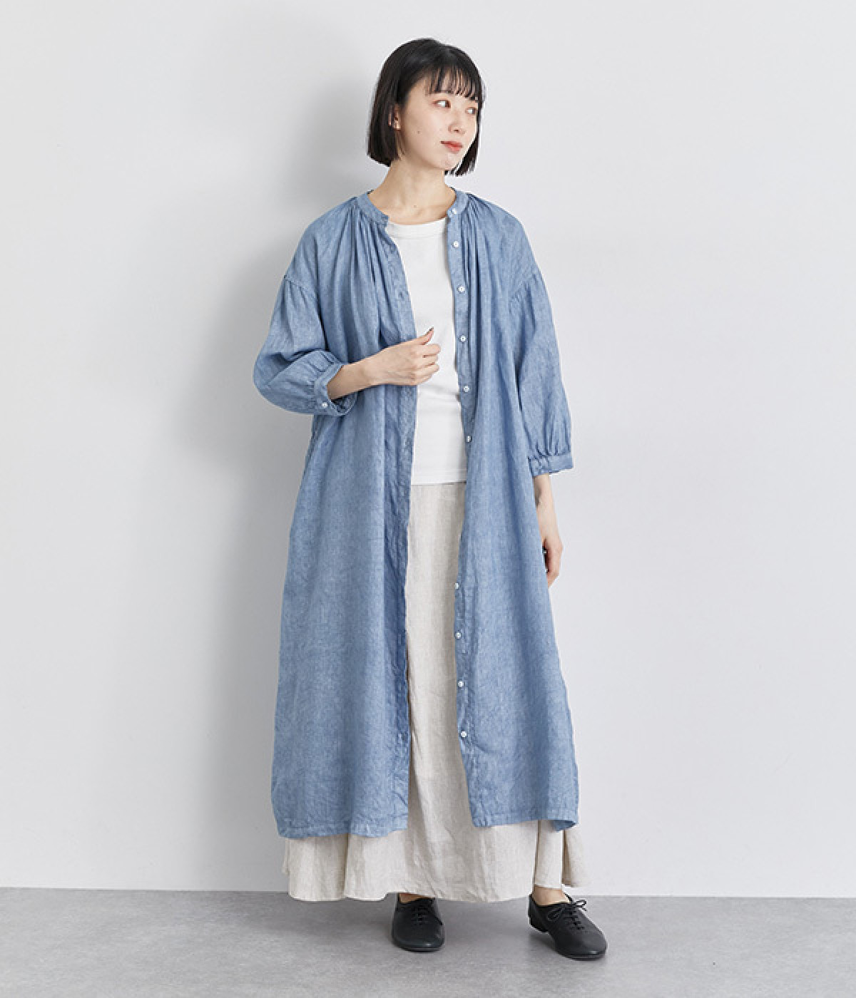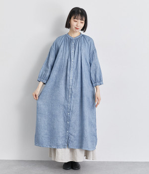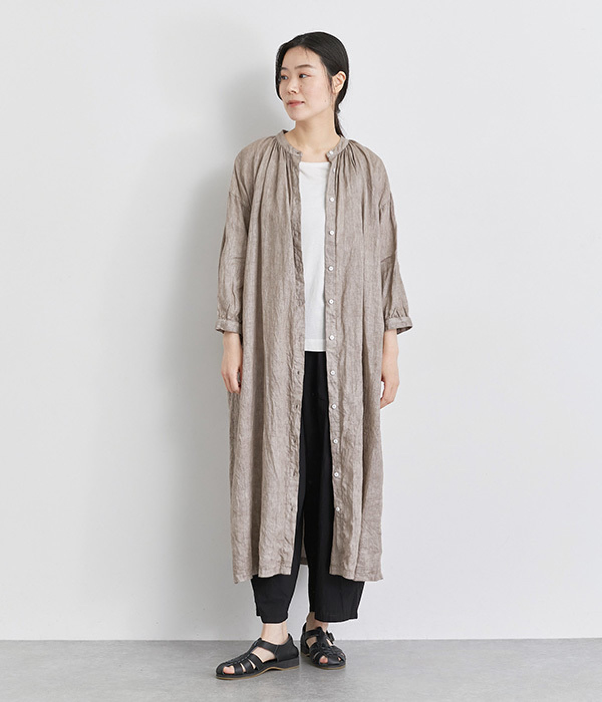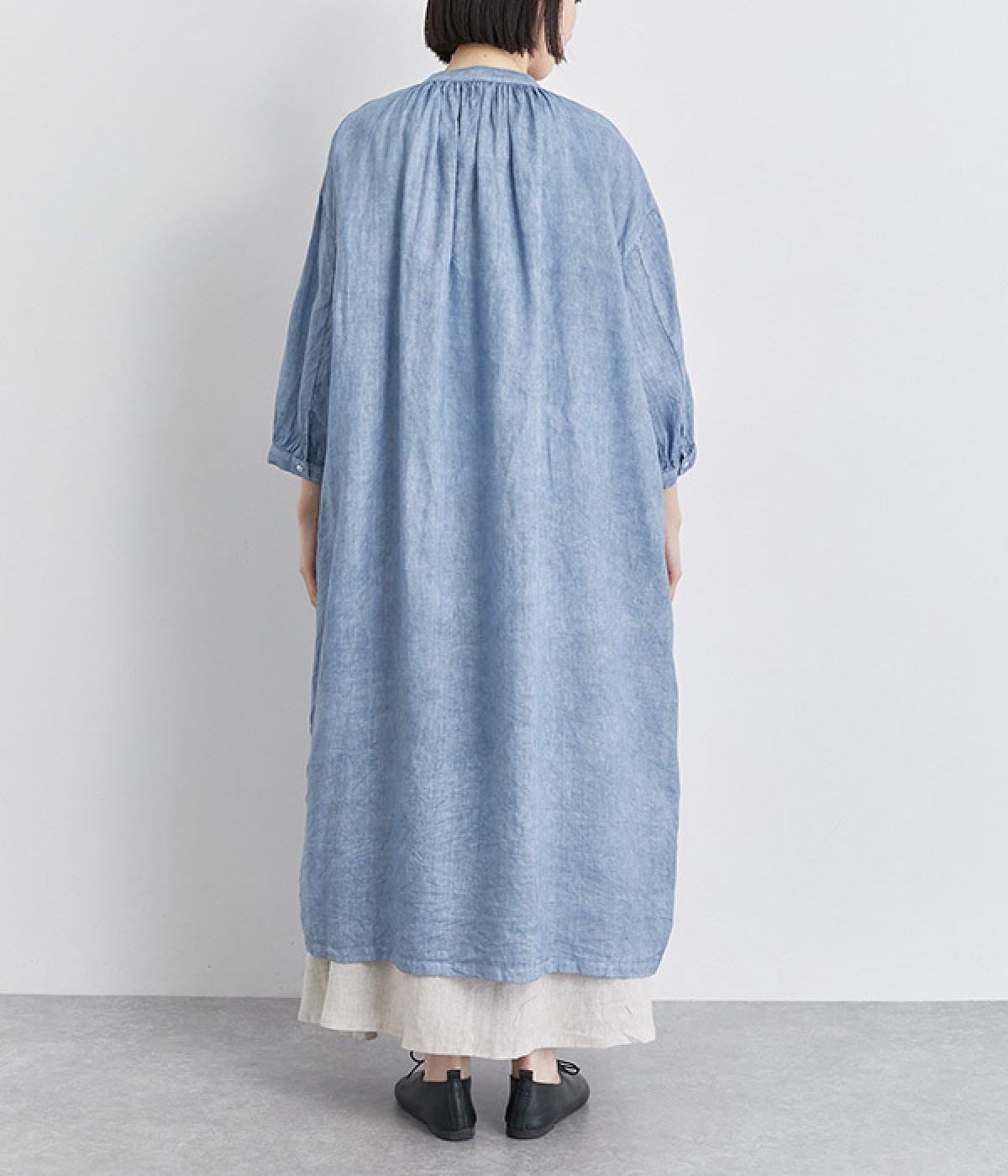 きちんと感のあるスタンドカラーに前ボタンあきで羽織りとしても重宝するワンピースです。襟ぐりや袖にギャザーをたっぷりと入れた分量感のあるシルエットが魅力的で、シンプルながらもベンガラ染めによる豊かな表情が着映えする仕上がりです。