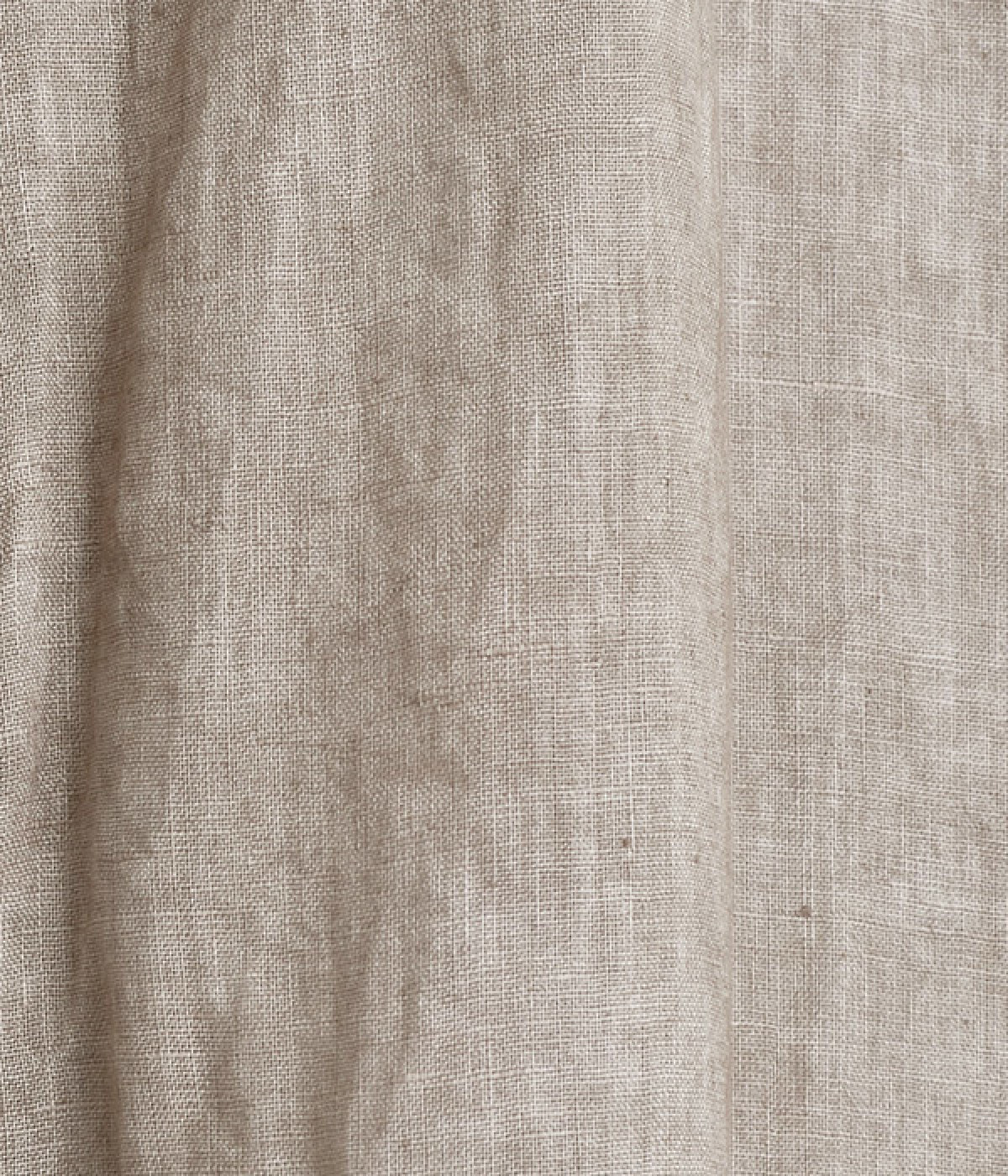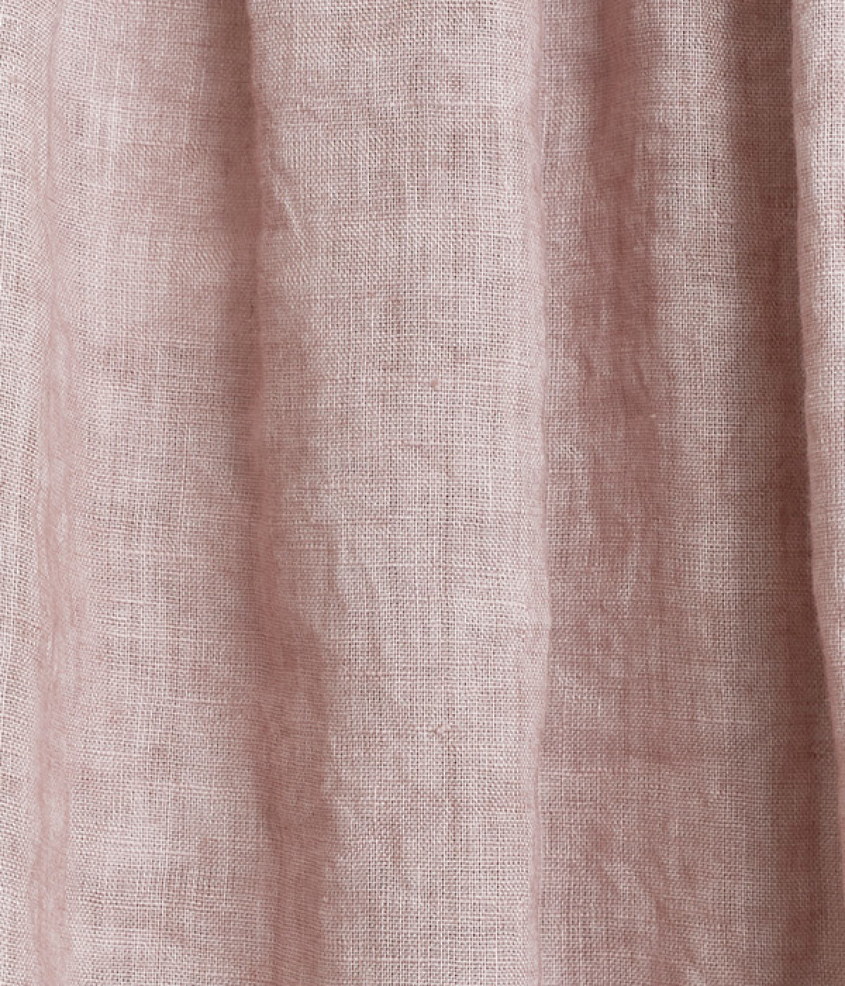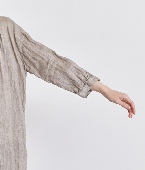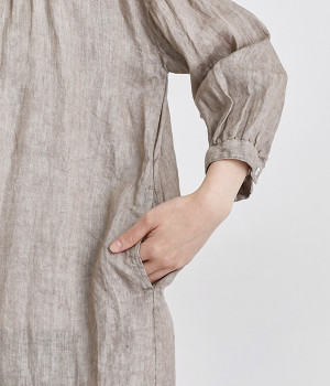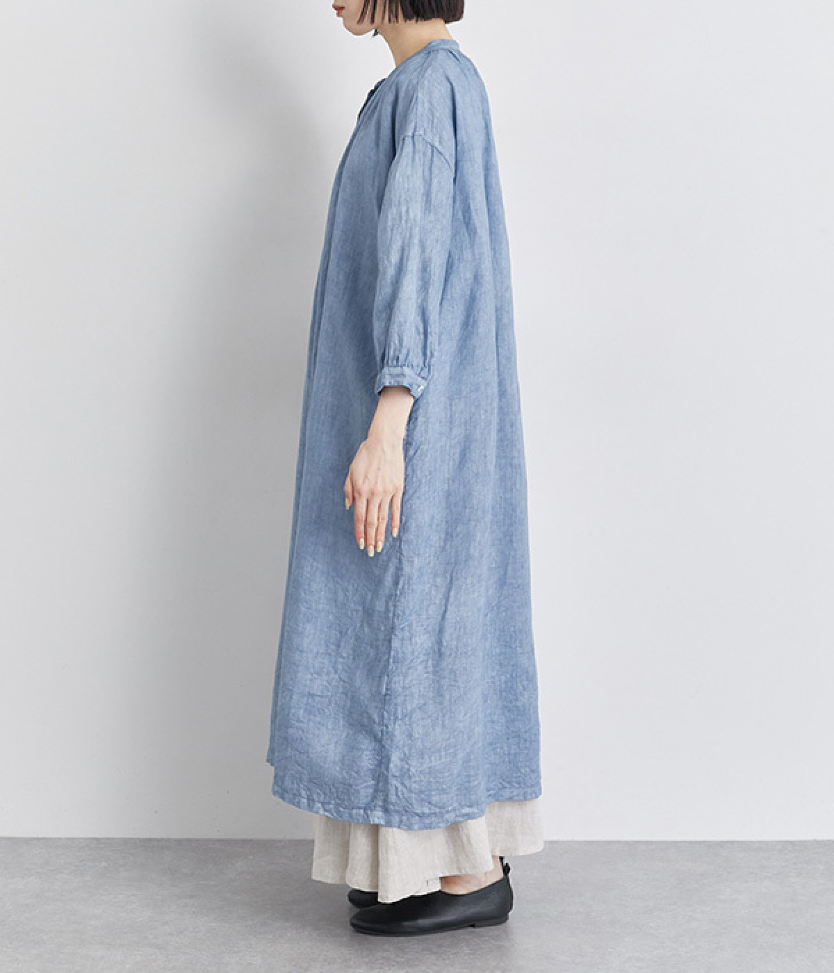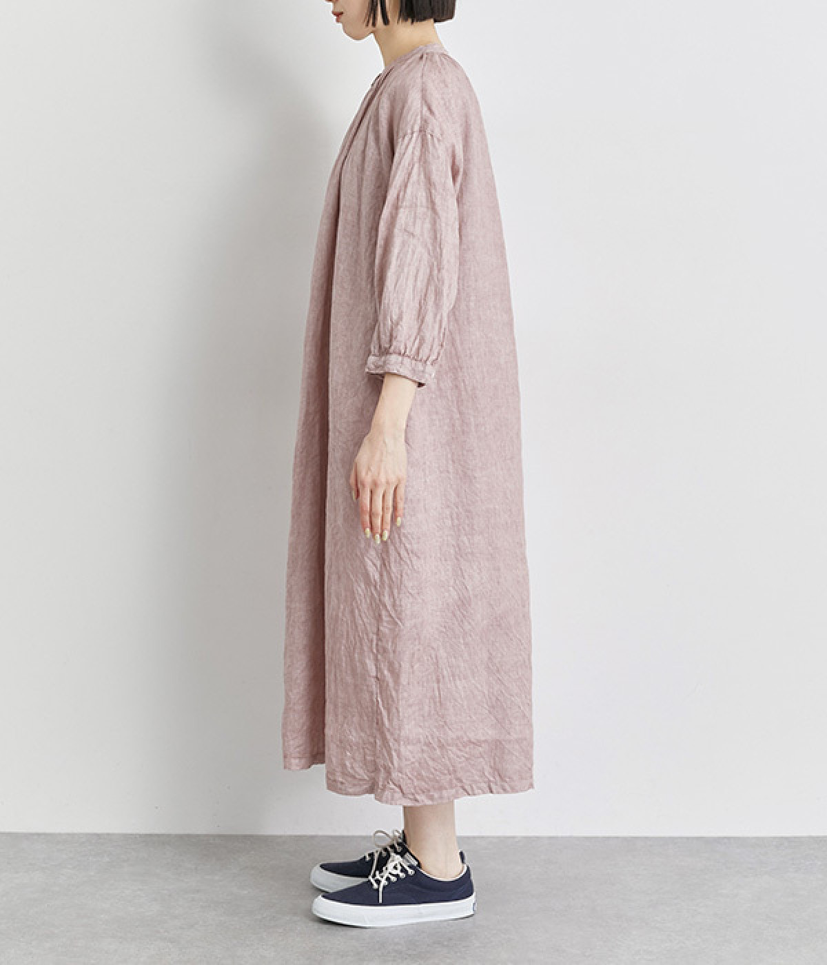 きちんと感のあるスタンドカラーに前ボタンあきで羽織りとしても重宝するワンピースです。襟ぐりや袖にギャザーをたっぷりと入れた分量感のあるシルエットが魅力的で、シンプルながらもベンガラ染めによる豊かな表情が着映えする仕上がりです。