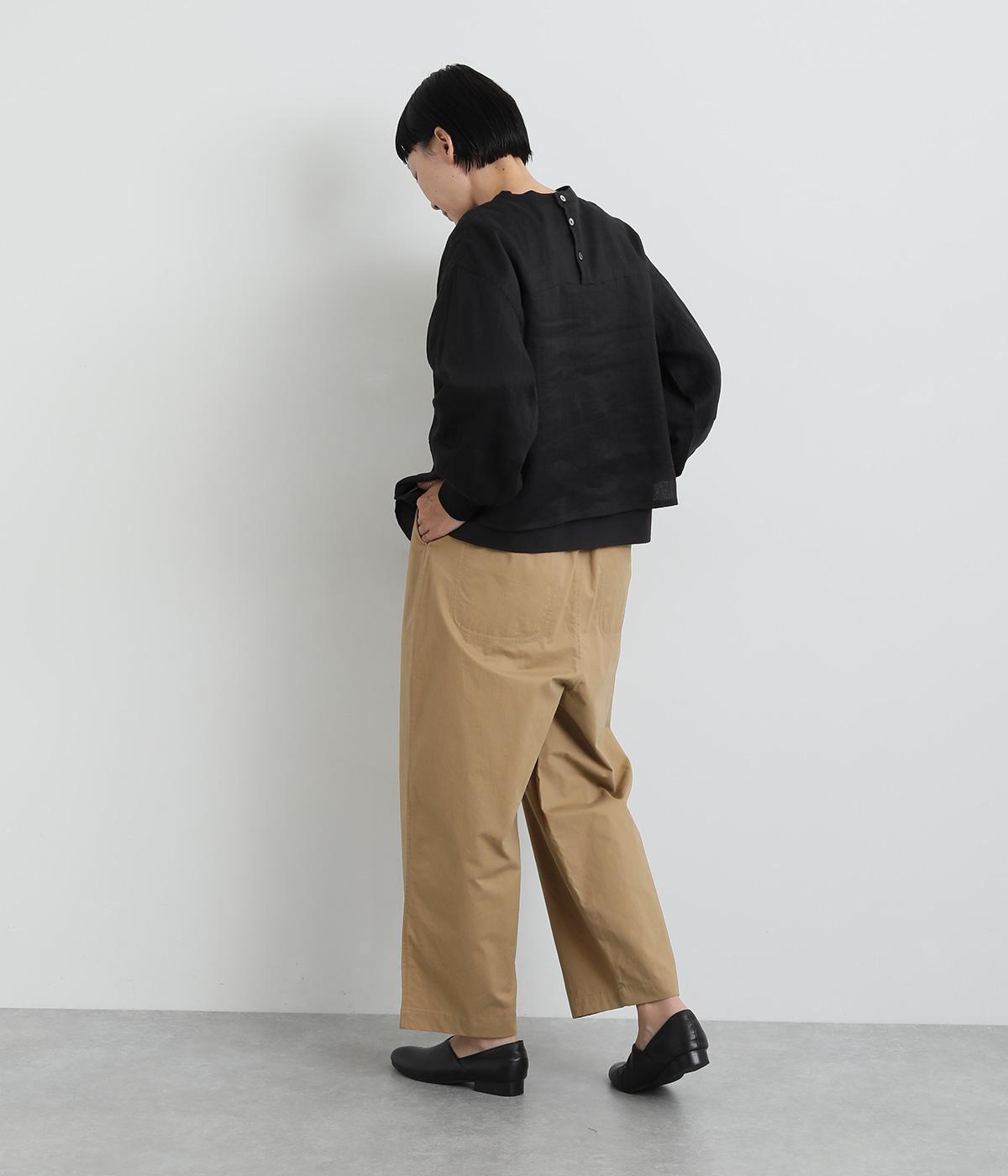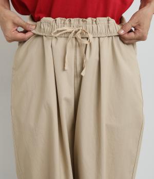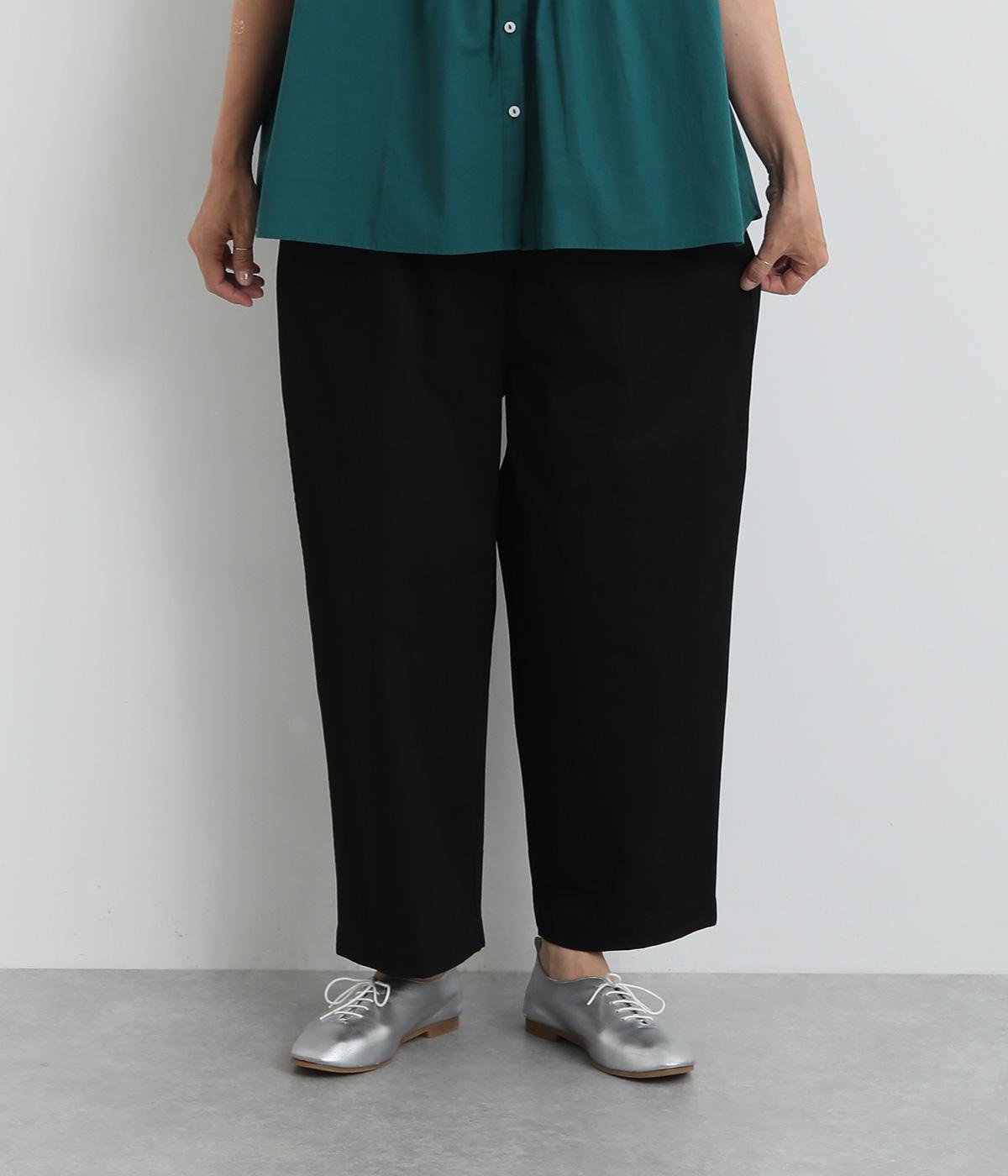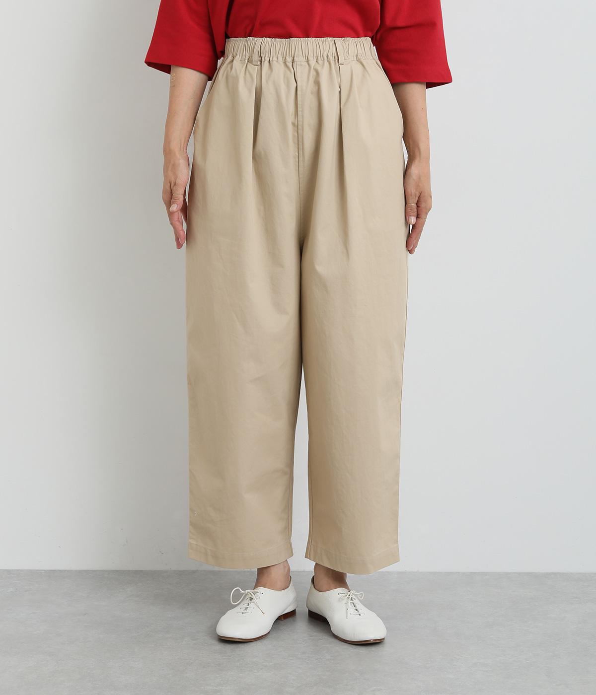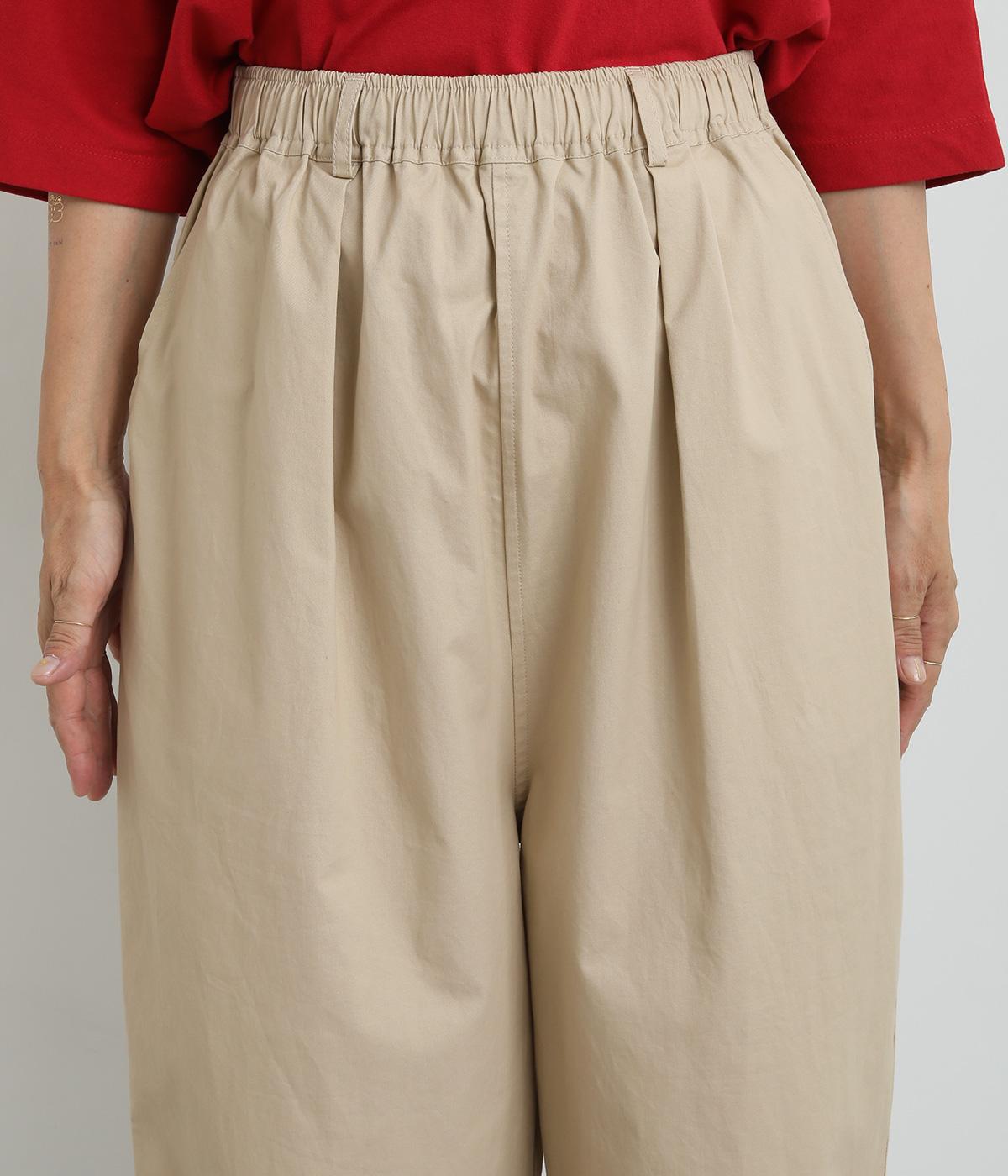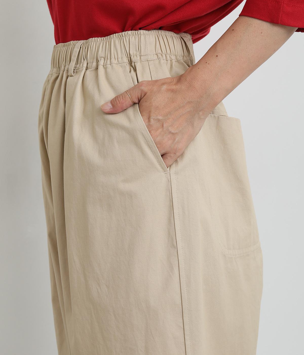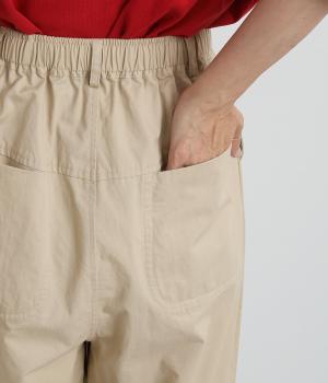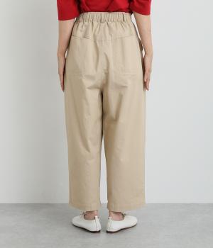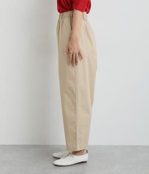 フロントにタックを入れて、腰まわりからヒップにかけてゆったりとさせたテーパードラインが特徴。はき心地のよさとすっきり見えを両方叶えてくれます。背面の切り替えラインに沿うカジュアルすぎないポケットもポイント。ウエストは総ゴム仕様、内側に紐を通しています。